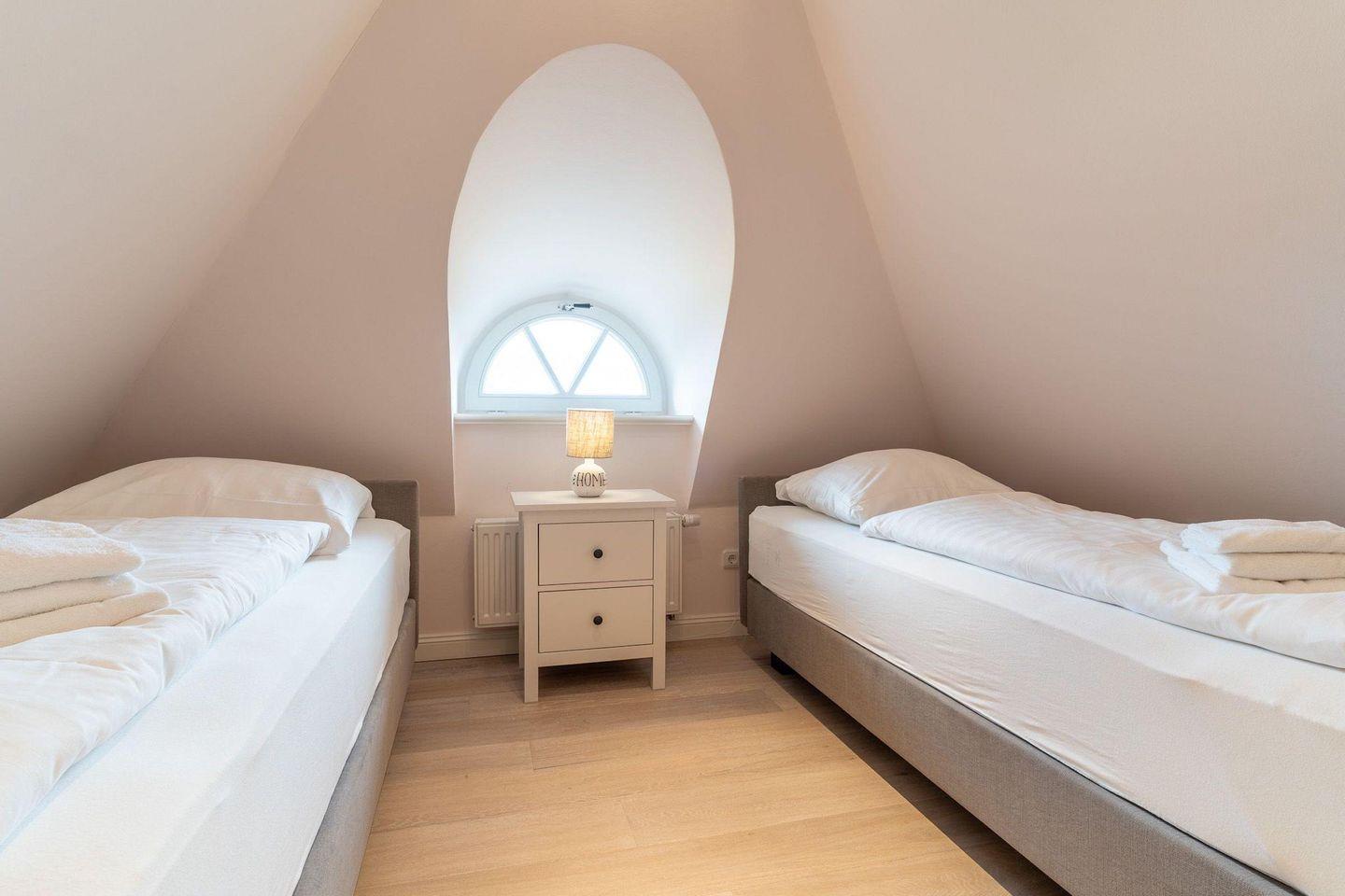 Über eine Holztreppe gelangt man in das mit Parkett ausgelegte Obergeschoss. Die beiden Schlafzimmer, eines mit einem Doppelboxspringbett und ein weiteres mit 2 Einzelboxspringbetten sorgen für ruhevolle Erholung. Einbauschränke gewähren Ihnen hinreichend Ablageflächen. Darüber hinaus befindet sich im Obergeschoss ein weiteres, geräumiges Bad mit Dusche und Badewanne. Dieses wunderschöne Haus lässt keine Wünsche offen und bringt Sie sofort in Urlaubsstimmung.