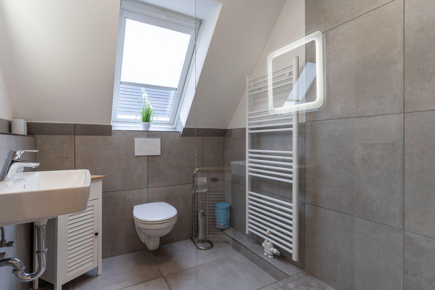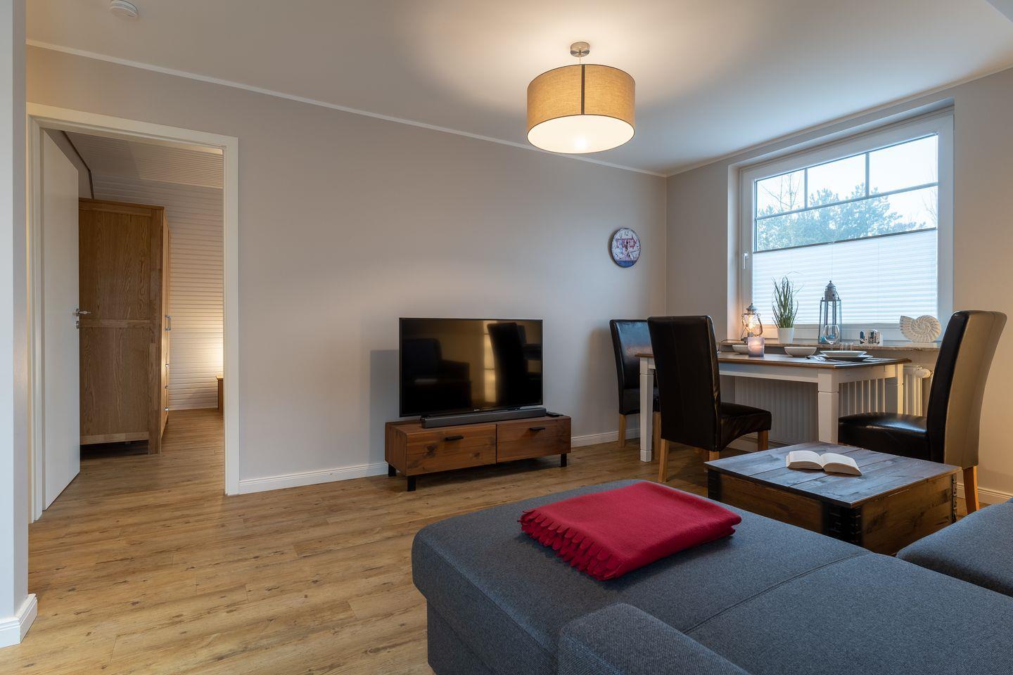 Das App. "Bad" im Ferienhaus Rückenwind verfügt über ca. 45 m² Wohnfläche und bietet Platz für 1-3 Personen. Die Wohnung befindet sich im Obergeschoss mit einem großzügige Wohnraum mit TV und einer modernen Wohnküche. Die Wohnräume sind mit neuen und modernen Möbeln ausgestattet. An den Wohnbereich schließen sich ein Duschbad, sowie ein Schlafzimmer mit einem Doppelbett (1,80 x 2,00 m) an. Zusätzlich gibt es im Wohnzimmer ein gemütliches Schlafsofa (1,40 x 2,00 m) für eine Personen. Vom Wohnzimmer gelangen Sie auf eine großzügige Dachterrasse. Hier können Sie wunderbar entspannen und die Seele baumeln lassen.