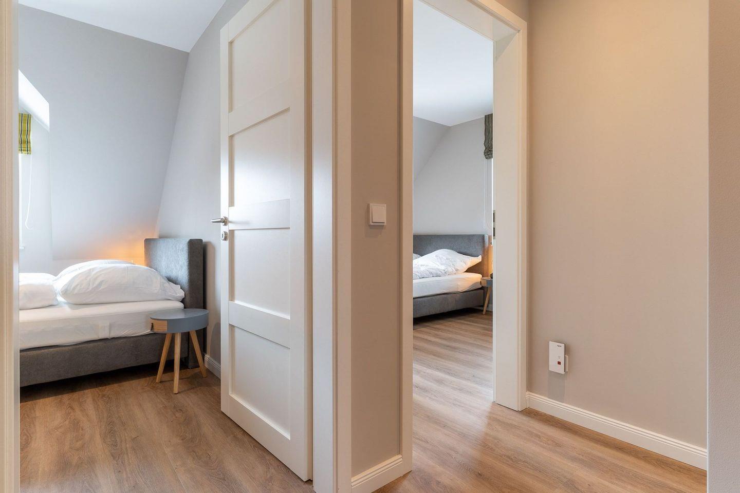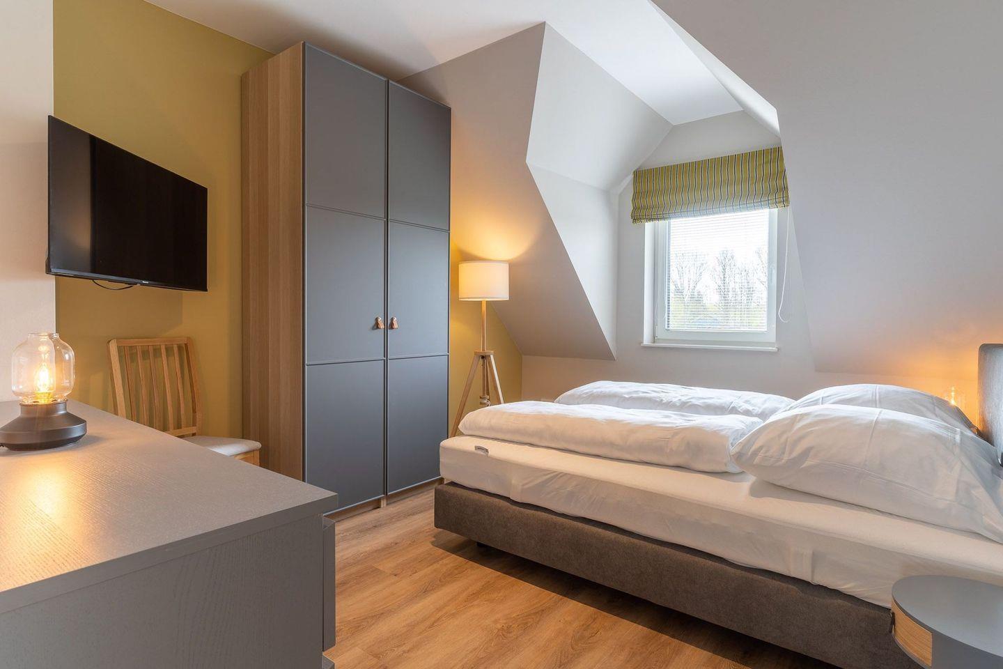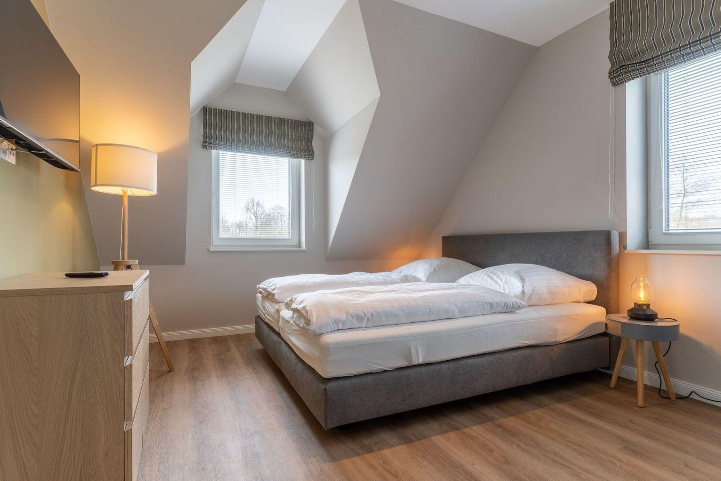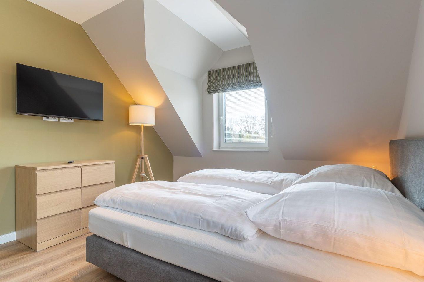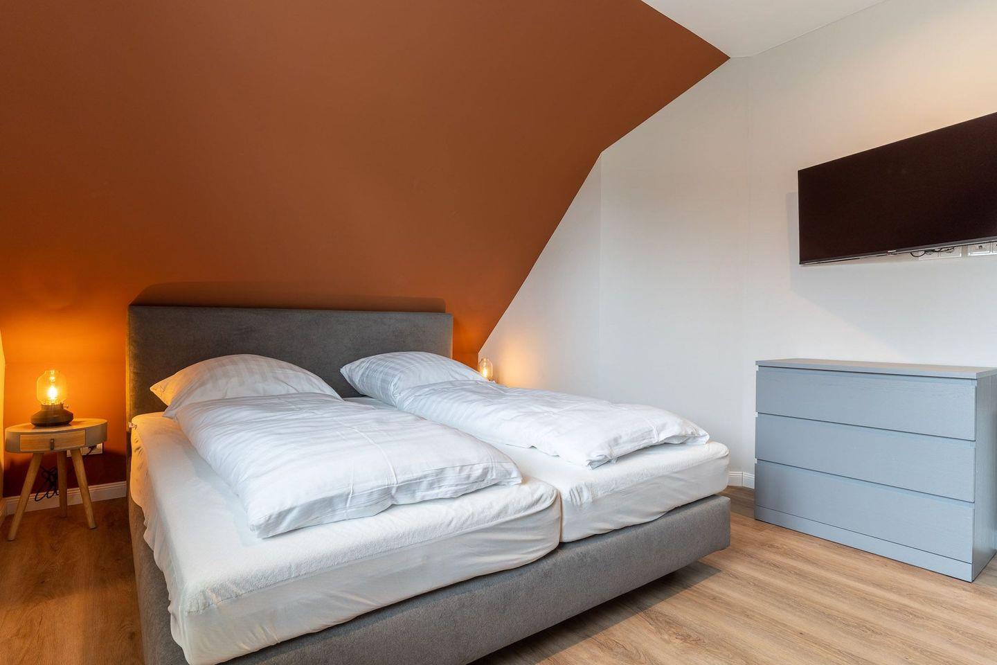 Drei Schlafzimmer mit je einem Boxspring-Doppelbett (180x200 m) sind ausgestattet mit TV und großen Kleiderschränken.