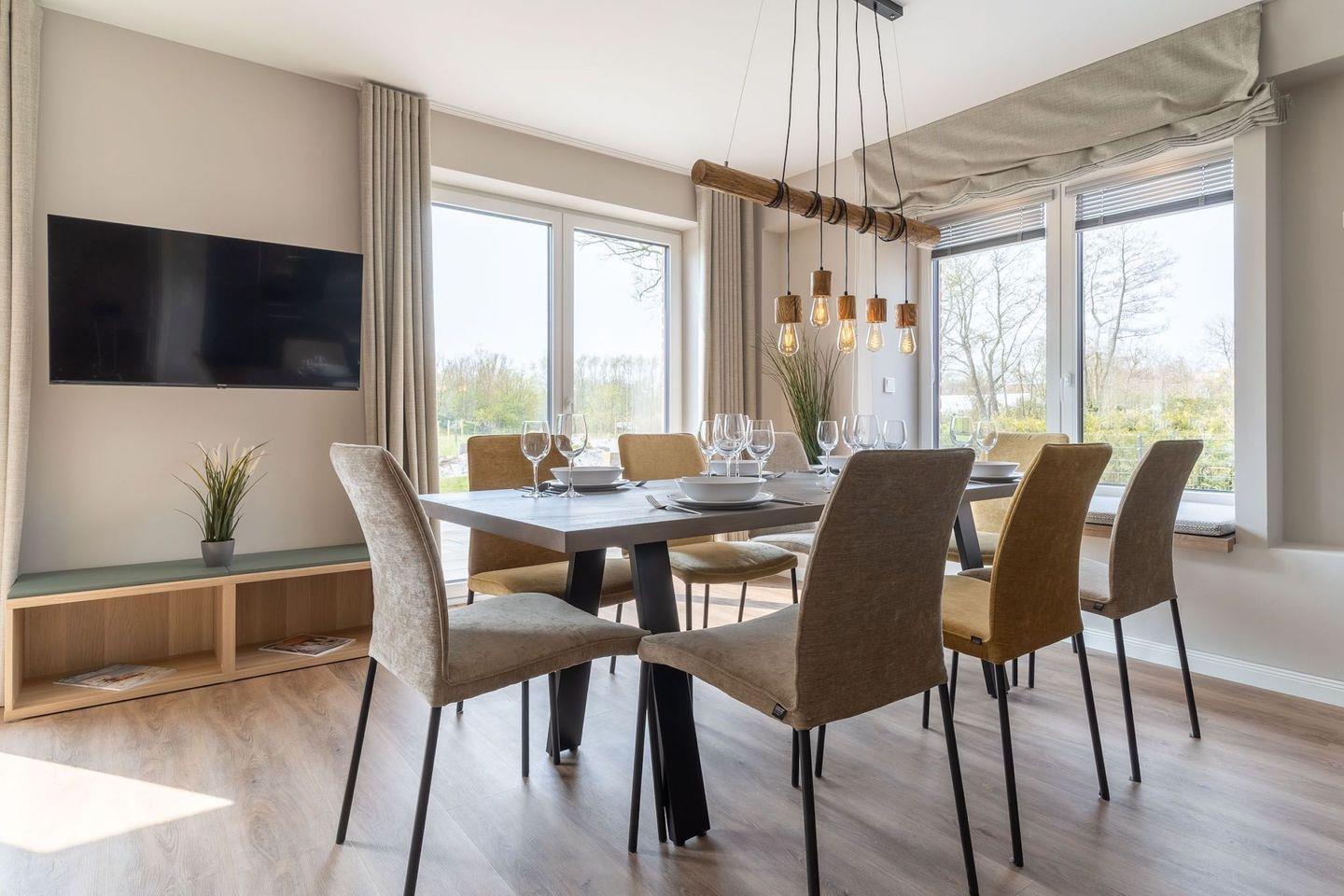 Im Erdgeschoss befindet sich der lichtdurchflutete Wohnraum mit TV, einer großen offenen Küche sowie einem stilvollen Essbereich.