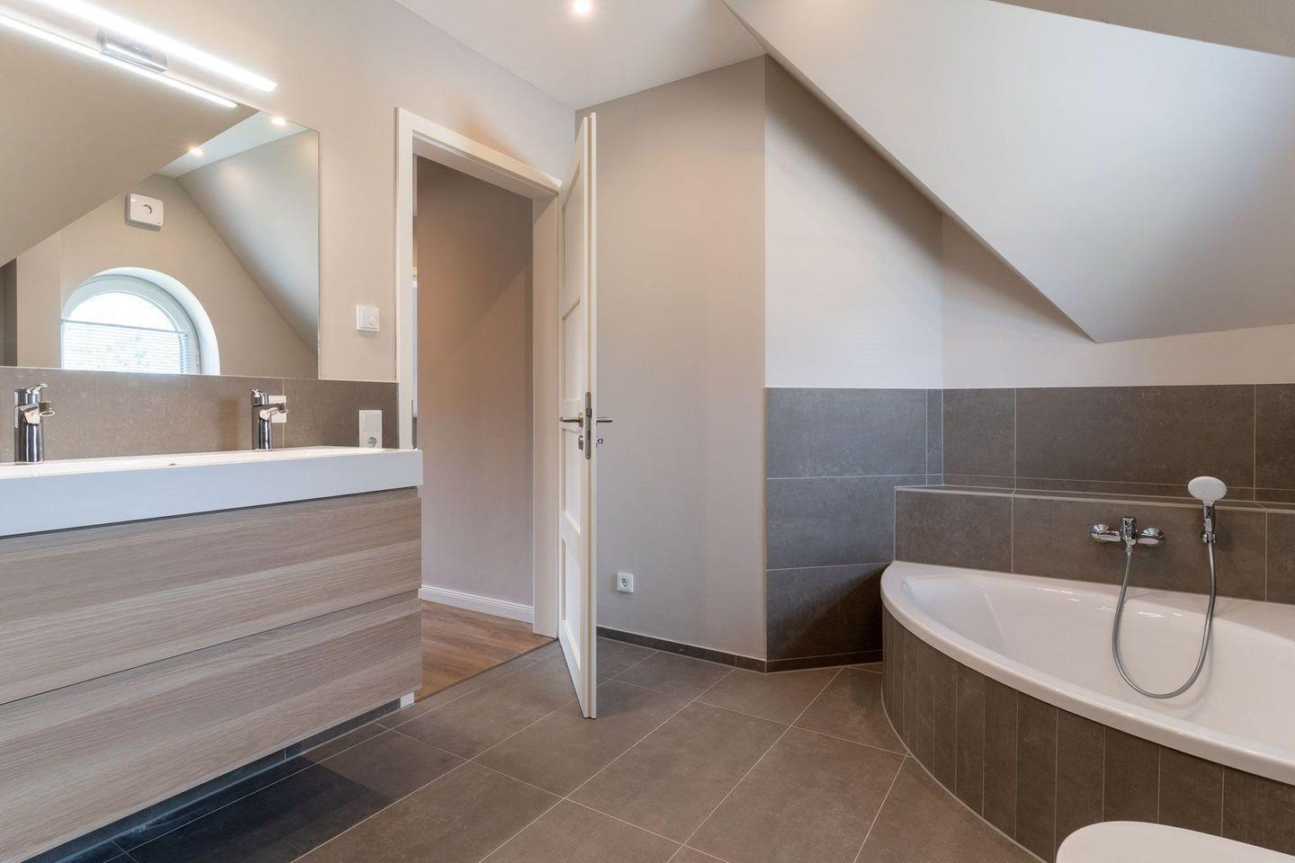 Ein zweites vollausgestattetes Badezimmer im OG, mit einer Dusche, einer Eckbadewanne und zwei einzelnen Waschbecken runden das hochwertige Hauskonzept ab und lassen keine Wünsche offen.