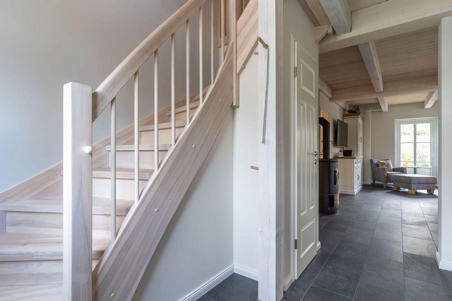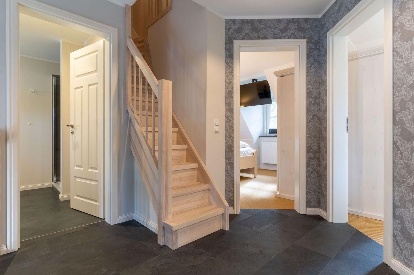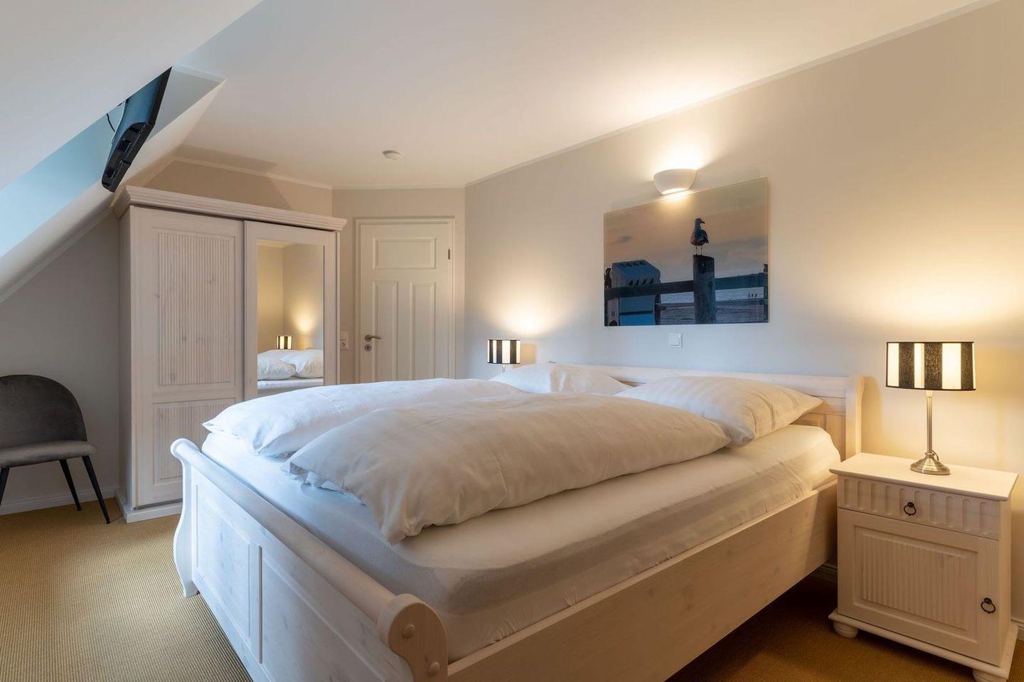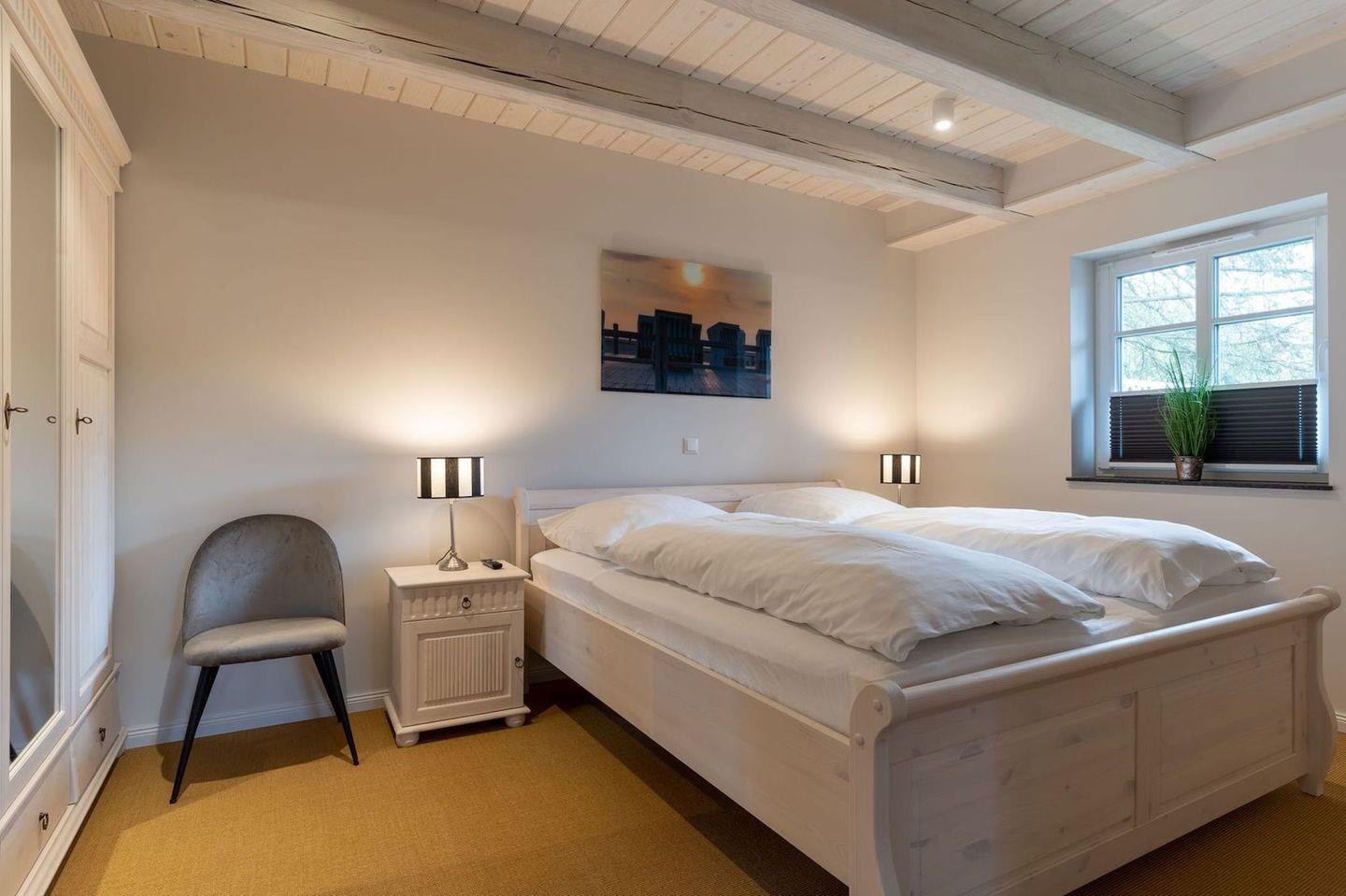 Über eine Holztreppe gelangt man in das Obergeschoss. Die beiden Schlafzimmer - jeweils mit einem Doppelbett - sorgen für ruhevolle Erholung.