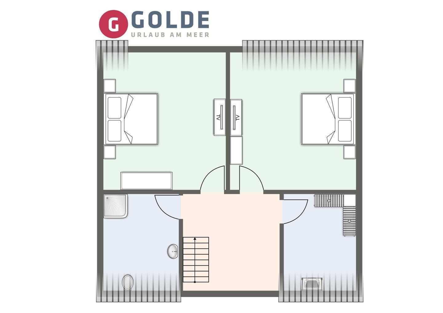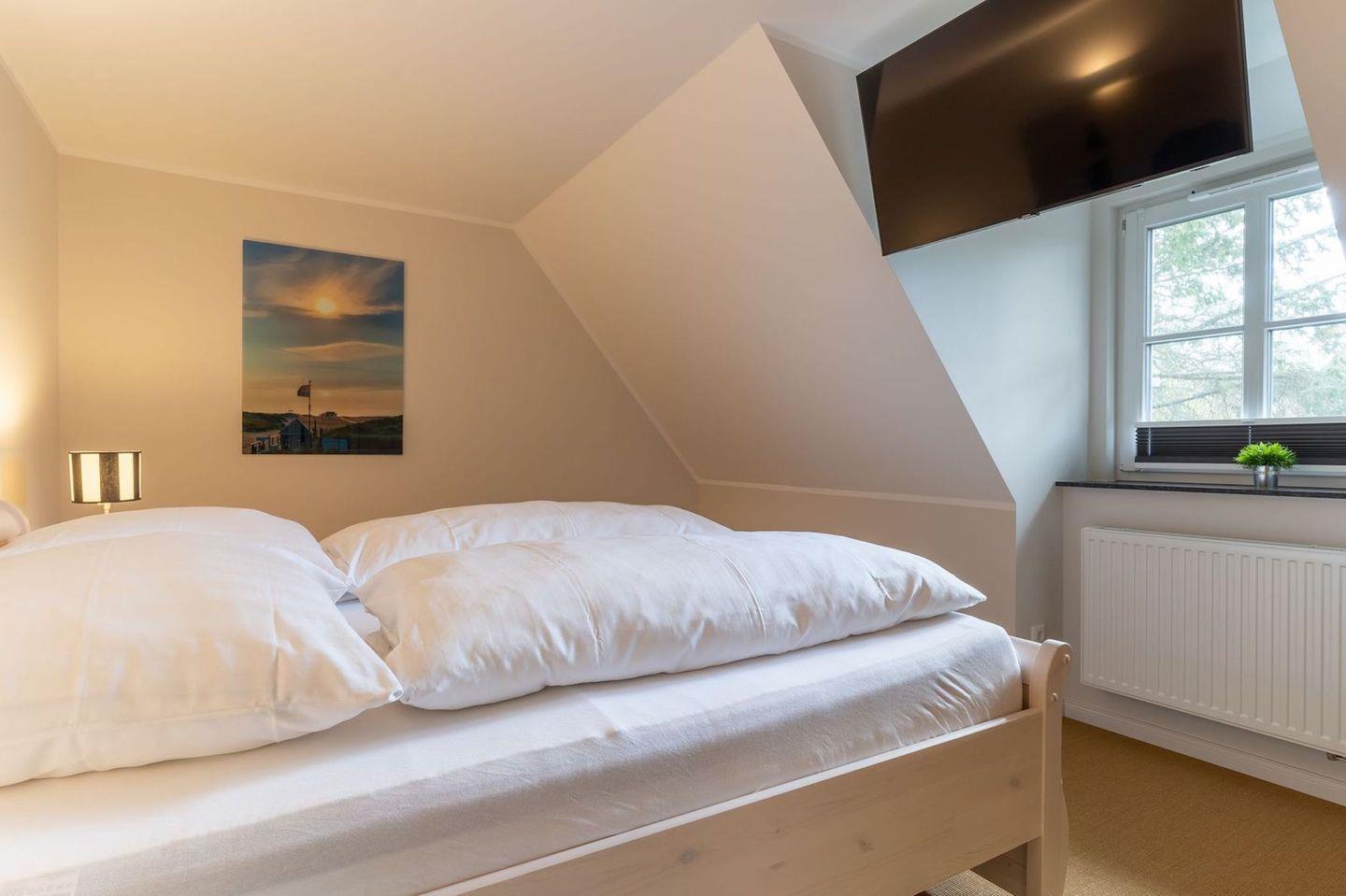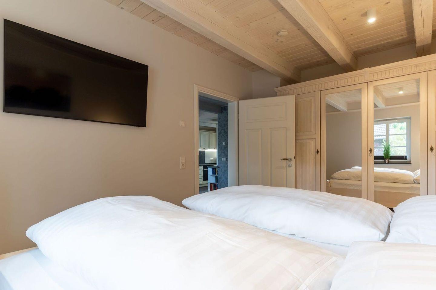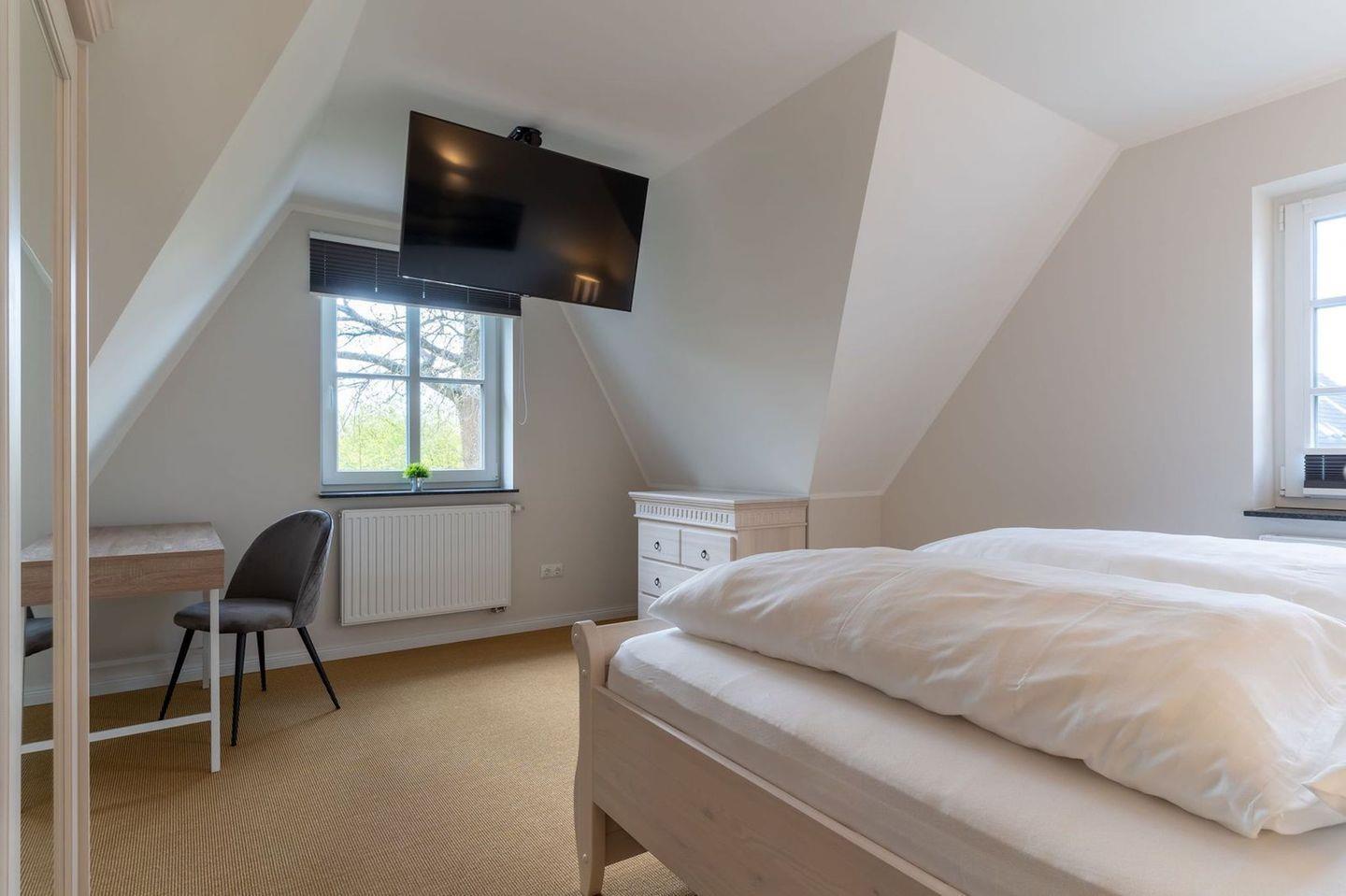 Über eine Holztreppe gelangt man in das Obergeschoss. Die beiden Schlafzimmer - jeweils mit einem Doppelbett - sorgen für ruhevolle Erholung.