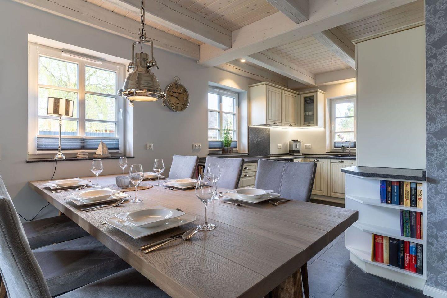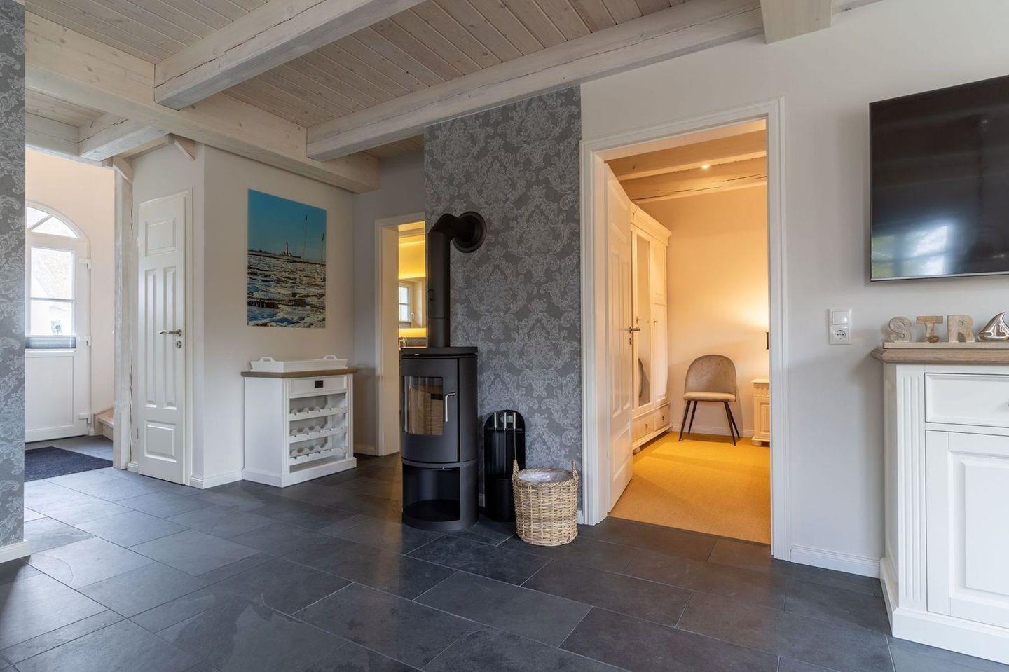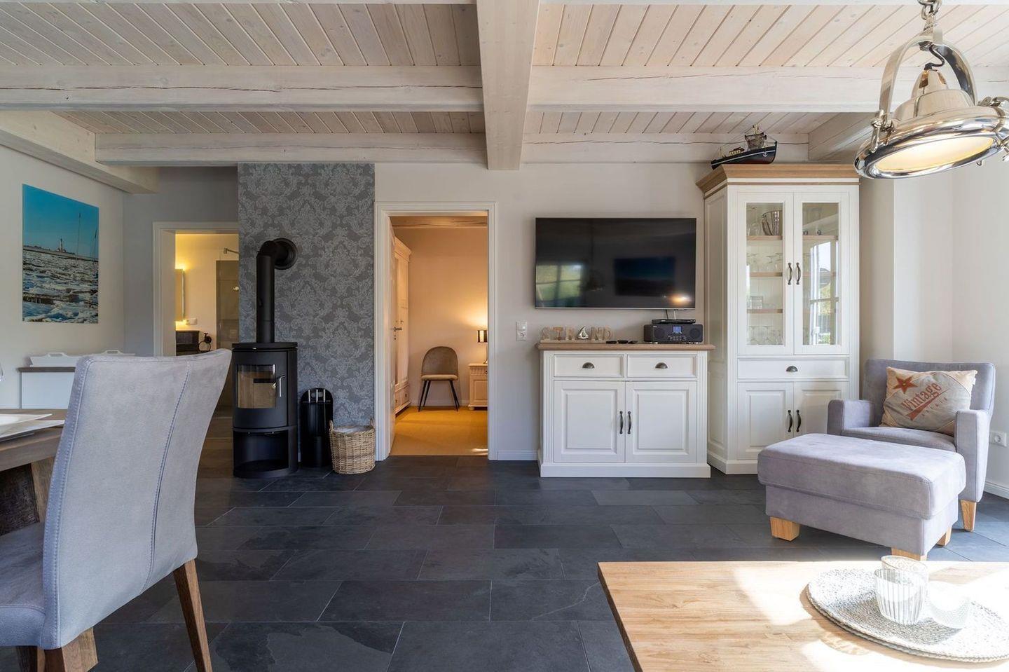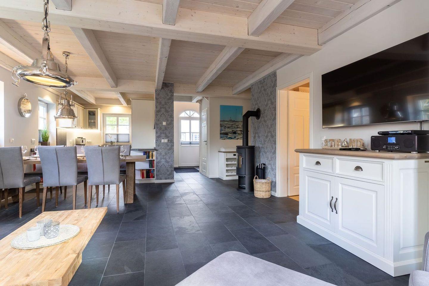 Im Erdgeschoss befindet sich der lichtdurchflutete Wohnraum mit TV, Kamin, einer offenen Küche sowie einem stilvollen Essbereich.
