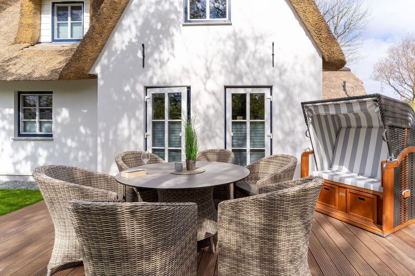 Auf der großen Terrasse steht ein Strandkorb und ein großer runder Tisch mit Gartenstühlen zur Verfügung.