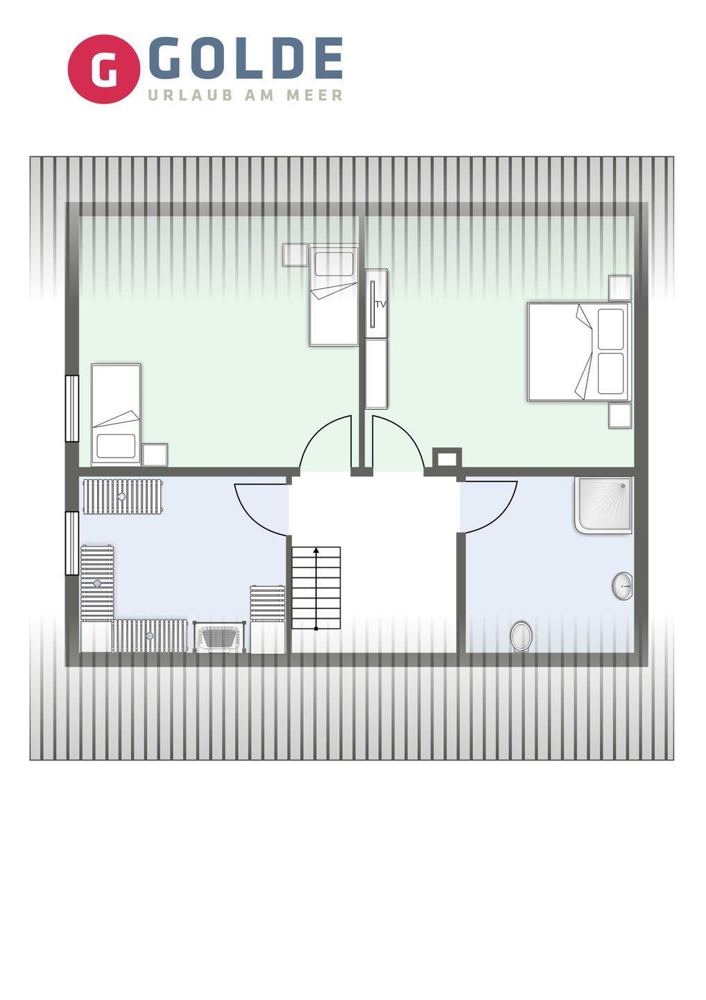 Über eine Holztreppe gelangt man in das Obergeschoss. Hier befinden sich ein Schlafzimmer mit einem Doppelbett und ein Schlafzimmer mit 2 Einzelbetten.