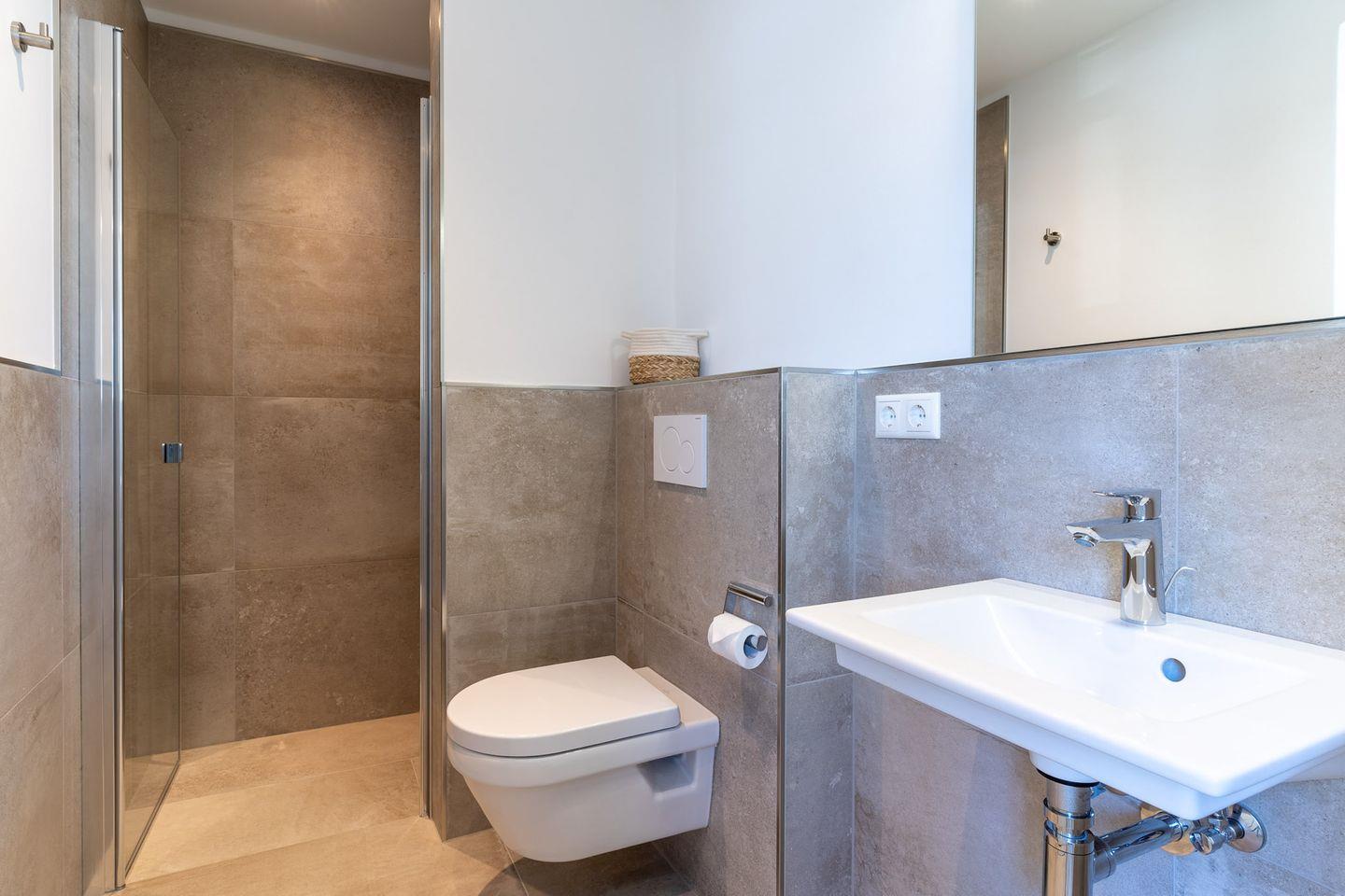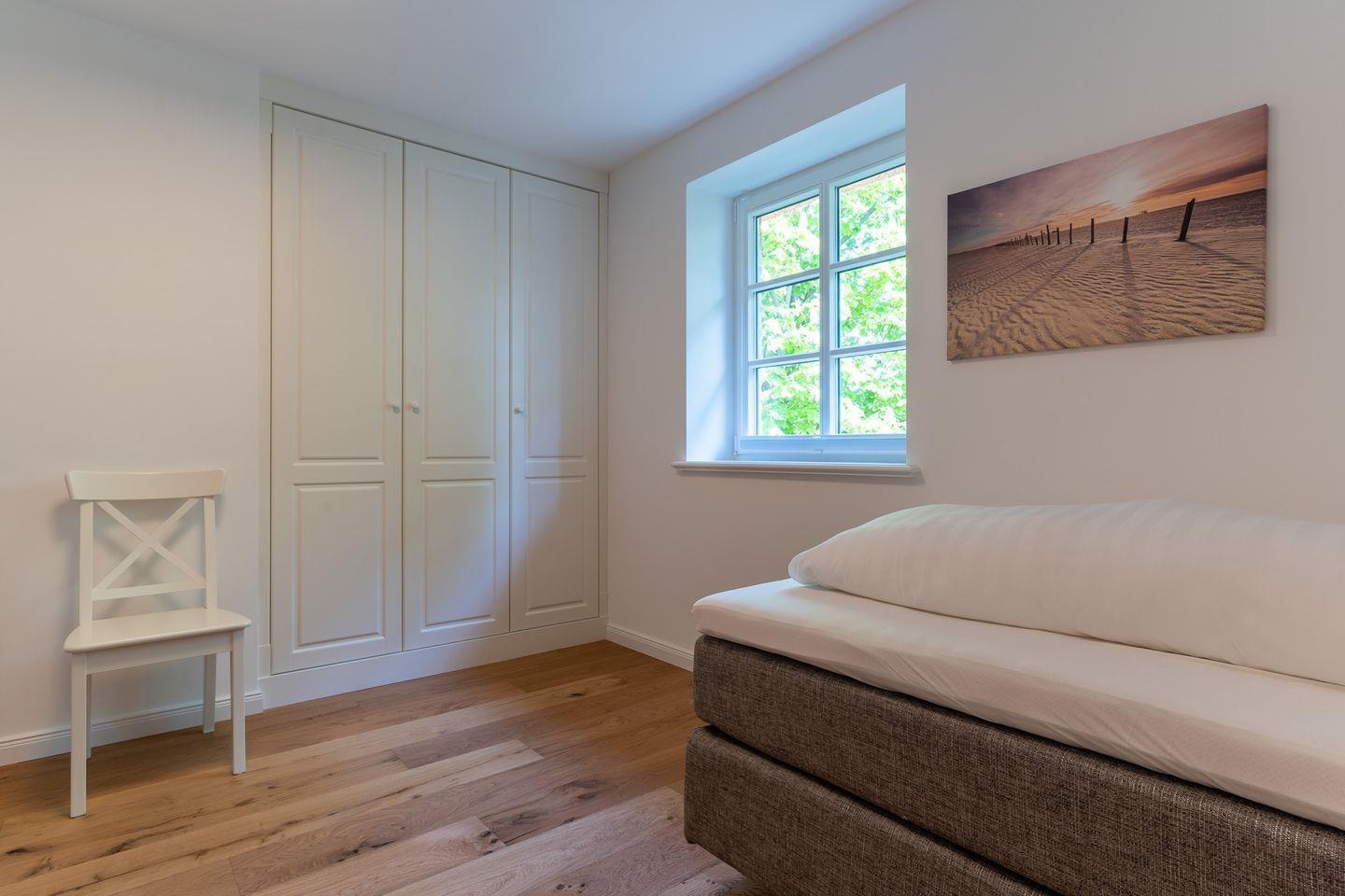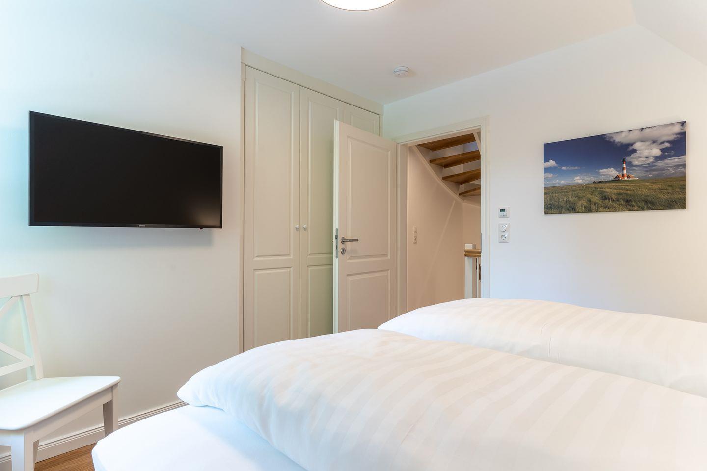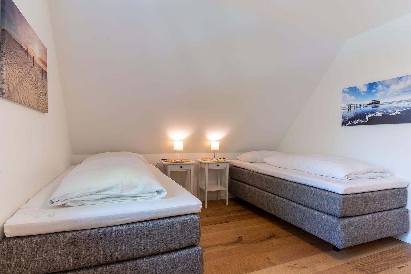 Im ersten Obergeschoss bieten zwei komfortabel ausgestattete Schlafzimmer ruhevolle Erholung. Ein Zimmer verfügt über ein Boxpring-Doppelbett mit TV, das andere über zwei Boxspring-Einzelbetten. Große Einbauschränke bieten ausreichend Ablagefläche. Für eine angenehme Auszeit sorgt das Badezimmer mit großer Wellness-Dusche und Kneippschlauch.