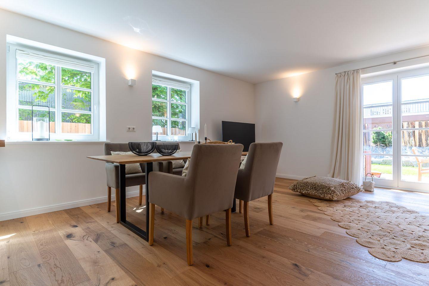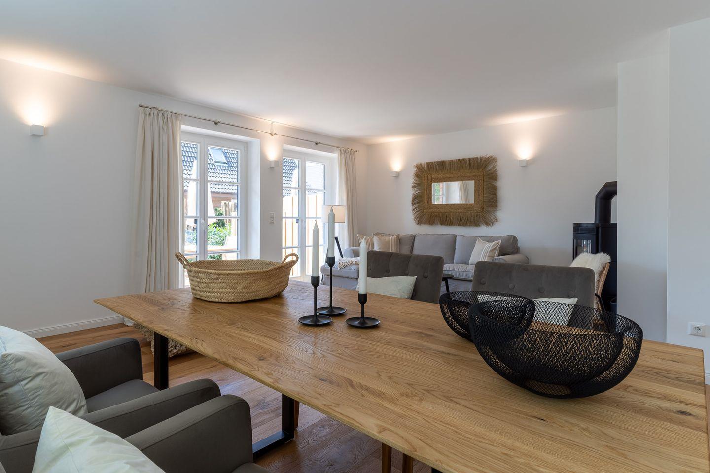 Im Erdgeschoss befindet sich ein großer, lichtdurchfluteter Wohnraum mit gemütlichem Essbereich, einer offenen Küche und Kaminofen.