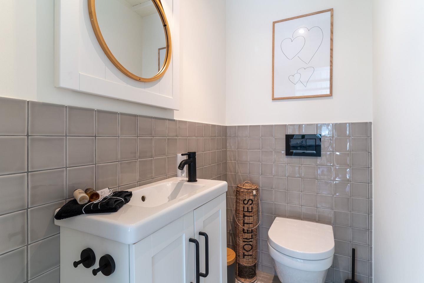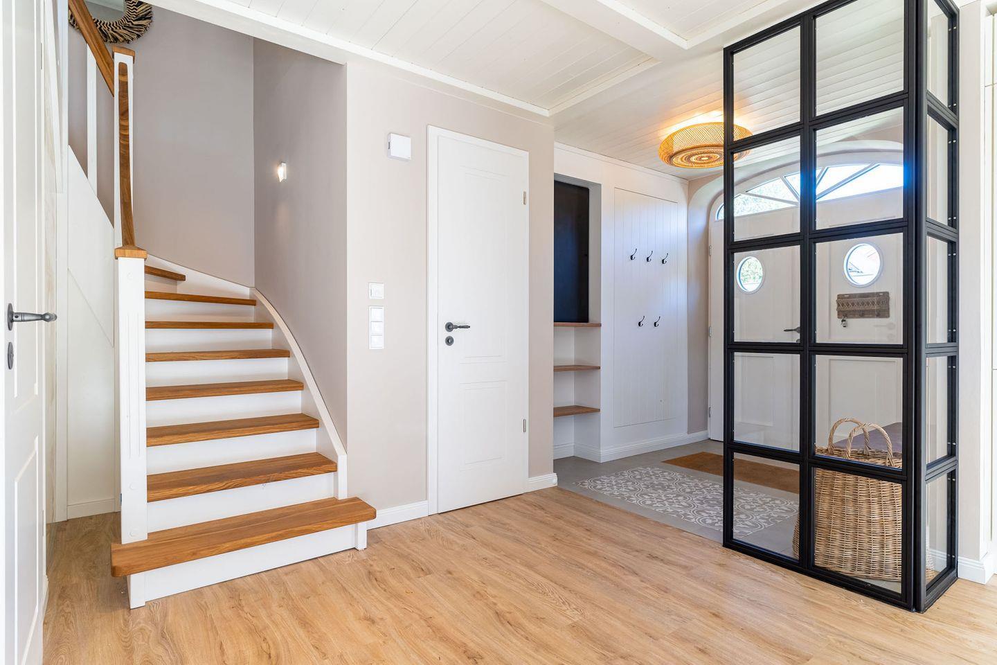 Im Erdgeschoss erwartet Sie ein loftartiges Gefühl, denn das lichtdurchflutete Wohnzimmer, die offene Küche sowie das wunderschöne Esszimmer mit luxuriösen Möbeln gehen alle ineinander über. Die Küche verfügt über hochwertige Elektrogeräte und genügend Platz zum gemeinsamen Kochen. Der Flur bietet ausreichend Stauraum für Schuhe, Jacken und Schirme. Ebenfalls im Erdgeschoss befindet sich ein kleiner Abstellraum mit Waschmaschine und Trockner sowie ein kleines Gäste-WC.