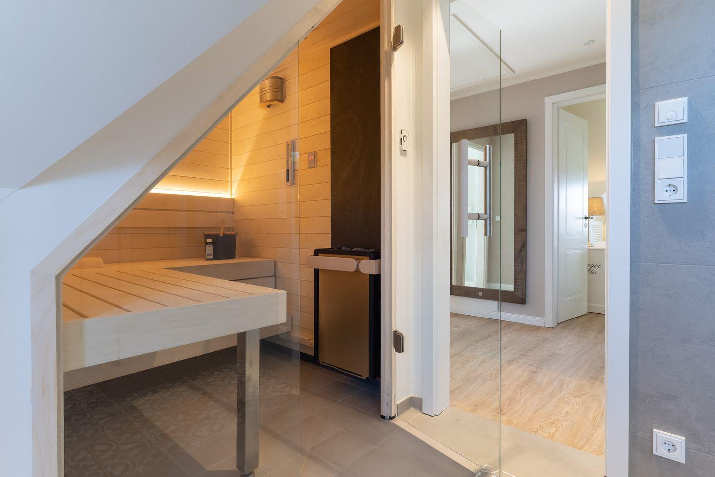 Das vollausgestattete Badezimmer im OG, hat eine Dusche, ein WC und einen großzügigen Doppelwaschtisch. Ein Highlight ist die integrierte Sauna, die das hochwertige Hauskonzept abrundet und keine Wünsche offen lässt.
