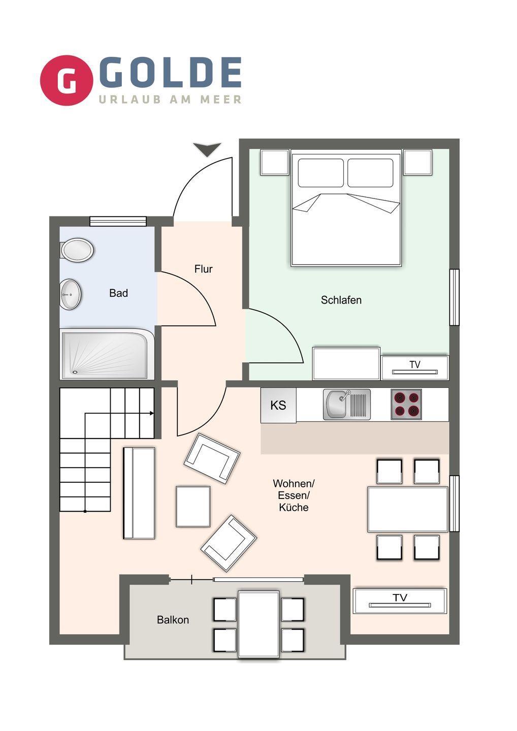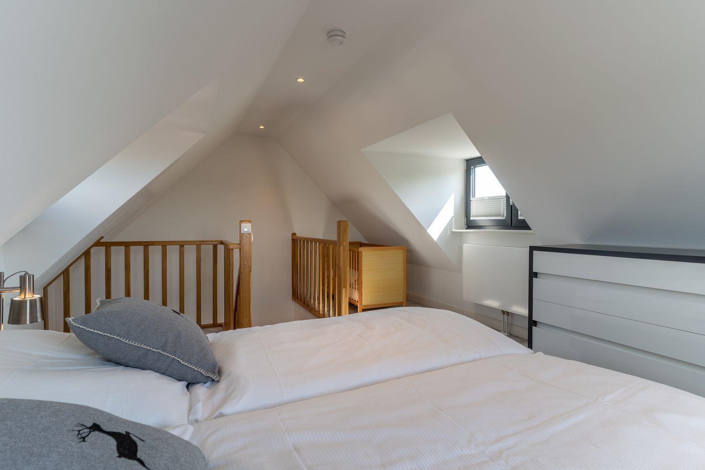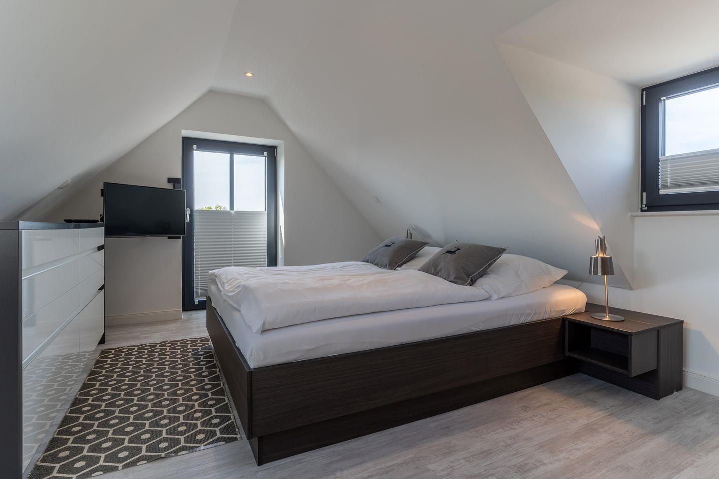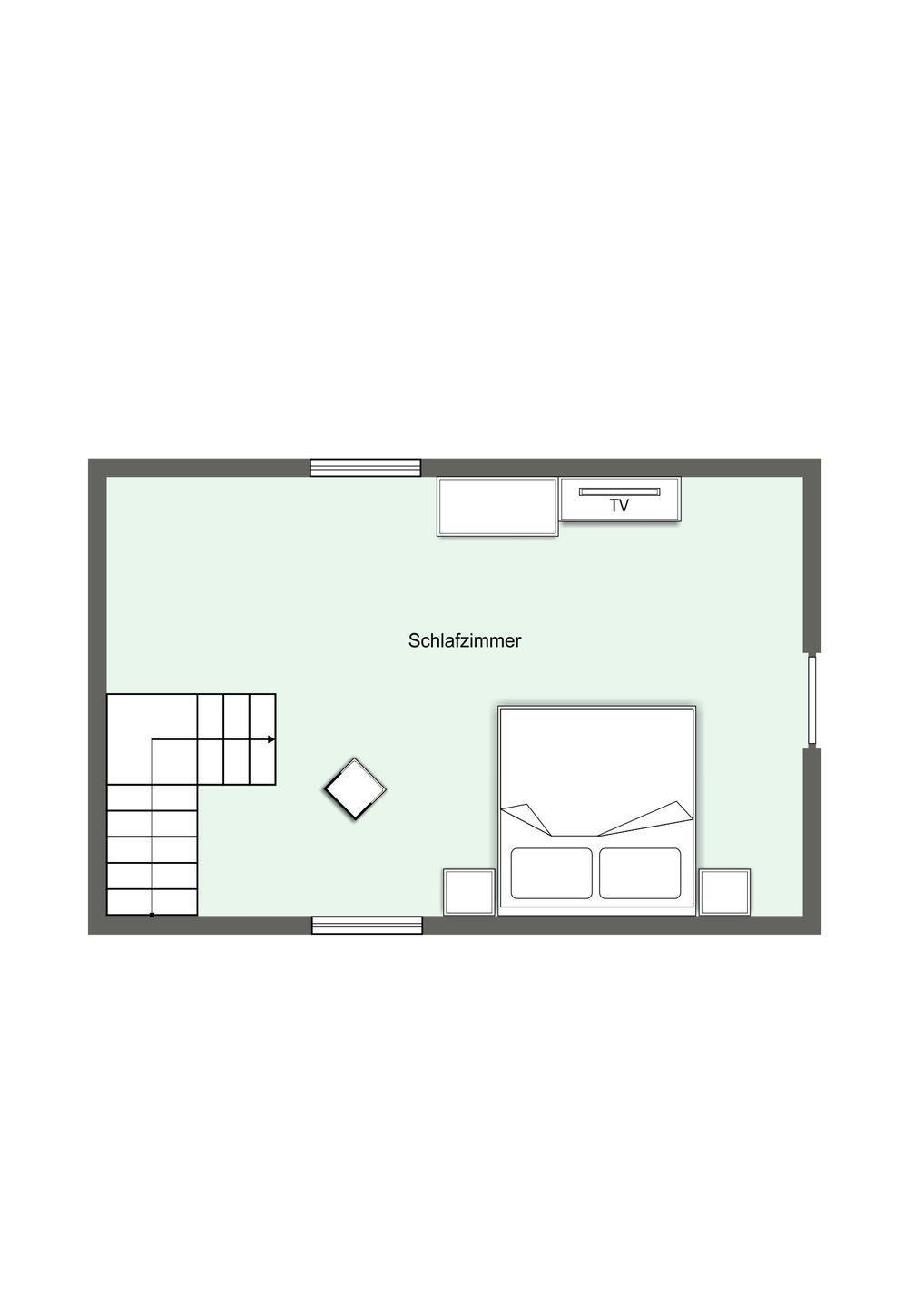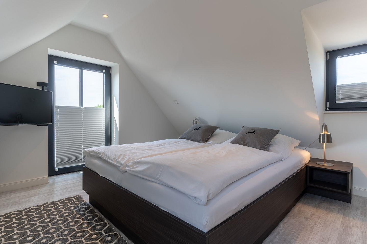 Ein weiteres Schlafzimmer mit einem 160er Doppelbett und LCD-Flach-TV ist über eine Treppe vom Wohnraum zu erreichen.