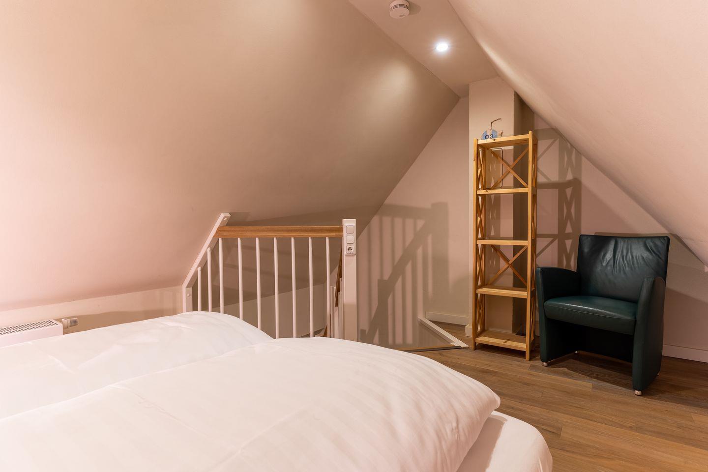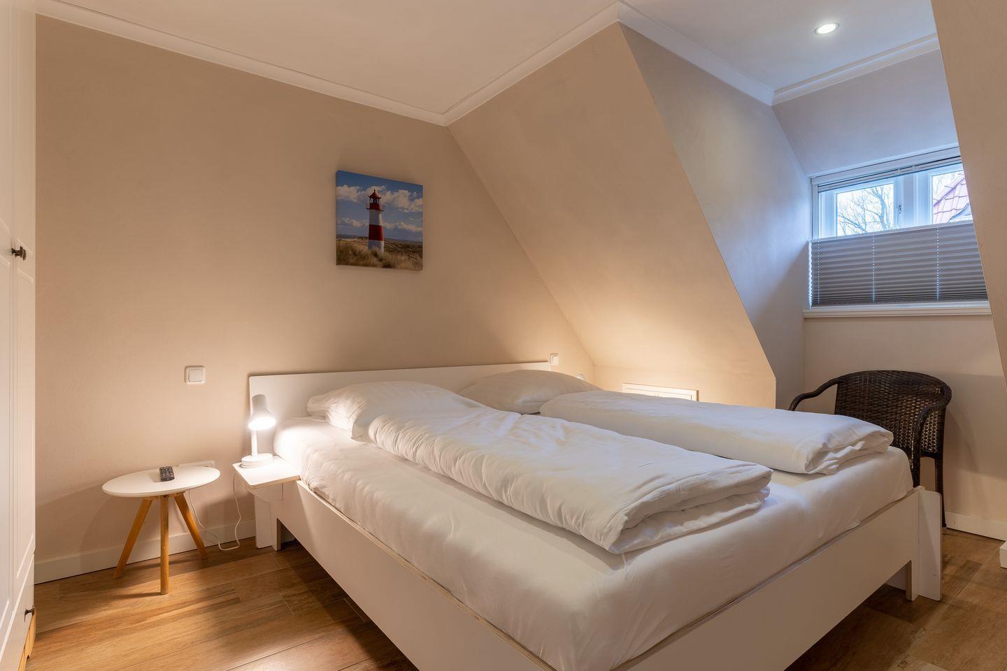 Über eine weitere Holztreppe geht es vom Flur ins Dachgeschoss mit einem gemütlichen 160er Doppelbett.