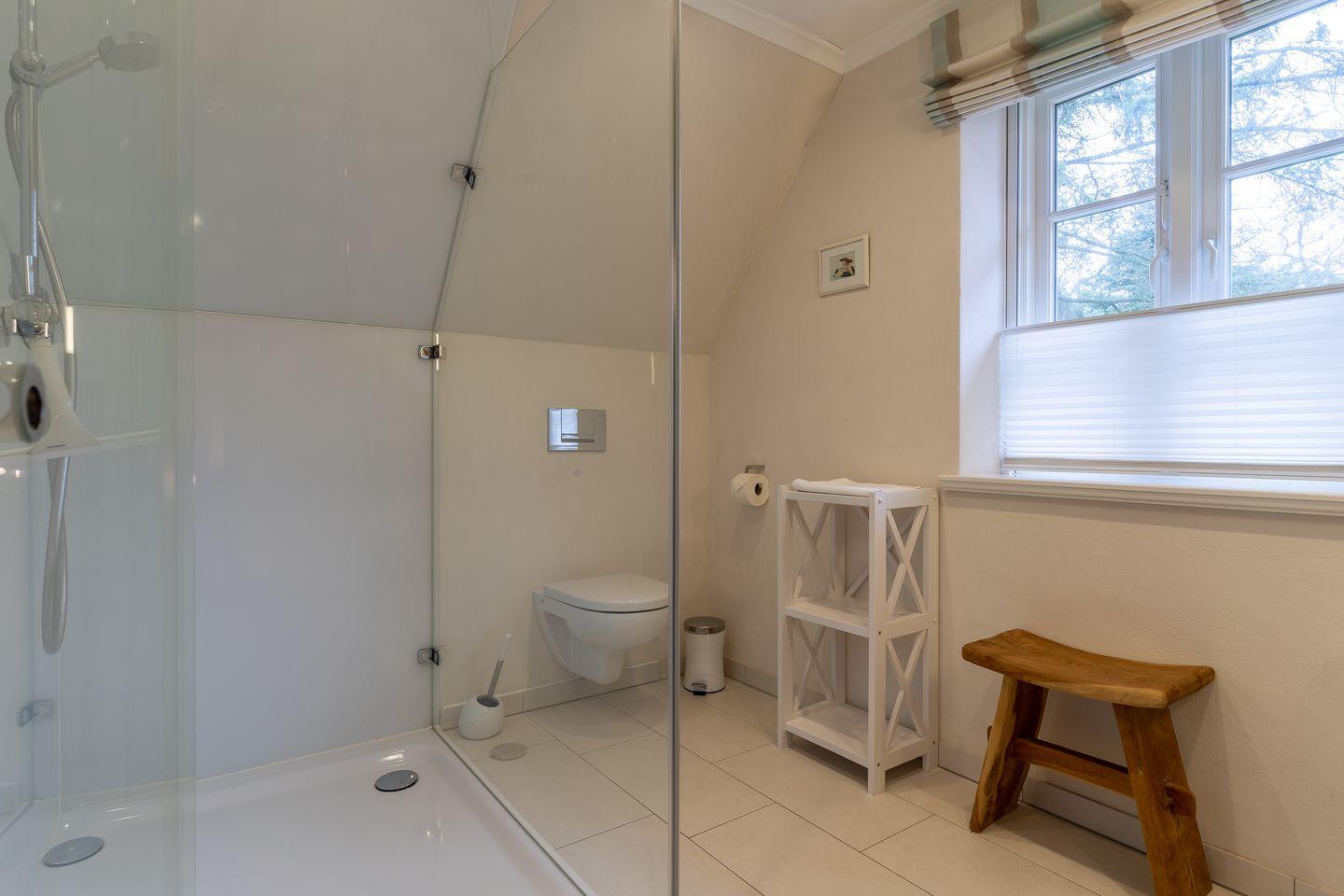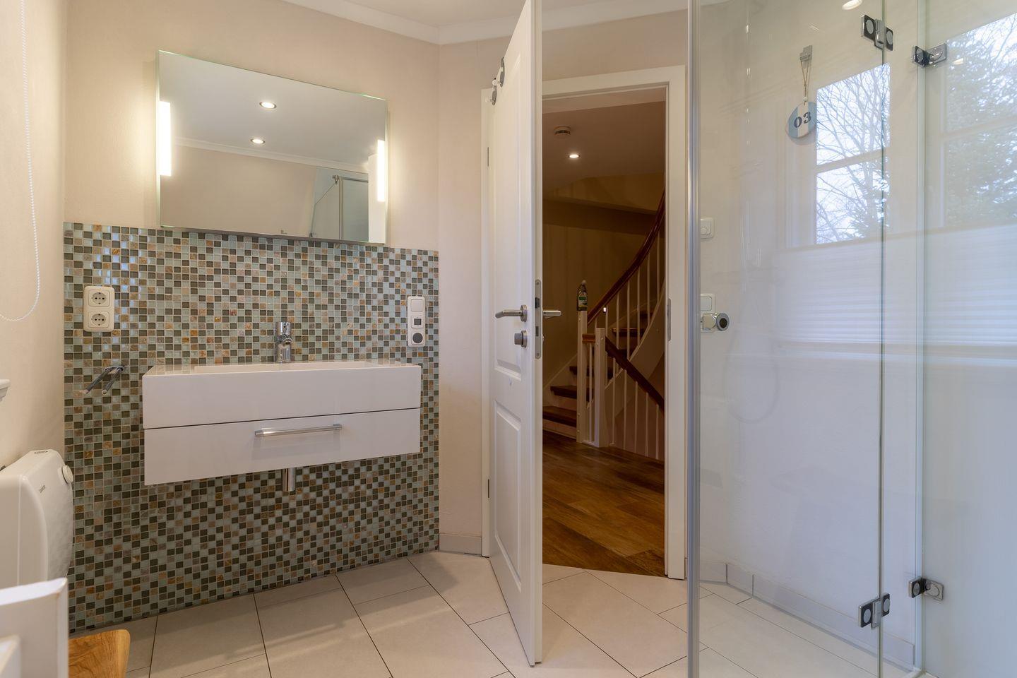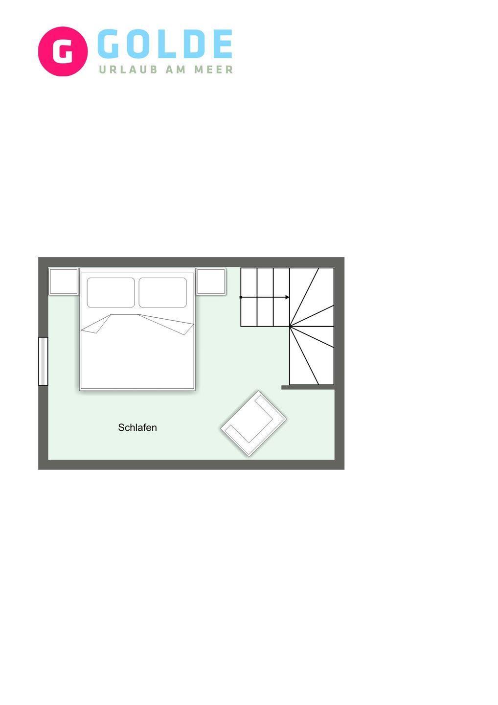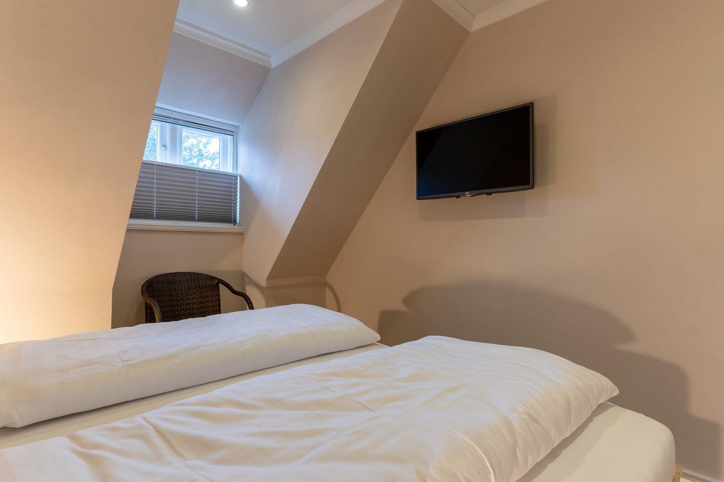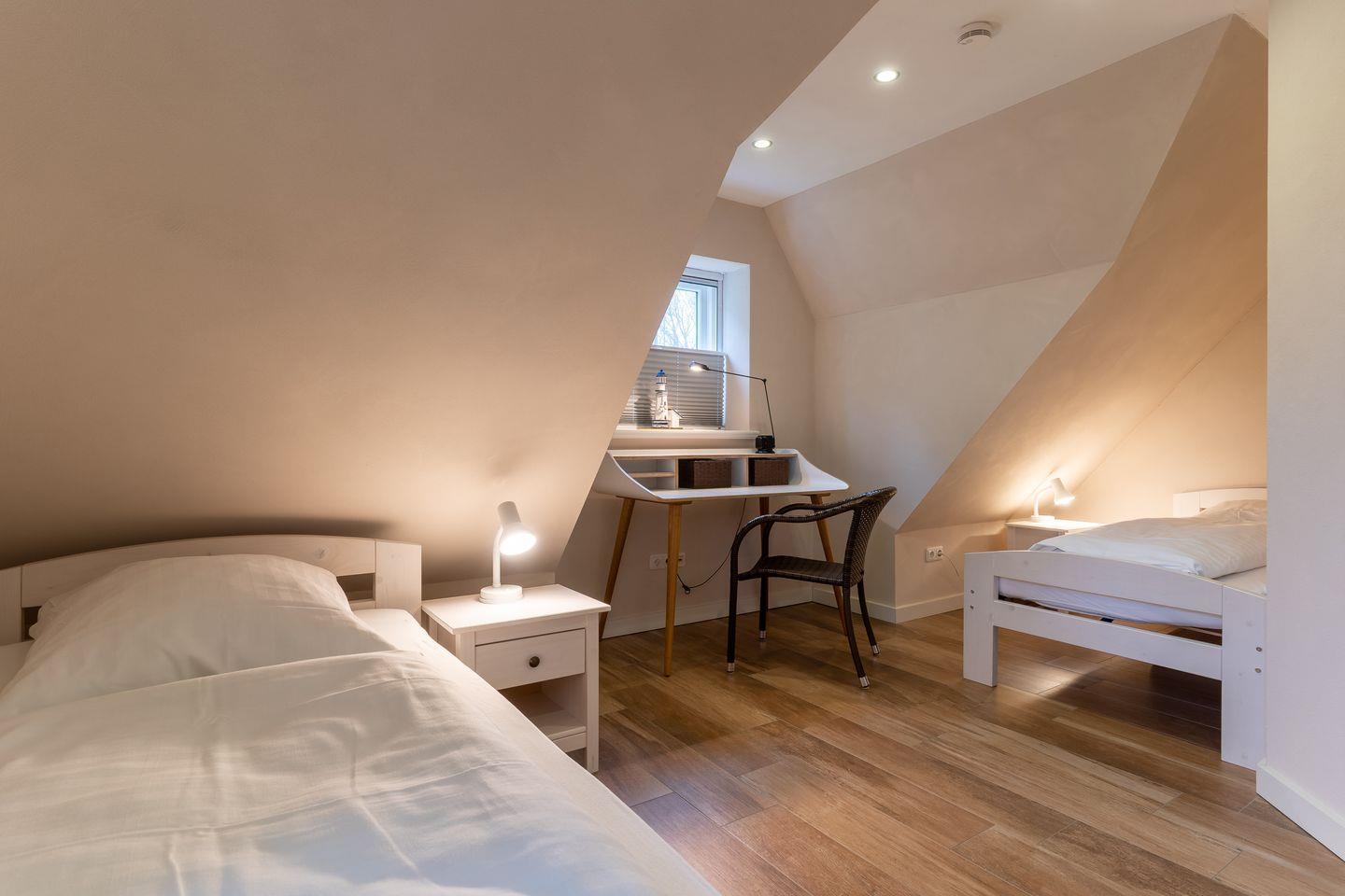 Über eine Holztreppe gelangt man in das Obergeschoss mit zwei Schlafzimmern. Eines mit einem 180er Doppelbett und TV und das Anderes mit 2x 90er Einzelbetten. Außerdem ist im OG ein modernes Duschbad.