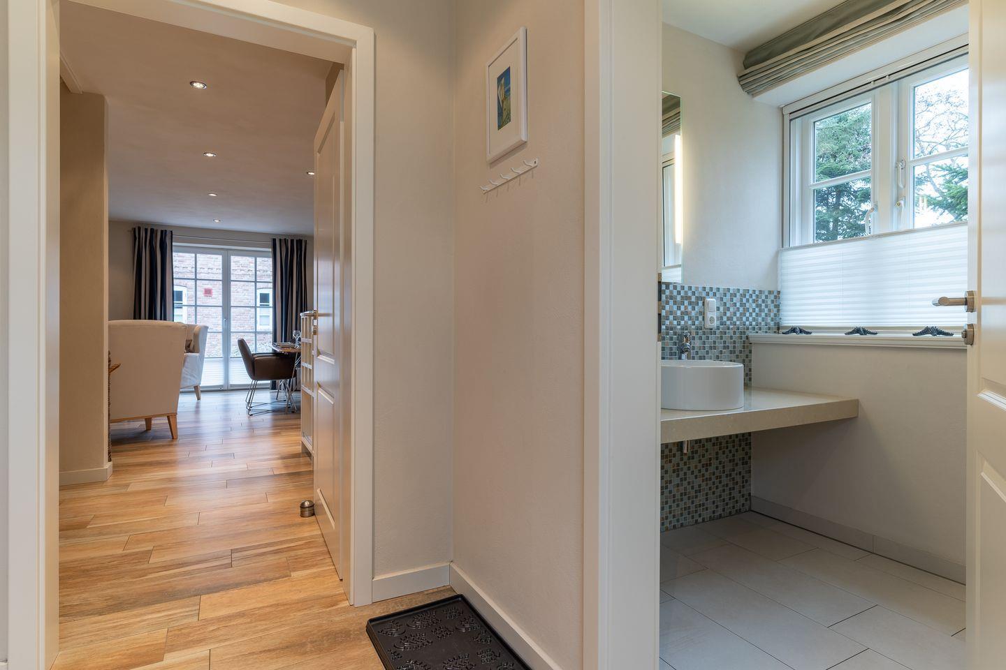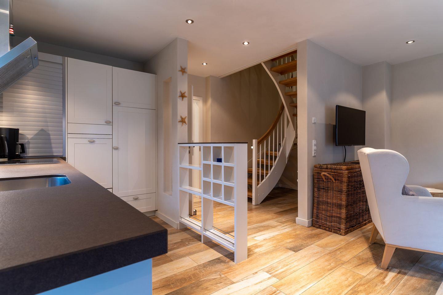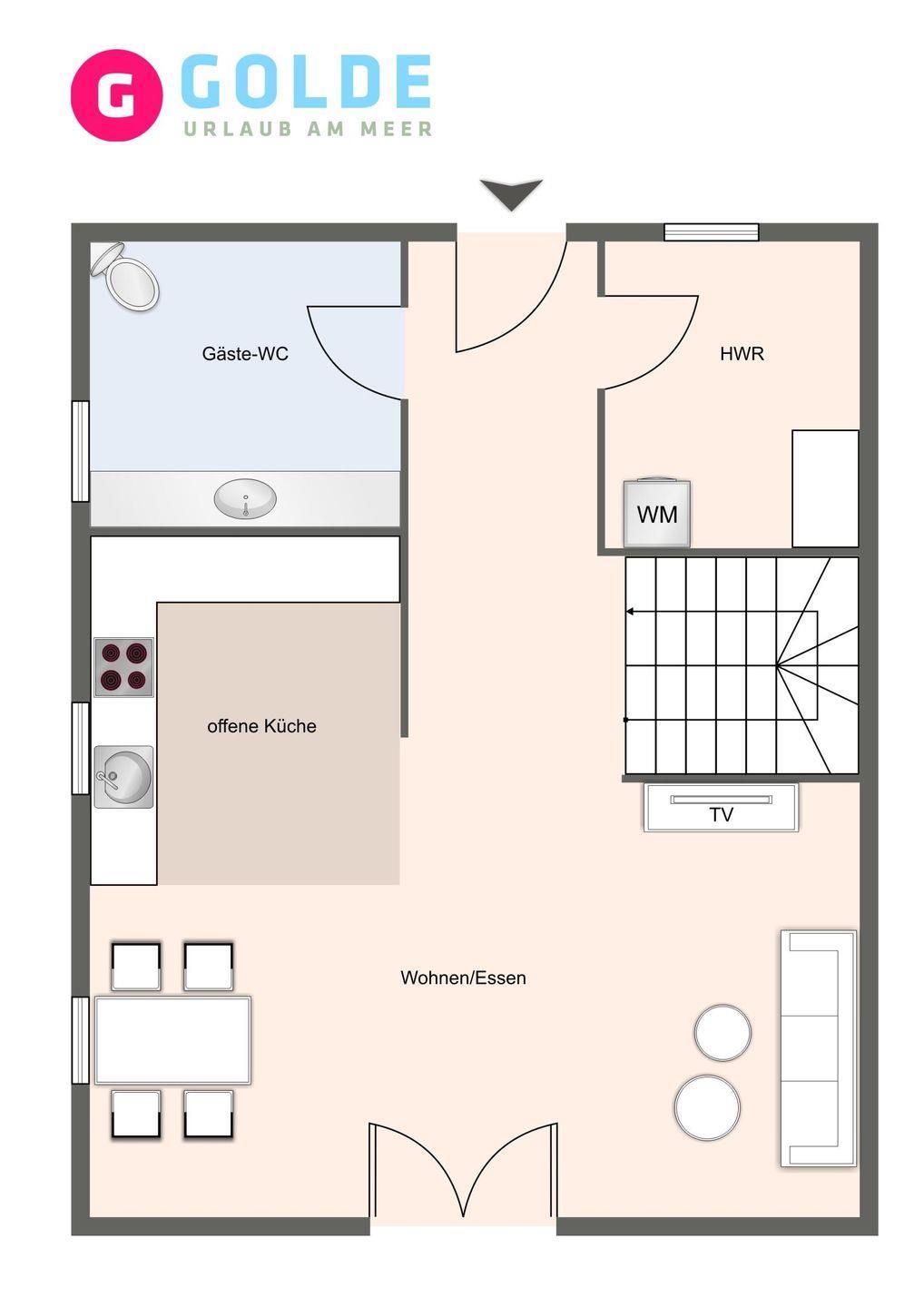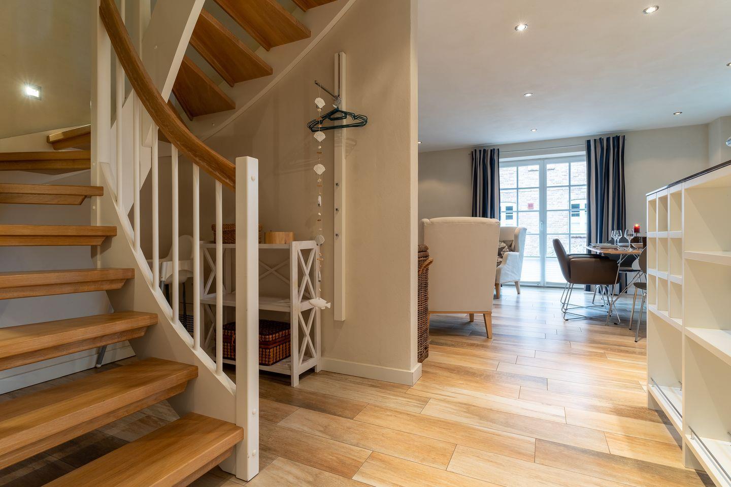 Im Erdgeschoss befindet sich der Wohnraum mit einer offenen Küche und einem gemütlichen Essbereich. Die Küche ist mit hochwertigen Geräten voll ausgestattet. Im Erdgeschoss ist ebenso ein Flur mit eingebauter Garderobe und ein Gäste WC.