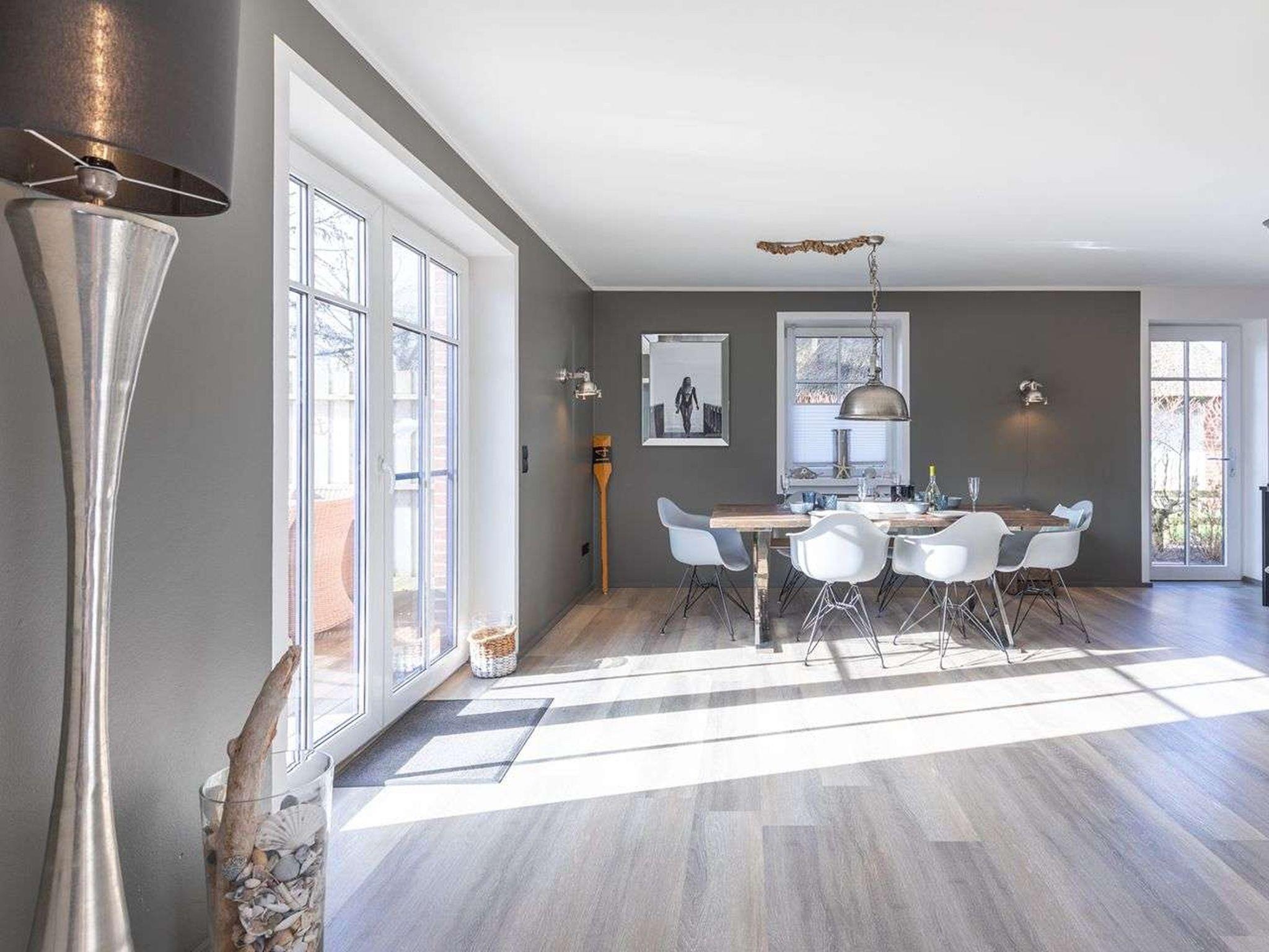 "Seequartier - Nordsee Ferienhaus Tating", 4-room house 110 m2 on 2 levels. Very modern and stylish furnishings: open large living/dining room with satellite TV (flat screen). Exit to the terrace. Large, open kitchen (4 hot plates, oven, dishwasher, toaster, kettle, electric coffee machine) with dining table. Shower/WC. Upper floor: 1 room with Dressing room with 1 double bed (1 x 180 cm, length 200 cm), shower/WC. 2 rooms, each room with 1 double bed (1 x 160 cm, length 200 cm). Wooden floors. Terrace furniture, barbecue. Facilities: washing machine, iron. Internet (WiFi). Parking (3 cars).