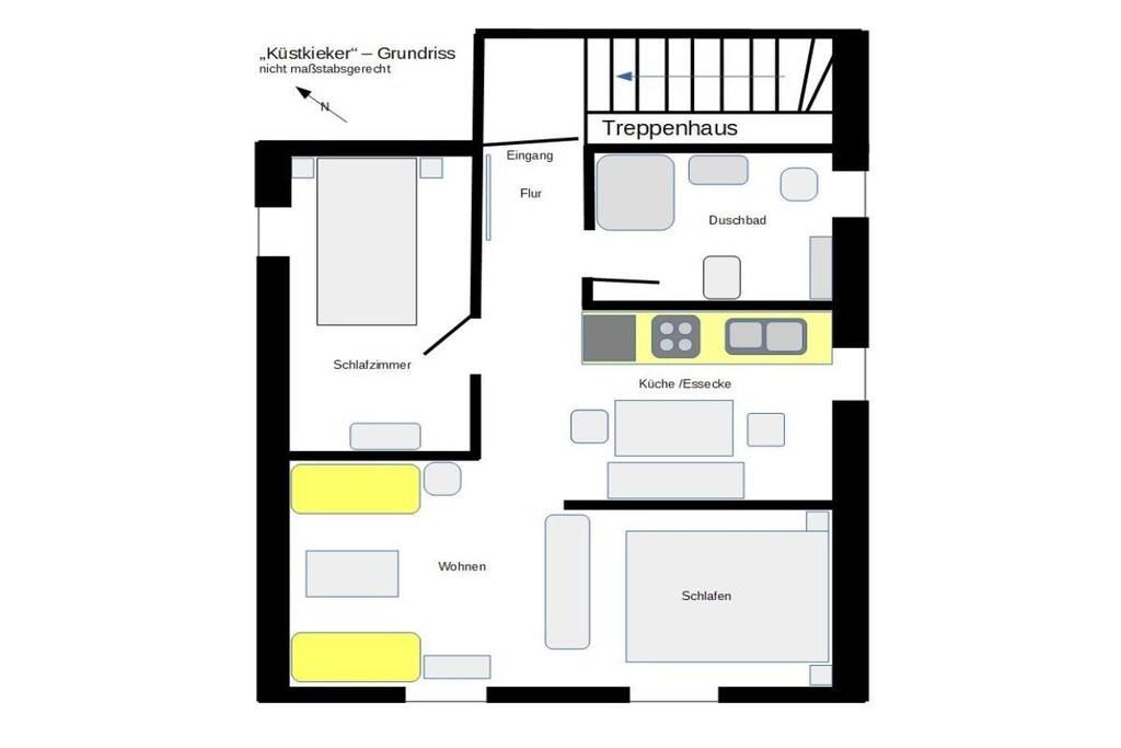 Im maritimen Style eingerichtete Fewo mit Dachloggia, ca.45 qm, Südwestlage, Gartenbenutzung. Ein Kleiderschrank als Raumteiler trennt den Wohnbereich vom Schlafbereich (Doppelbett 180/200 cm). Im separaten Schlaf- bzw. Kinderzimmer steht ein Doppelbett (140/200 cm). SAT-TV mit DVD. Kinderspielecke mit Velo-Spieltisch, Labyrinth, Tischflipper, Twister etc . Fenster mit Verdunkelungsrollo. Die Küchenzeile ist komplett ausgestattet: Kühlschrank mit Gefrierfach, Backofen, Herd mit Ceranfeld, Kaffeevollautomat, Kaffeemaschine, Wasserkocher, Toaster, Mikrowelle, ausreichend Geschirr, Gläser und Besteck. Duschbad mit Dachfenster, Reisefön ist vorhanden. Küche, Diele und Wohnraum sind offen gestaltet. 1 reservierter Pkw-Stellplatz. Waschmaschine gegen Gebühr in einem Gästewaschraum (2,50 Euro). Eigenes abschließbares Gartenhaus für Ihre Fahrräder. Gemeinschafts-Fahrradständer hinter dem Haus.