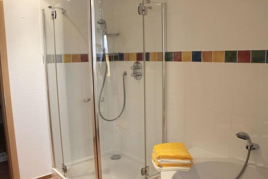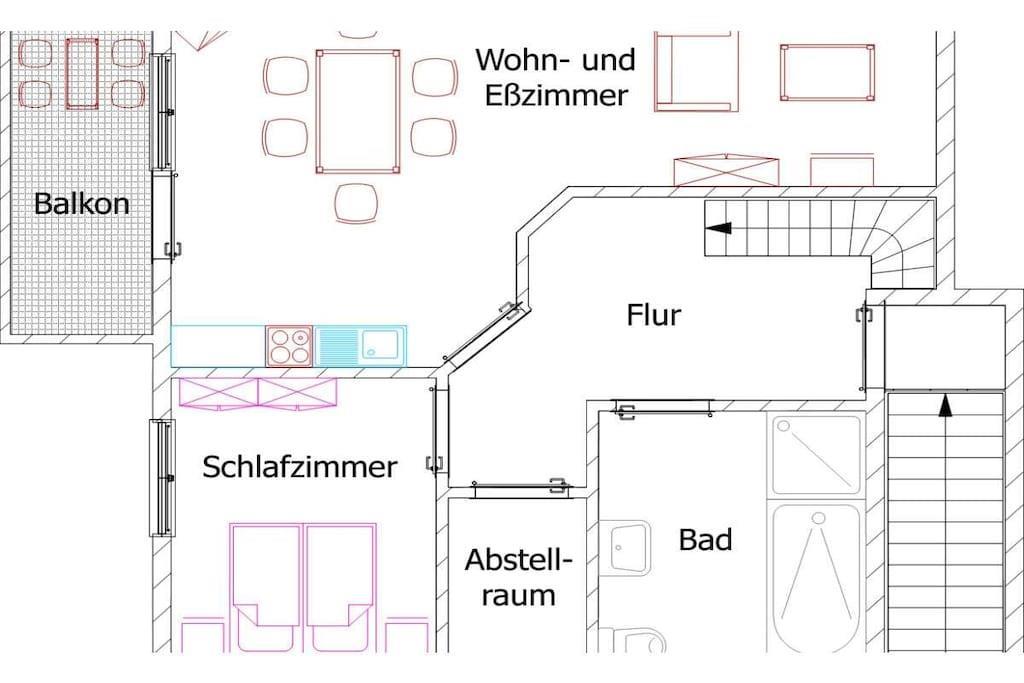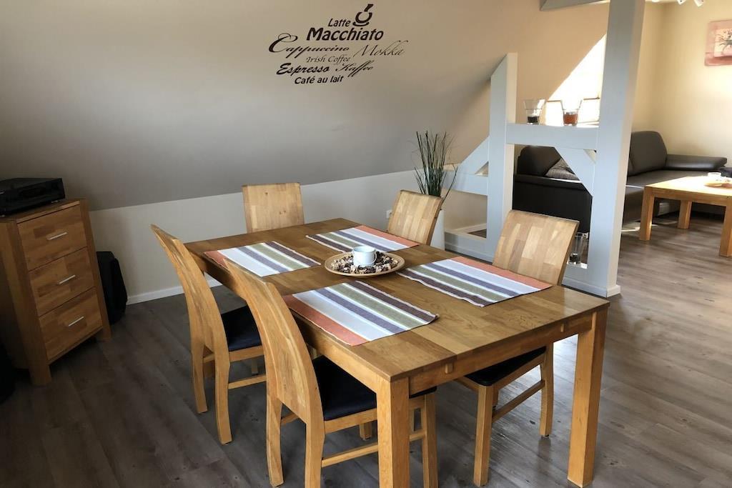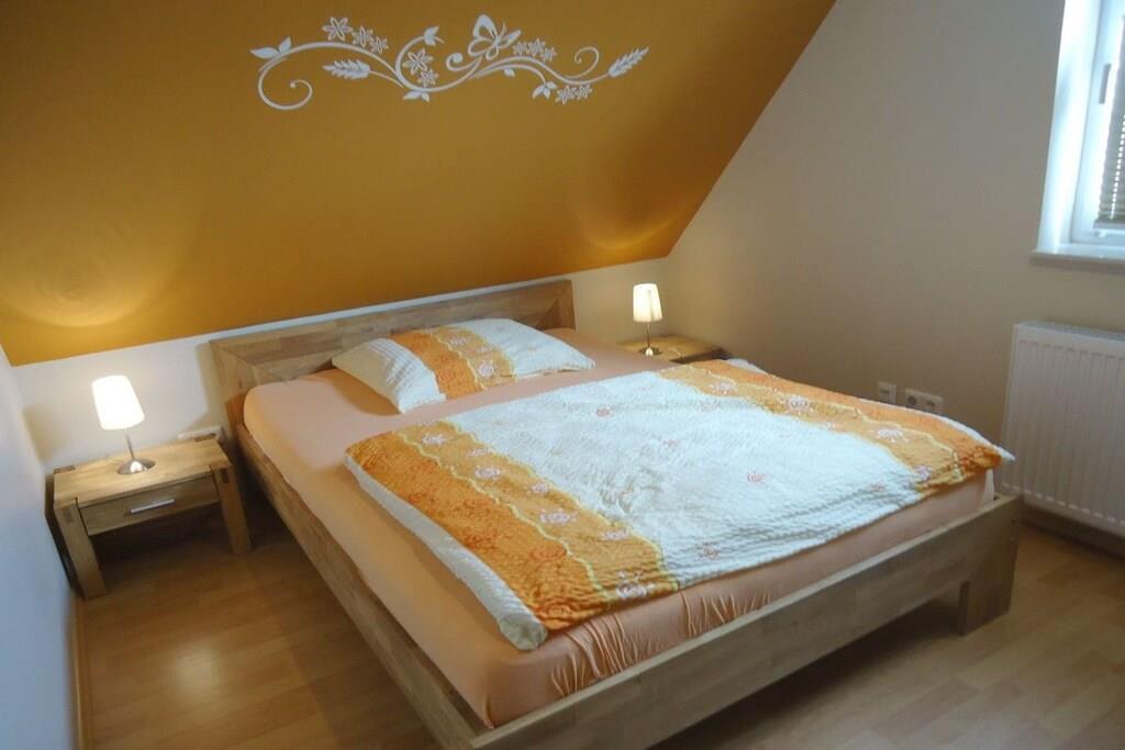 Unsere helle freundliche Balkonwohnung hat eine Gesamtgröße von 90 qm und verteilt sich über 2 Ebenen. Sie ist gemütlich für bis zu 4 Personen eingerichtet. Sie bietet zwei Schlafzimmer mit je einem Doppelbett. In dem Wohnraum, mit einer offenen Küche, steht eine Eckgarnitur zur Verfügung. Die Küchenzeile mit Umluftofen ist komplett eingerichtet u. a. mit Ceranfeld, Mixer, Toaster, Kaffeemaschine, Kühlschrank ohne Gefrierfach (Gefrierschrank und Waschmaschine in einem separaten Raum), Wasserkocher etc. Es gibt ein Duschbad mit WC und Badewanne (gefliest). Der Fußboden der restlichen Wohnung ist mit Laminat oder PVC ausgelegt. Es stehen Ihnen ein kostenloser Internetzugang per DSL, Sat-TV mit HiFi-Anlage (CD-MC, MP3, DVD) zur Verfügung. Parkplatz vor dem Haus