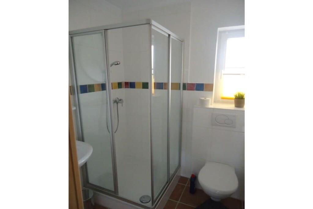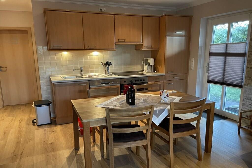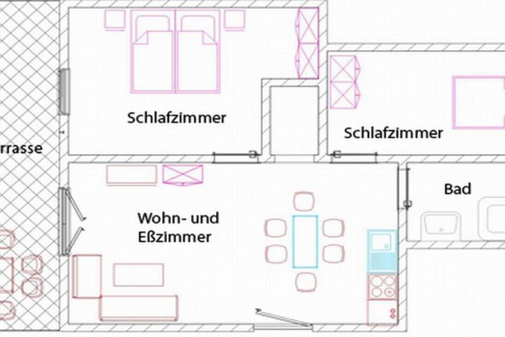 Unsere helle freundliche Terrassenwohnung hat eine Gesamtgröße von 70 qm und für bis zu 4 Personen eingerichtet. Sie bietet zwei Schlafzimmer mit je einem Doppelbett (180 x 200 und 140 x 200 cm). Im Wohnraum steht eine Eckgarnitur für kuschelige Fernsehabende (Sat-TV mit HiFi-Anlage (CD-MC, MP3, DVD) Die Küchenzeile ist komplett eingerichtet u.a. mit Ceranfeld, Umluftbackofen, Mixer, Toaster, Kaffeemaschine, Kühlschrank, Wasserkocher etc. Im Badezimmer befindet sind eine Dusche/WC (gefliest). Der Fußboden in den Wohnräumen ist mit Laminat ausgelegt und somit "Allergiker freundlich". In einem Nebenraum ist eine Waschmaschine und ein Gefrierschrank. Internetzugang steht Ihnen frei zur Verfügung. Parkplatz vor dem Haus