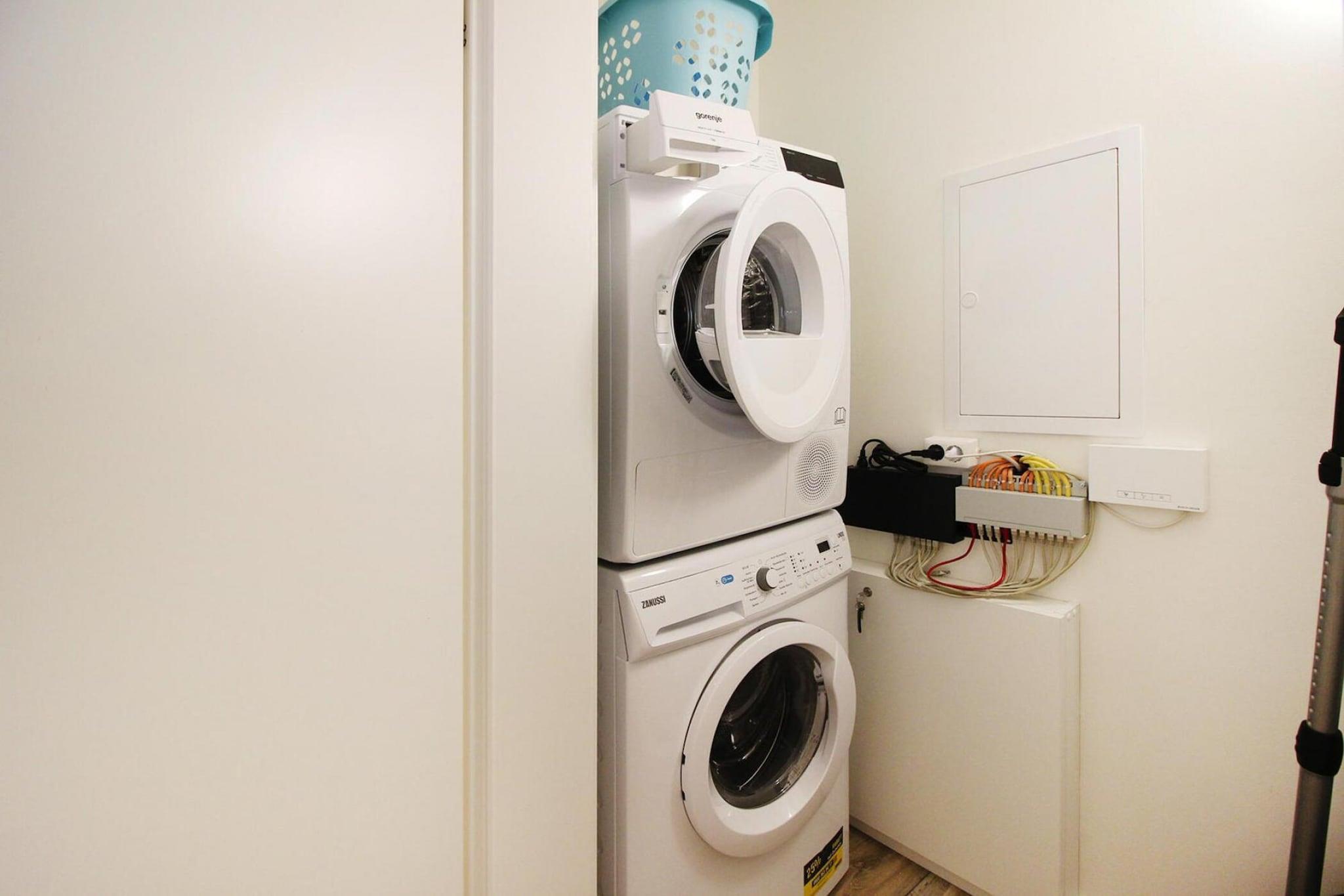 Stueetage: (åbent køkken(elkedel, brødrister, kaffemaskine, ovn, mikrobølgeovn, opvaskemaskine , køle-fryseskab), stue / spisestue(Fjernsyn, spisebord, pejs), soveværelse(enkeltseng, feltseng), badeværelse(bruser, håndvask, toilet, vaskemaskine)) På 1. etage: (soveværelse(dobbeltseng), soveværelse(køjeseng), badeværelse(bruser, håndvask, toilet)) terrasse, parkering, barnestol, baby crib(free), Vaskeripakke inkl.