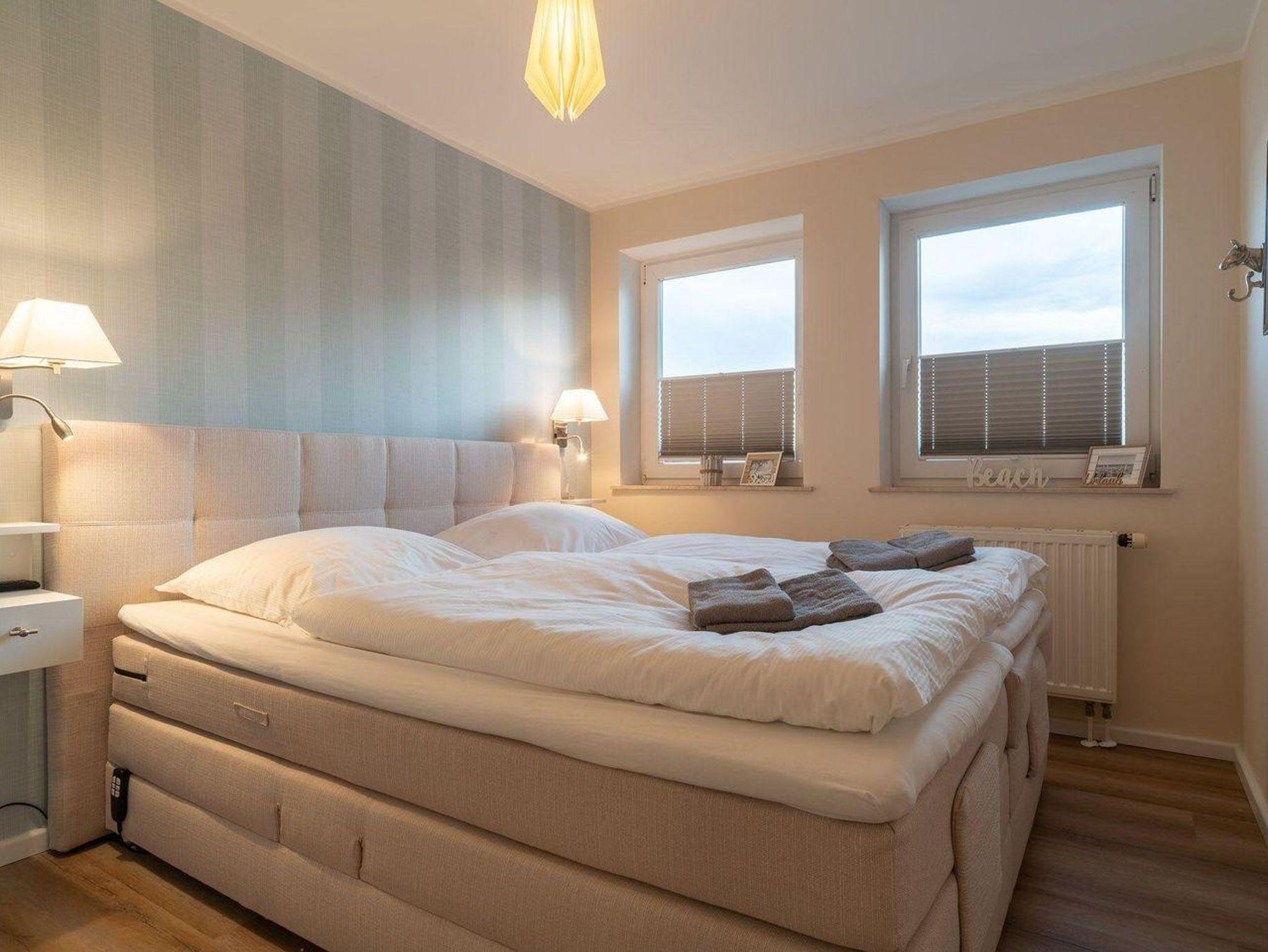 Die im Beachhouse Style renovierte Wohnung Deichblick, App. 12 , begrüßt zwei bis vier Personen im 1.OG mit Westbalkon .Hier können Sie den abendlichen Blick auf die hinter dem Deich untergehende Sonne mit einem Glas Wein genießen . Die Ferienwohnung hat 50 qm und der Zutritt über einen privaten Flurbereich gewährt absolute Privatssphäre . Vom Innenflur mit Garderobe gelangen Sie in den lichtdurchfluteten Wohnbereich. Er besteht aus einer Couch, einem verstellbarem Fernsehsessel mit Hocker , einem (55 Zoll) TV Flachbildschirm, einem großen ausklappbaren Schrankbett f 2 Personen, einem Eßtisch mit Sitzgelegenheit für 4 Personen und einer top aktuellen Küche incl. Geschirrspüler. Das Schlafzimmer besticht durch das elektrisch zu verstellende Boxspringbett (1,80 m x 2,00 m) mit 2 Nachttischen, Leselampen, Flachbildschirm,Schrank und offener Garderobe.