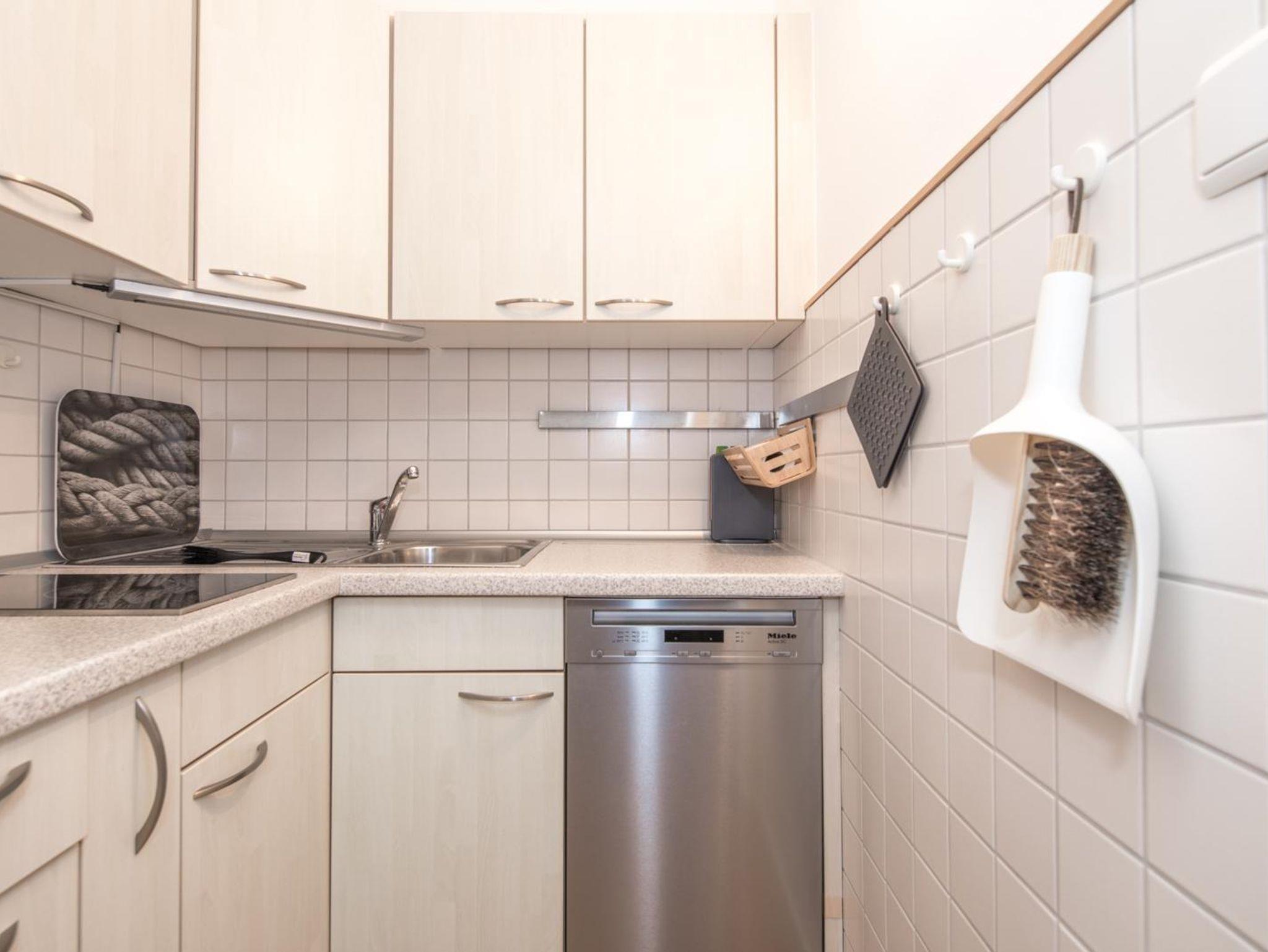 Eine offene Küche ist teilweise in das Wohnzimmer integriert. Eine Trennwand bietet eine schöne optische Trennung beider Bereiche. Der moderne Essbereich liegt direkt neben der Küche. Die Küche ist komplett ausgestattet und verfügt über hochwertige-Küchengeräte inklusive Geschirrspüler, Kühlschrank mit kleinem Gefrierfach, Backofen, Kockfeld, sowie einer Nespress Kaffeemaschine und herkömmlichen Kaffeemaschine. Sie finden auch ein Waffeleisen und weitere Küchengeräte vor.