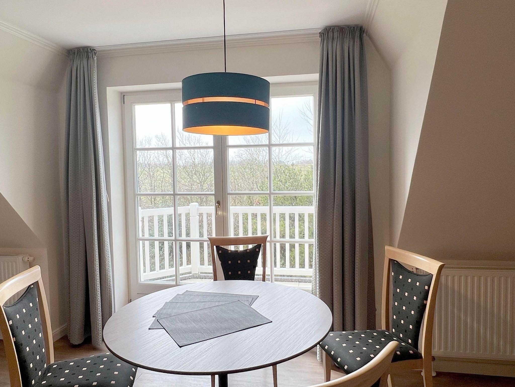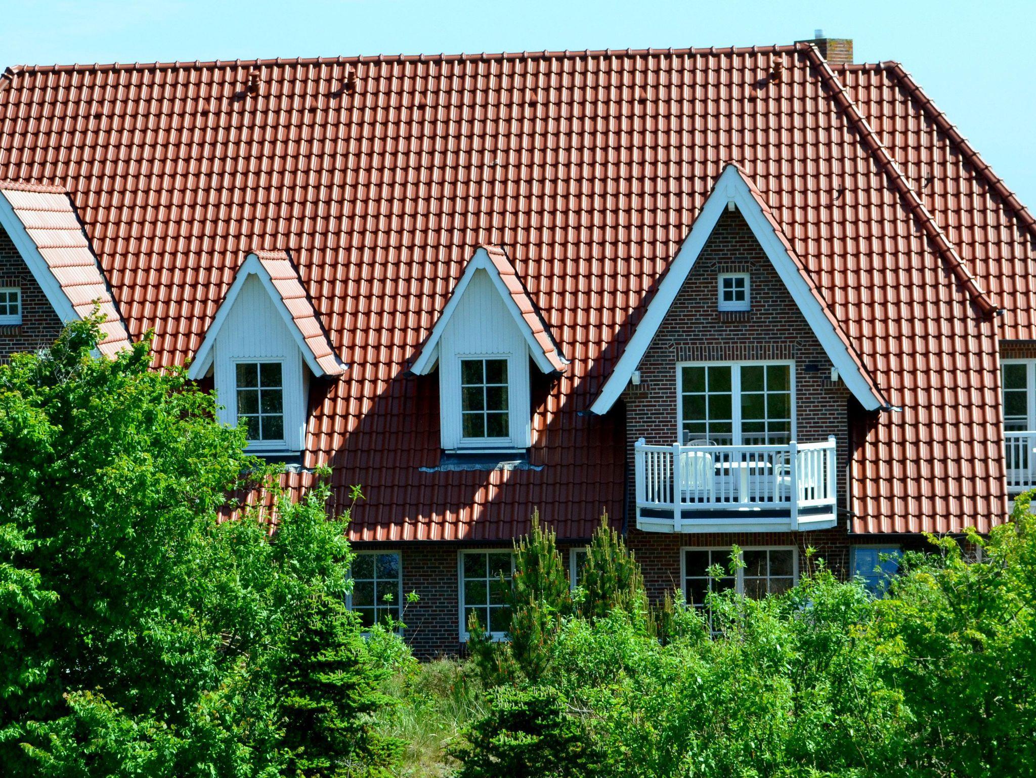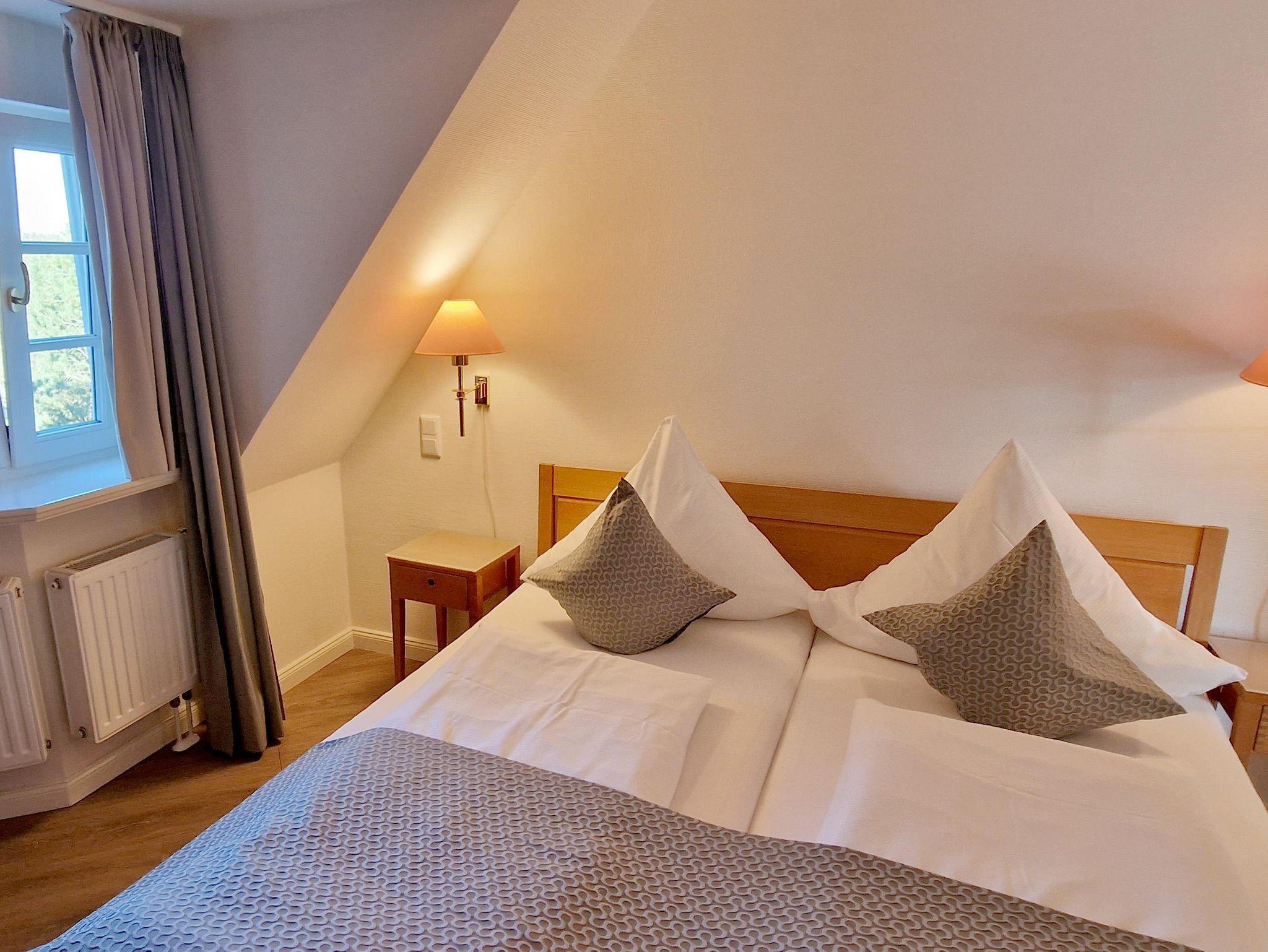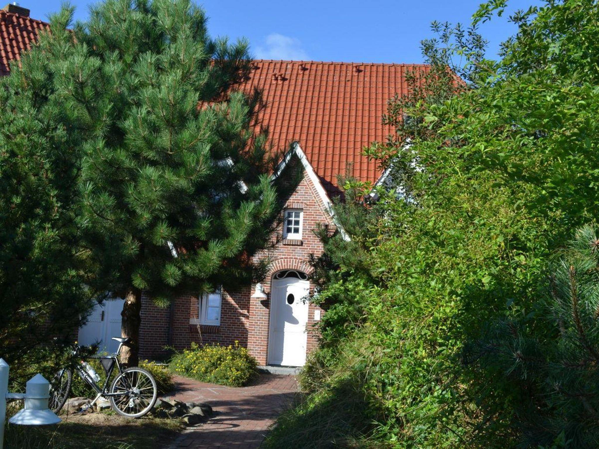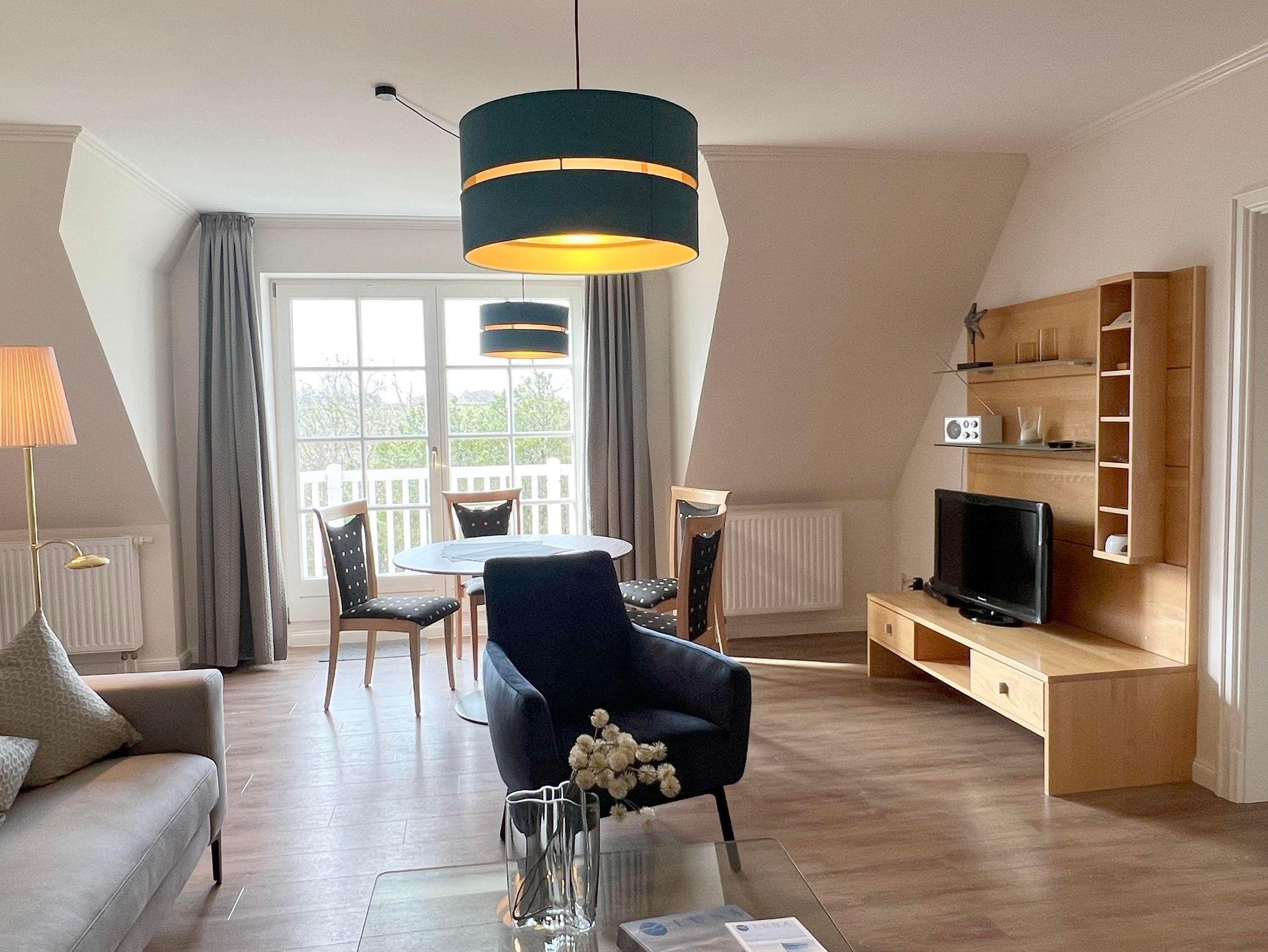 Eingangsbereich, Eingangsdiele mit Garderobe, großzügiger Wohn-Essbereich mit direktem Zugang auf einen Balkon mit Gartenmöbeln, zusätzlich im Dünengelände eine große, durch Friesenwälle und Gehölze abgeschirmte Terrasse mit Gartenmöbeln und einem Strandkorb. Zwei Schlafzimmer mit Doppelbetten, zwei Duschbäder/WC. Separate Küche. Im Untergeschoss befindet sich eine Gemeinschaftssauna (Ruheraum, verschiedene Duschen, Fußbäder), Fitnessraum, Tischtennis. Im Außenbereich: ein Spielplatz für die Kleinsten, Stellplatz, Fahrradständer.