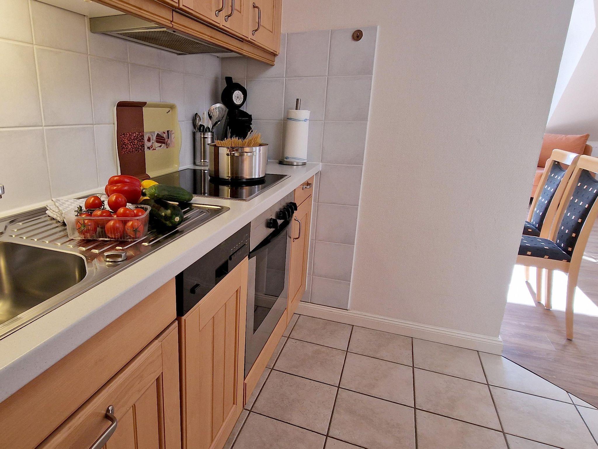 komplett eingerichtete Küche mit Ceranfeld, Mikrowelle, Backofen, Geschirrspüler, Kühlschrank mit Gefrierfach, Wasserkocher, Kaffeemaschine (Filter), Kaffeepadmaschine, Toaster.
