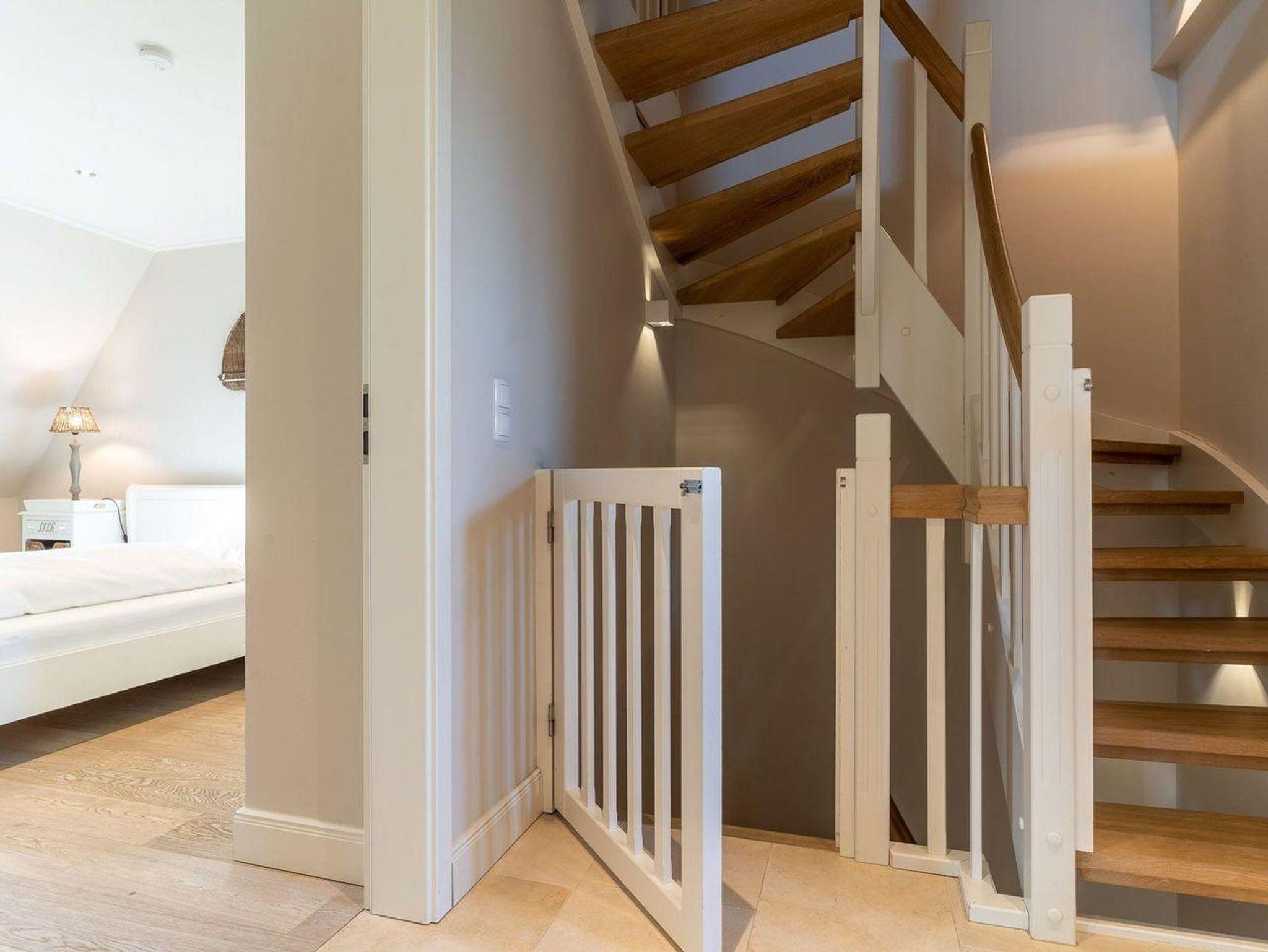 Über eine weitere Holztreppe geht es vom Flur ins Dachgeschoss mit gemütlichem Doppelbett und Flatscreen TV+DVD.