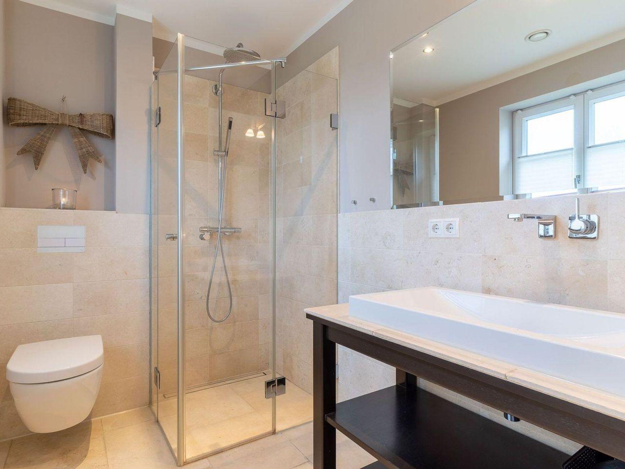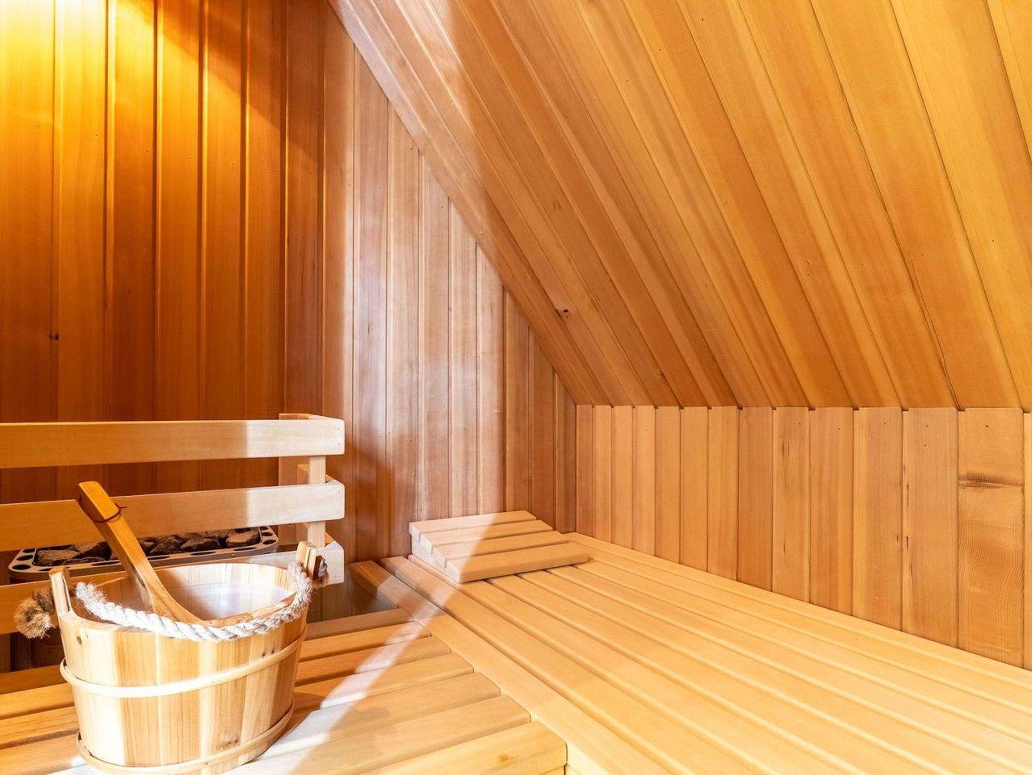 Über eine Holztreppe gelangt man in das Obergeschoss mit zwei großzügigen Schlafzimmern, einem Vollbad mit Dusche und Eckbadewanne sowie einem Saunaraum mit gemütlicher Ruhezone.