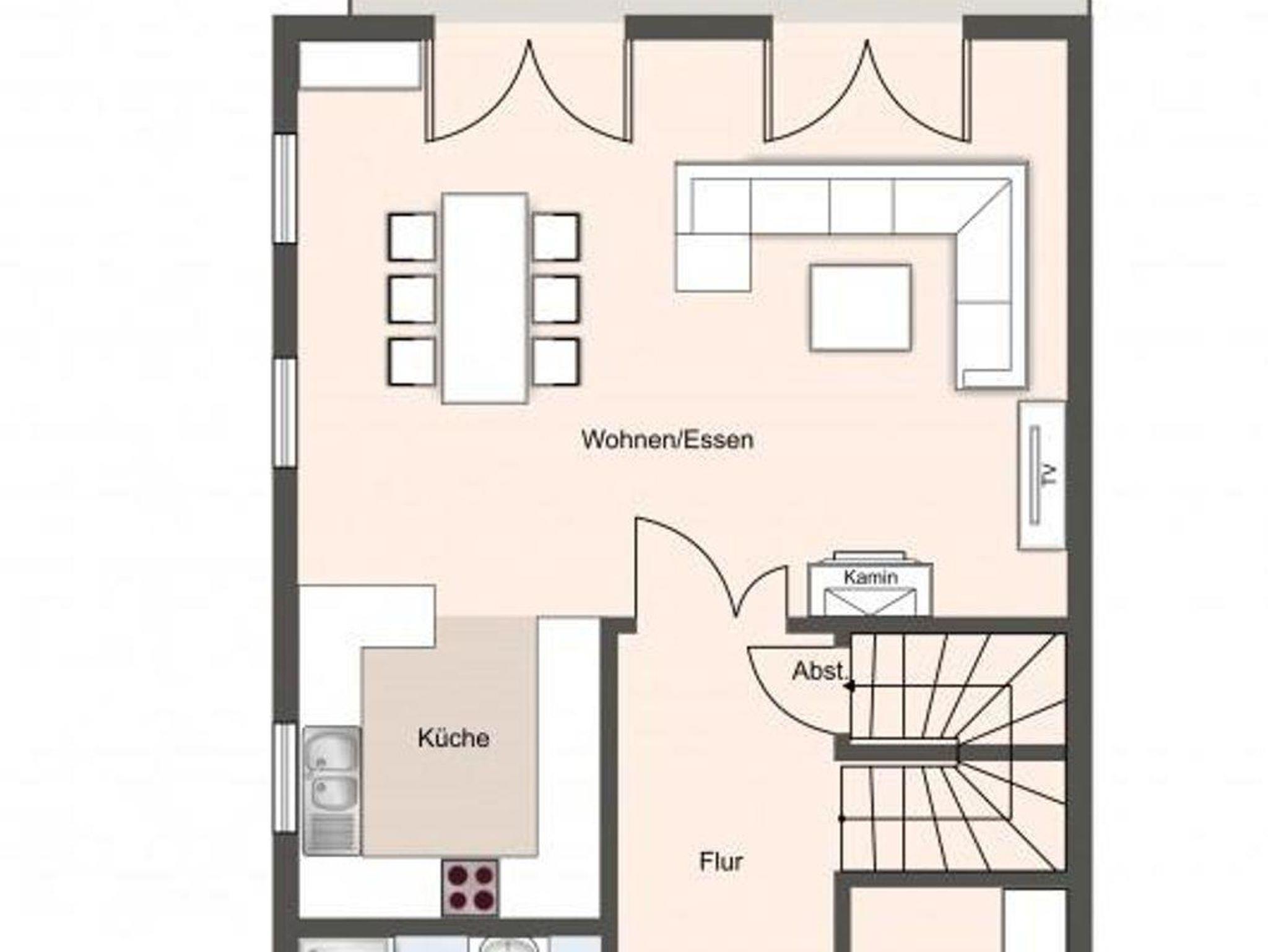 Im Erdgeschoss befindet sich der Wohnraum mit einer offenen Küche und einem gemütlichen Essbereich. Die Küche ist voll ausgestattet mit hochwertigen Geräten. Ein edler Kamin im Wohnraum bietet einen warmen Charakter. Im Erdgeschoss ist ebenso ein großer Flur mit eingebauter Garderobe, ein Hauswirtschaftsraum und ein großzügiges Duschbad.
