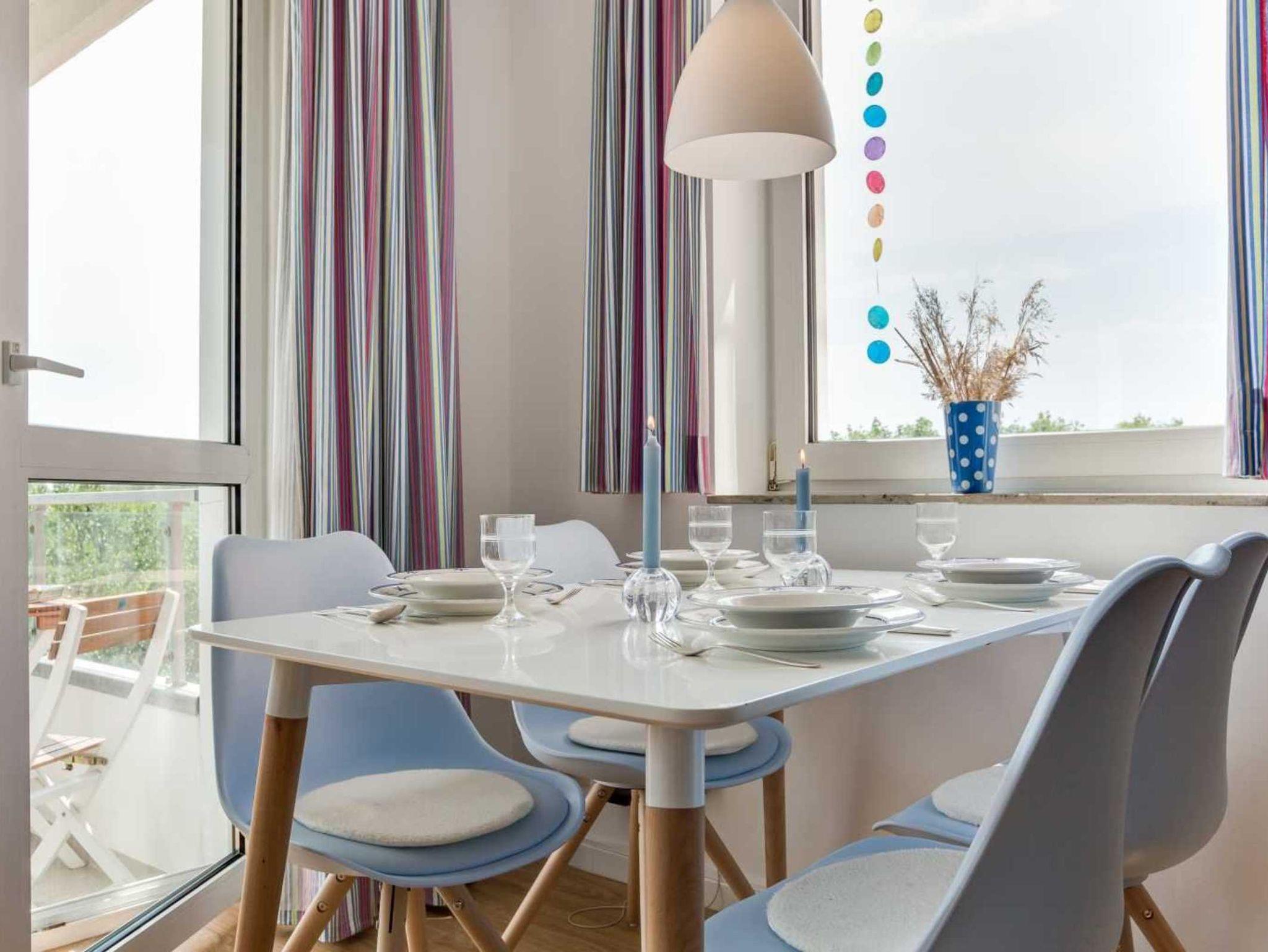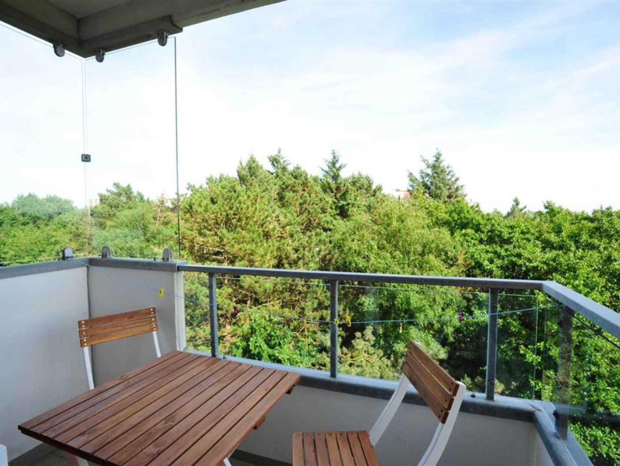 Wohnzimmer mit Sofa für 2-3 Personen, 2 Sesseln, TV (Sat), Stereo-Kompaktanlage und Esstisch mit 4 Stühlen. Direkter Zugang zum möblierten, windgeschützten Balkon nach Südwesten.