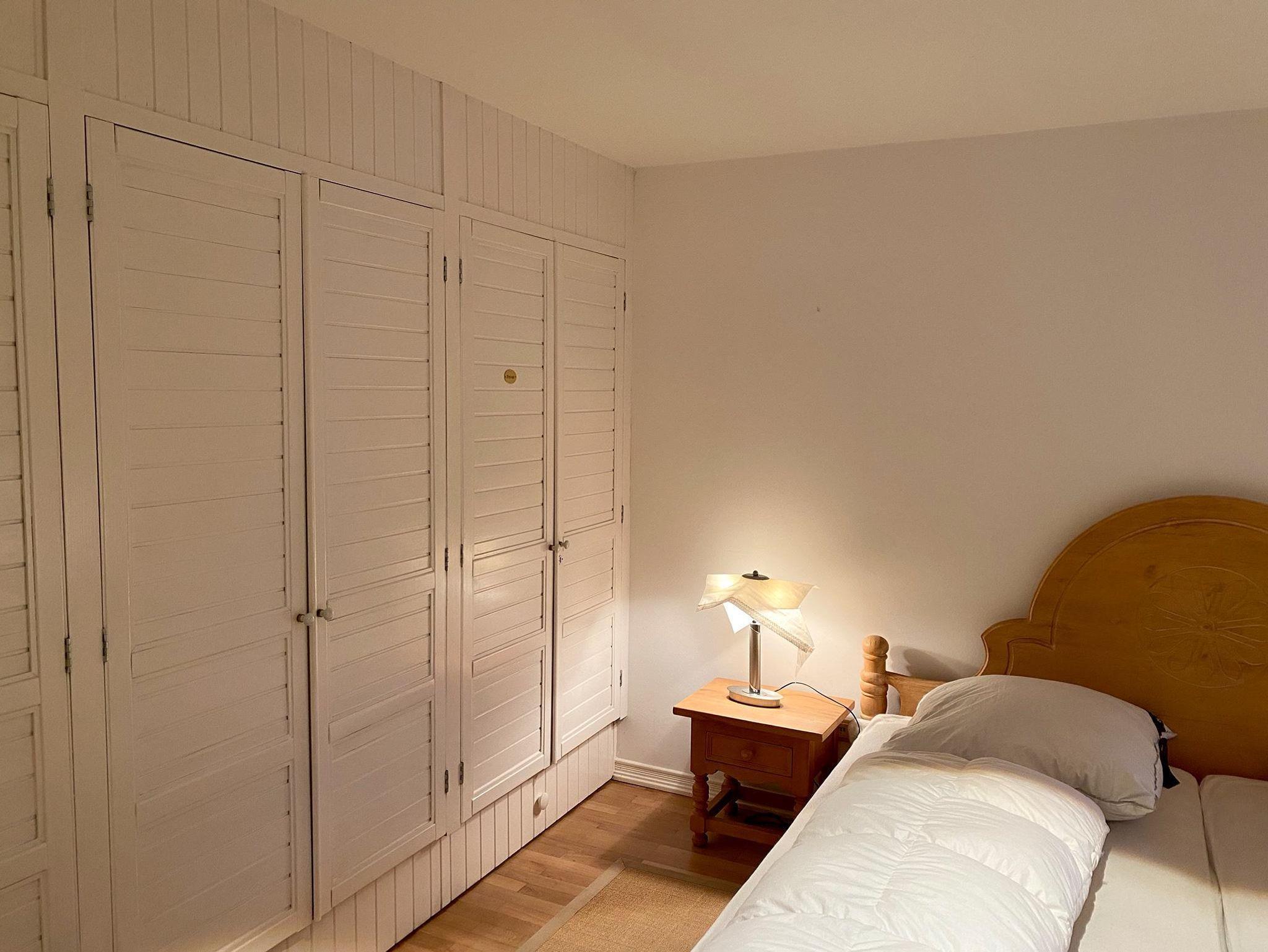 Das Haus ist individuell eingerichtet und gut ausgestattet. Im OG befinden sich ein Schlafzimmer, ein kleines Bad und das große Wohnzimmer mit offenen Dachbalken, Kamin und kleinem Süd-Balkon. Im EG liegen ein Badezimmer, die voll-ausgestattete Küche (Elektroherd, Geschirrspüler, Kühl-Gefrierschrank, Mikro-Welle) und ein kombiniertes Wohn-/Schlafzimmer mit Zugang zu Terrasse und Garten.