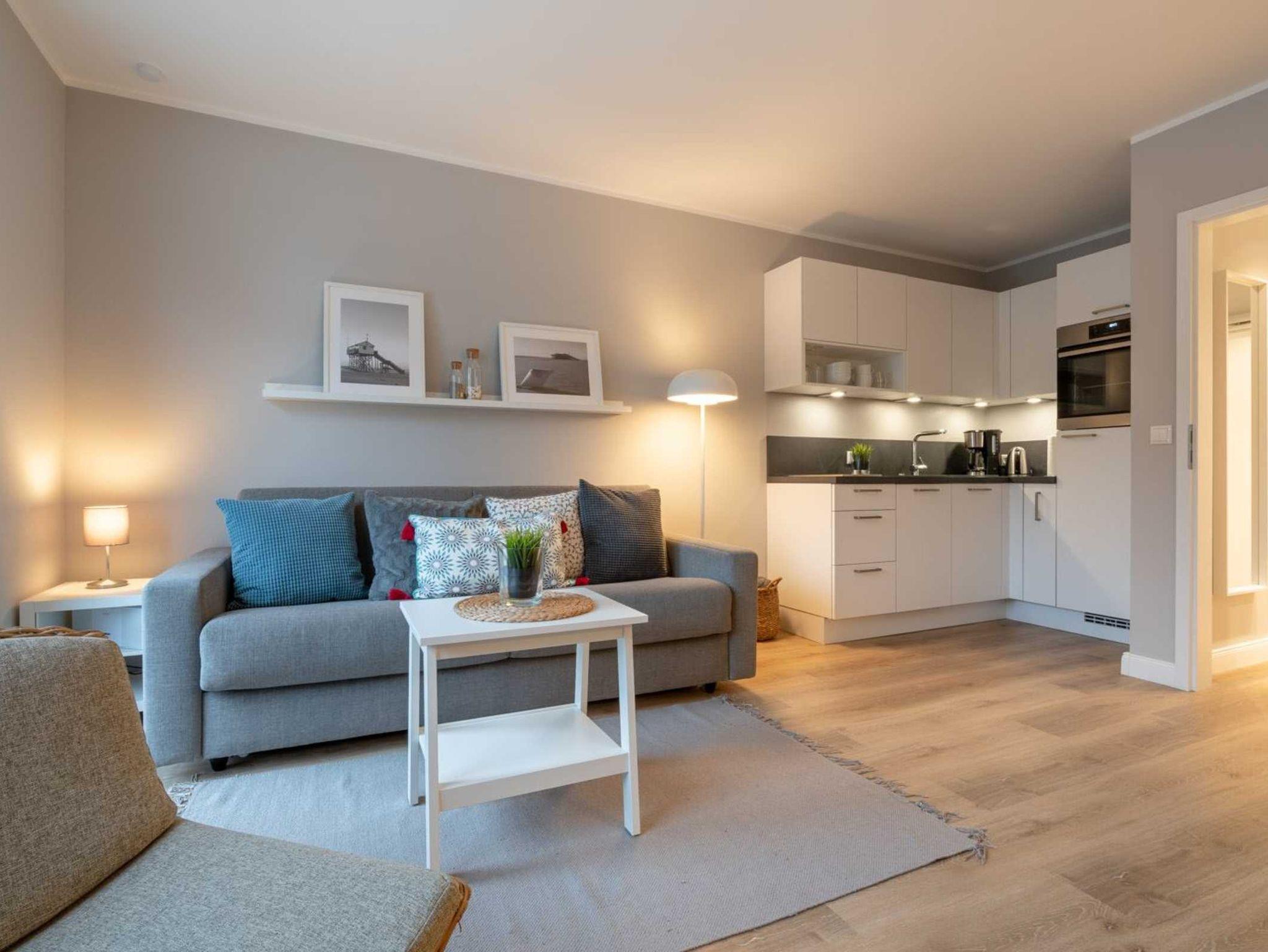 Wohn- und Schlafzimmer mit ausklappbarem Schlafsofa (160x195cm, mit rückenfreundlichem Ergoflex-Lattenrost und Matratze), Sessel, Esstisch für 2 Pesonen, TV (Sat) und CD-Player mit Radio. Französischer Balkon. Offene Küche mit Herd mit 2 Kochstellen, Backofen, Geschirrspüler und Kühlschrank mit Gefrierfach.