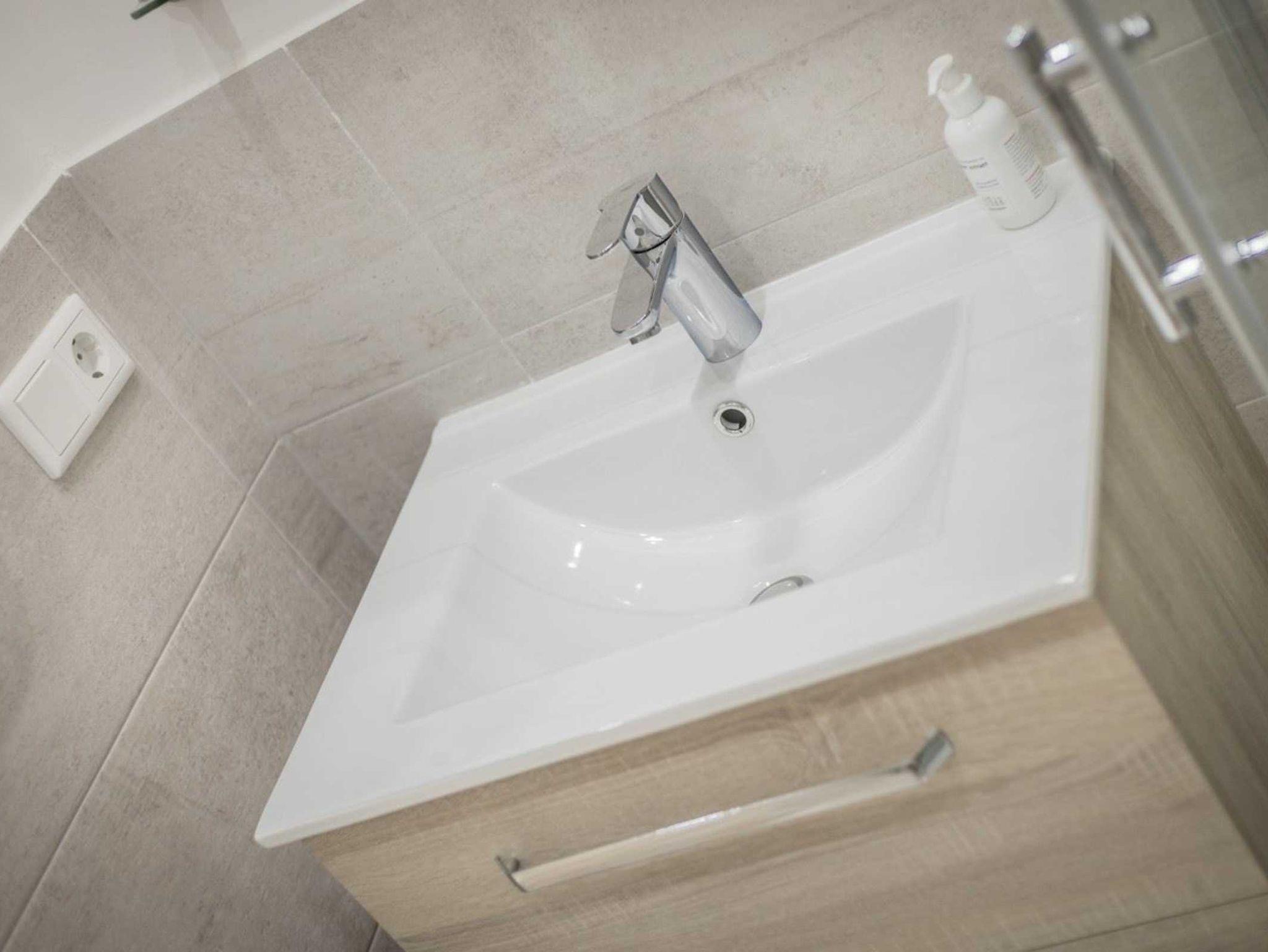 Badezimmer (Duschbad) mit Dusche, WC, Handtuchwärmer und Föhn.