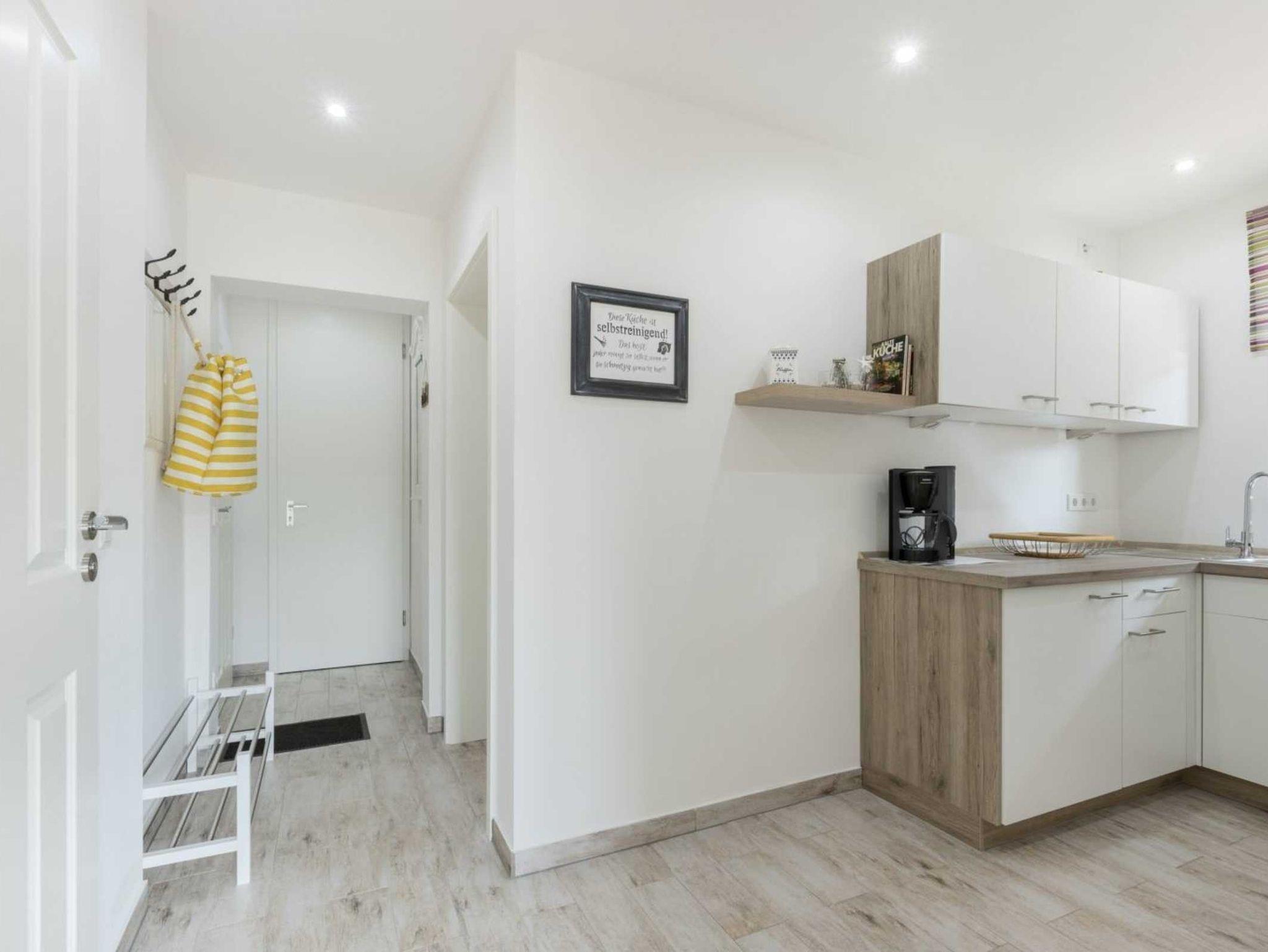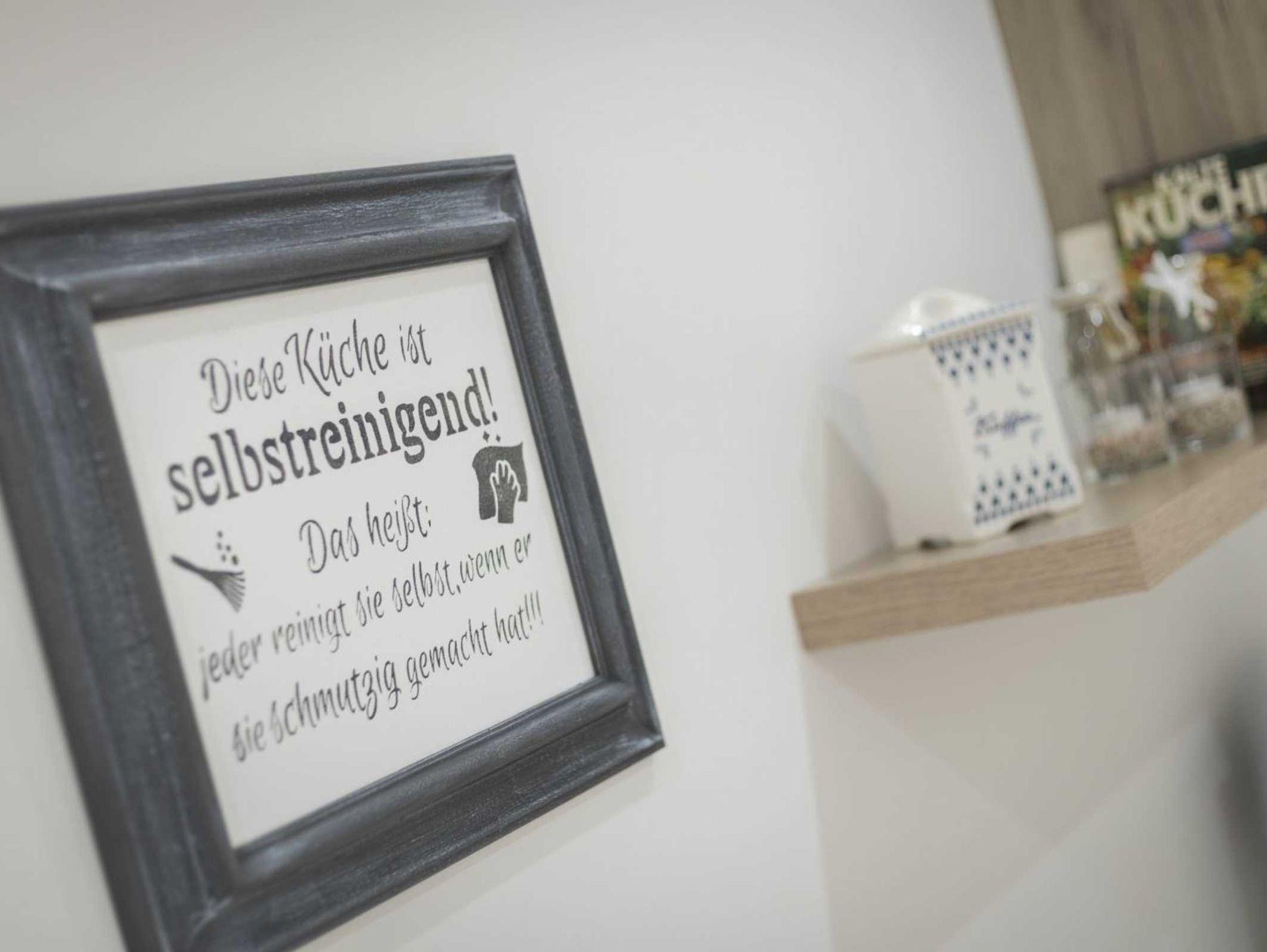 Wohnzimmer mit Schlafsofa (160x200cm), Ledersessel, großem TV (Kabel mit Magenta und Sky), Stereo-Kompaktanlage, BluRay-Player und Esstisch mit 4 Stühlen. Direkter Zugang zur möblierten Garterrasse nach Süden mit Strandkorb (ab 2020). Offene Küche mit Backofen und Kühlschrank mit Gefrierfach.