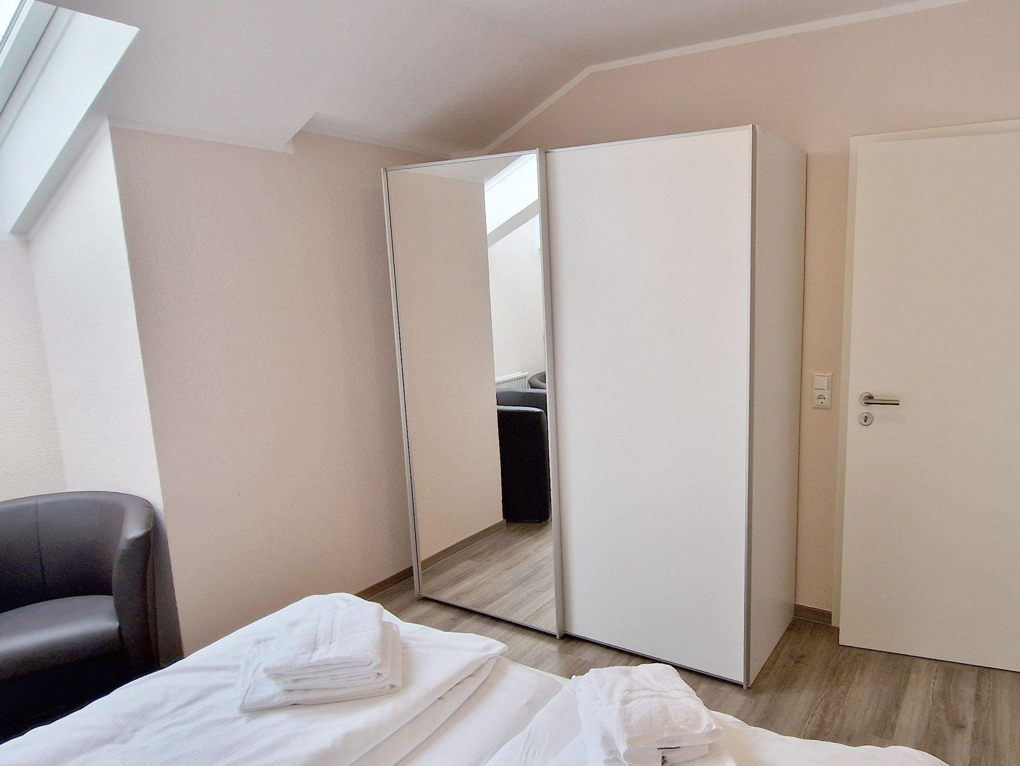 Schlafzimmer Doppelbett 2,00 x 2,00 m, 2 Nachttische, Kleiderschrank, Schrank, 2 Hocker, 2 Stühle, Staubsauger