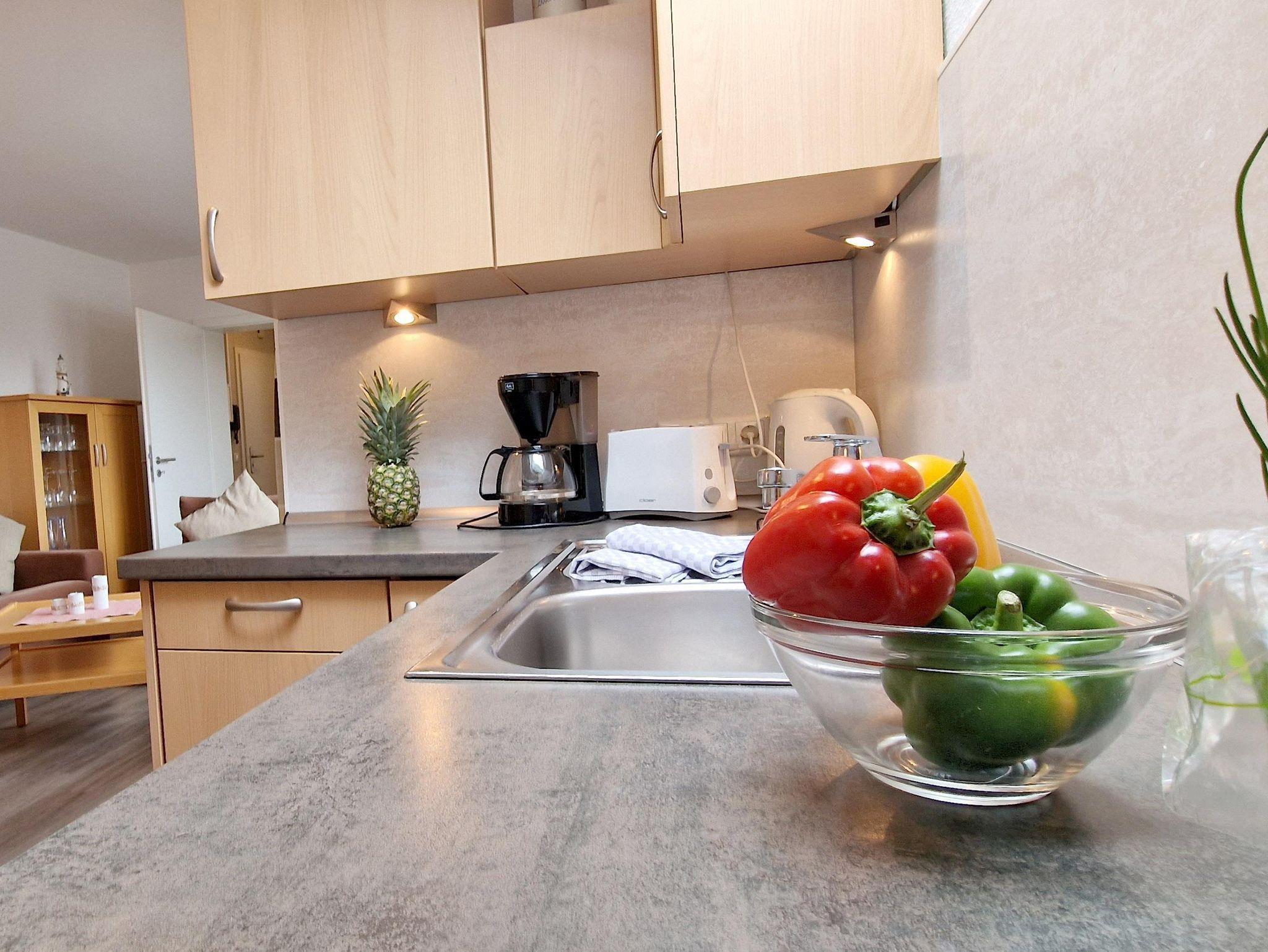 Wohnzimmer Schlafcouch, Couchtisch, 2 Sessel, Stehlampe, Vitrine, Vitrinenschrank, TV-Rolltisch, Kabel-TV, Flachbildschirm, Stereoanlage mit CD-Player, Esstisch, 4 Stühle, Einbauküche, 4 Plattenherd mit Ceranfeld und Backofen, Dunstabzugshaube, Kühlschrank, Spülmaschine, Kaffeemaschine, Wasserkocher, Toaster, Geschirr, Kochtöpfe
