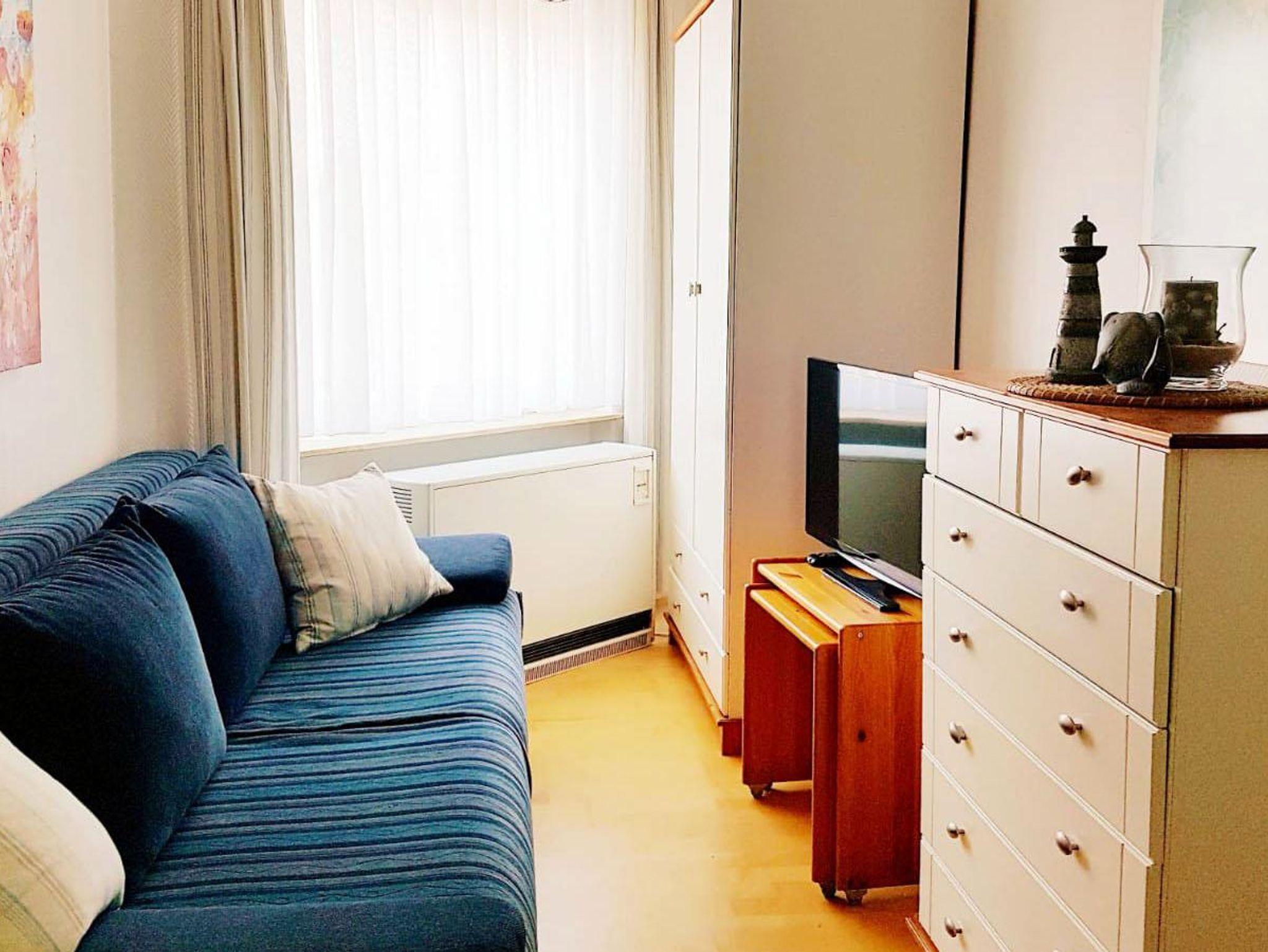 Schlafzimme: rDoppelbett 2,00 x 1,40 m, Stehlampe, Schlafcouch, Nachtspeicherofen, Kleiderschrank, TV-Tisch, Kabel-TV, Kommode