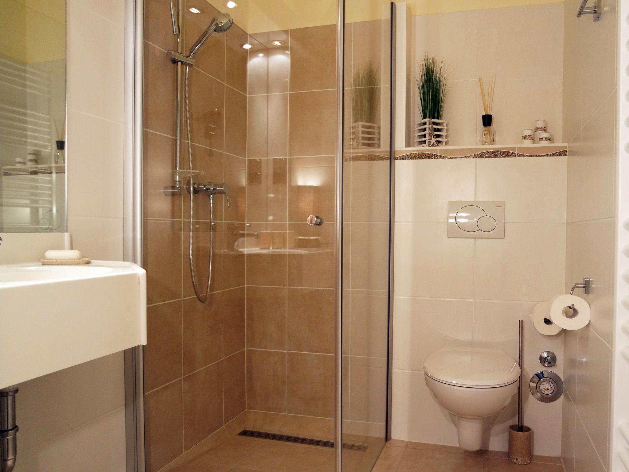 Bad: Dusche bodengleich, Waschtisch, Spiegel, WC, Duschwand, Handtuchheizkörper