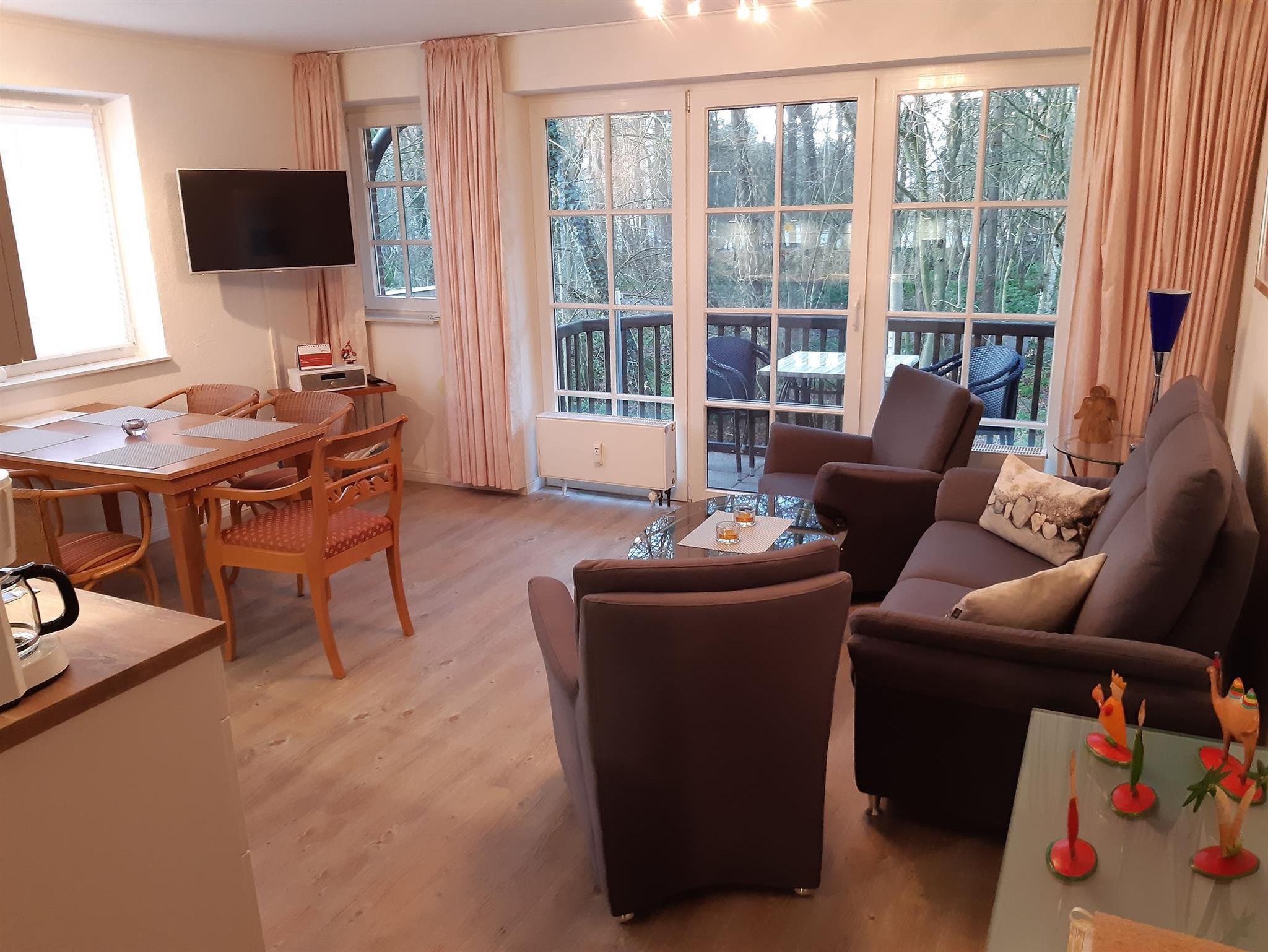 Kiebitz, 3-Zimmer-Appartement im Erdgeschoss im linken Hausteil gelegen. Flur. Duschbad/WC mit Fenster. 2 Schlafzimmer mit Doppelbett und Kleiderschrank. Wohnzimmer mit integrierter Küchenzeile (Ceranfeld, Geschirrspüler), Eßecke, Sitzecke. Kabel-Flach-TV, Safe. Möblierter Südwest-Balkon. Böden mit PVC-Belag. Waschmaschine u. Trockner im Haus, PKW-Stellplatz Nr. 11. Keine Tiere. Nichtraucher. Kostenlose Saunanutzung im Haus möglich.