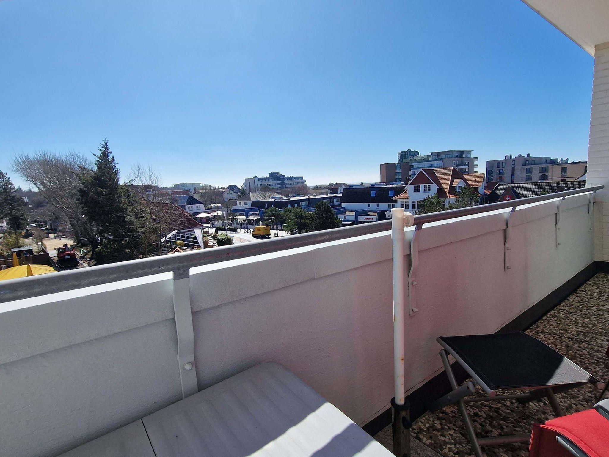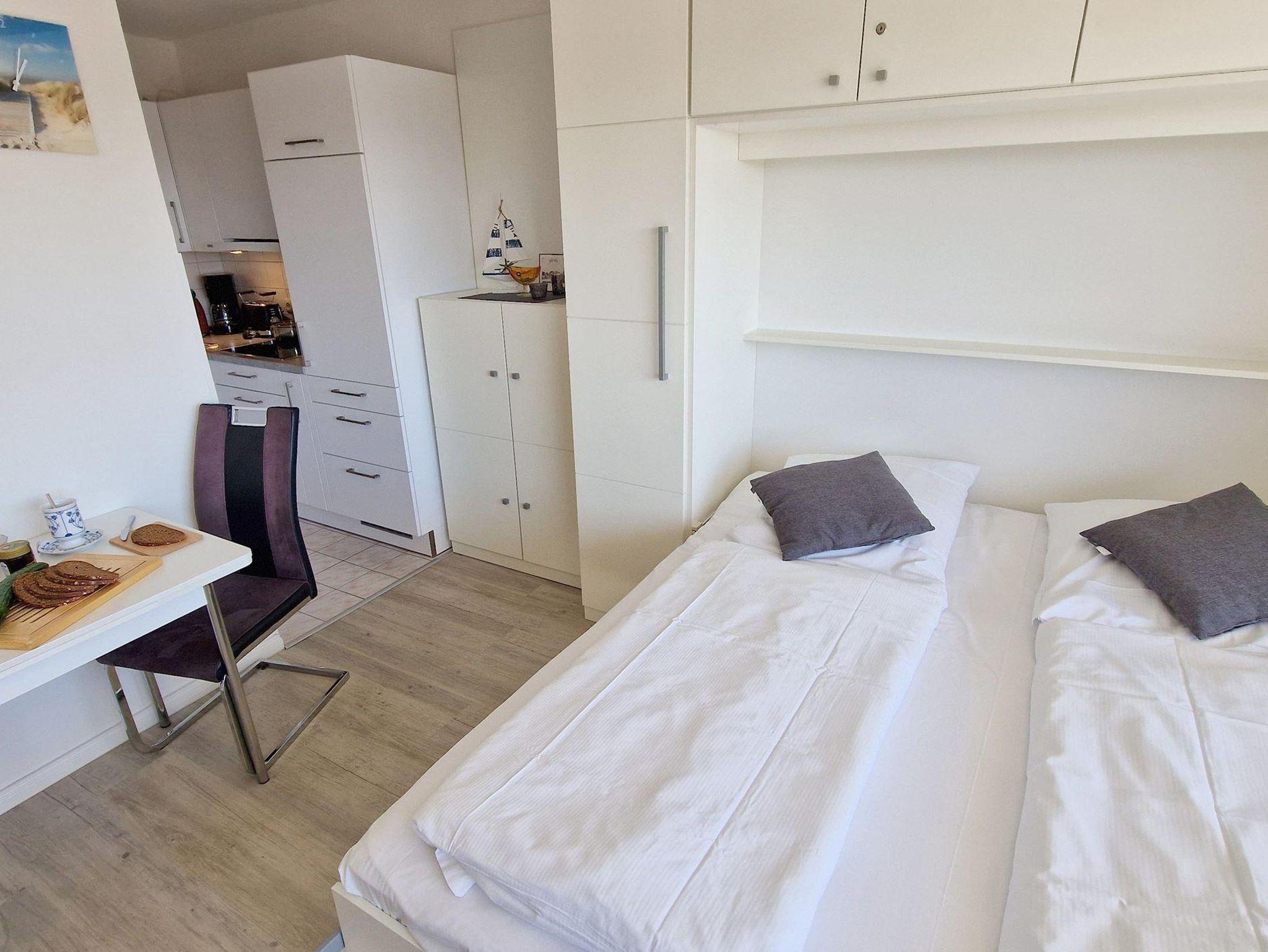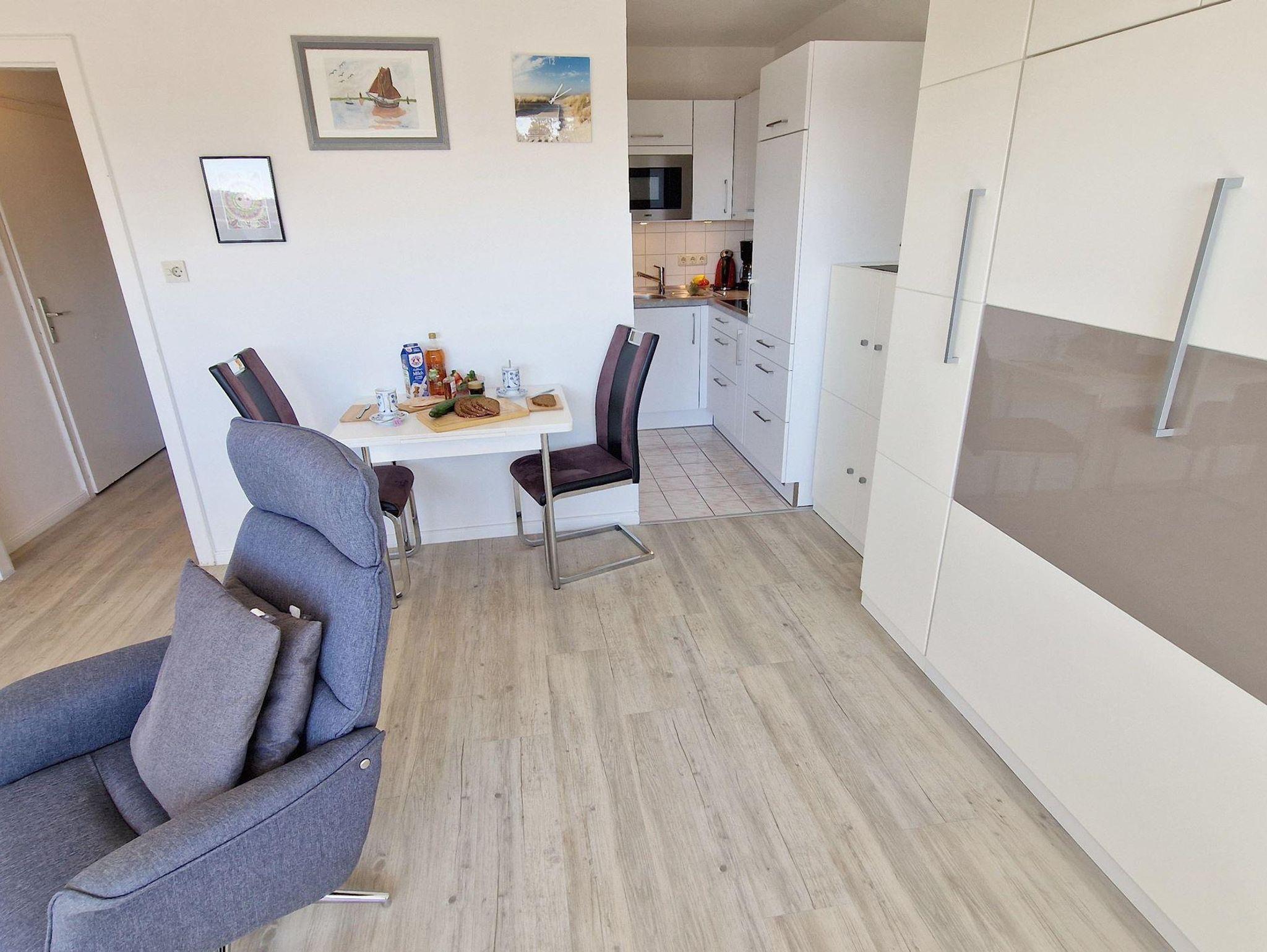 Das helle Wohn-Esszimmer mit offener Küchenzeile lädt zum Entspannen ein und bietet direkten Zugang zu einem Balkon, auf dem Sie die frische Luft genießen können. Ein modernes Duschbad sorgt für zusätzlichen Komfort während Ihres Aufenthalts.