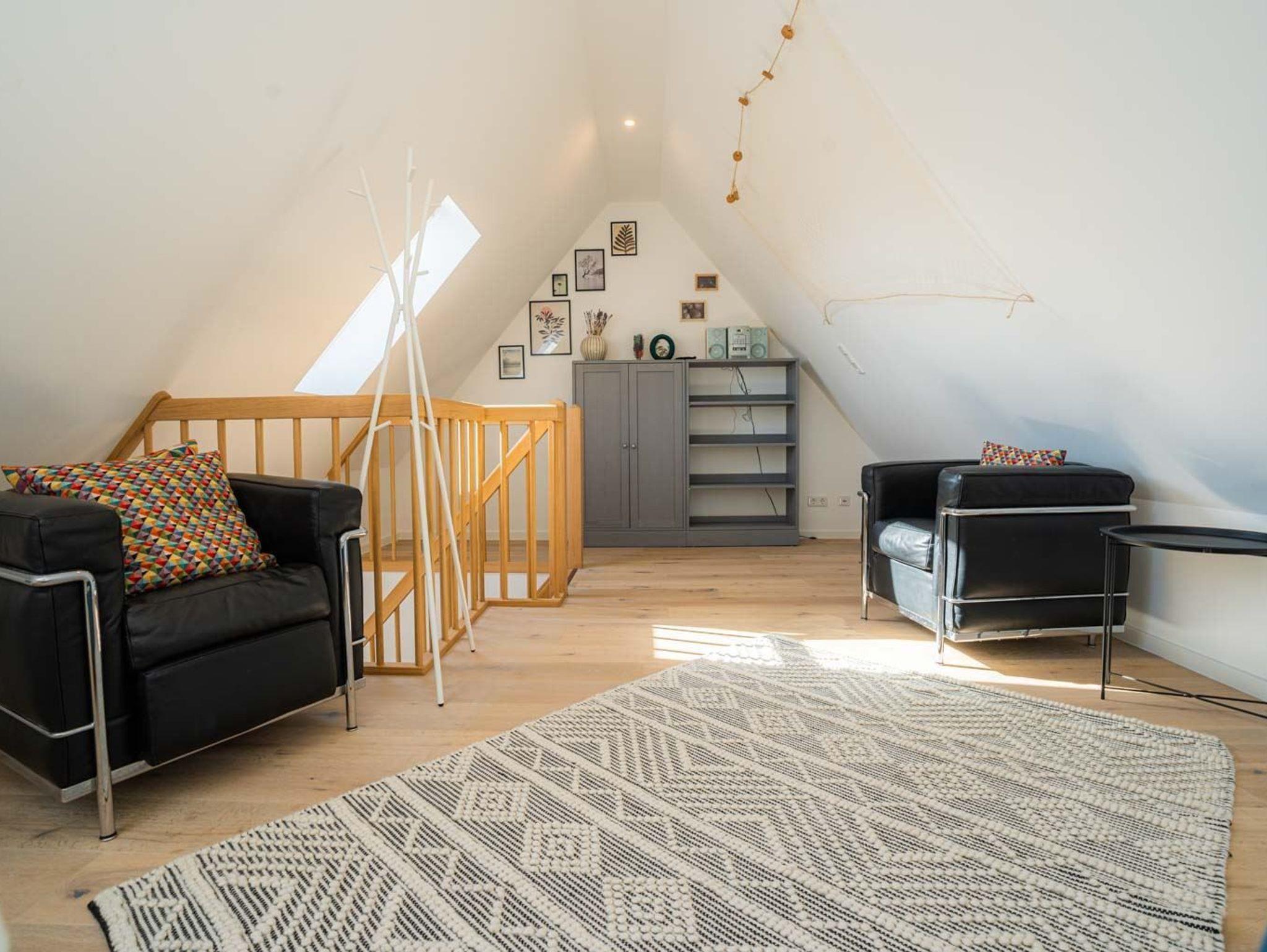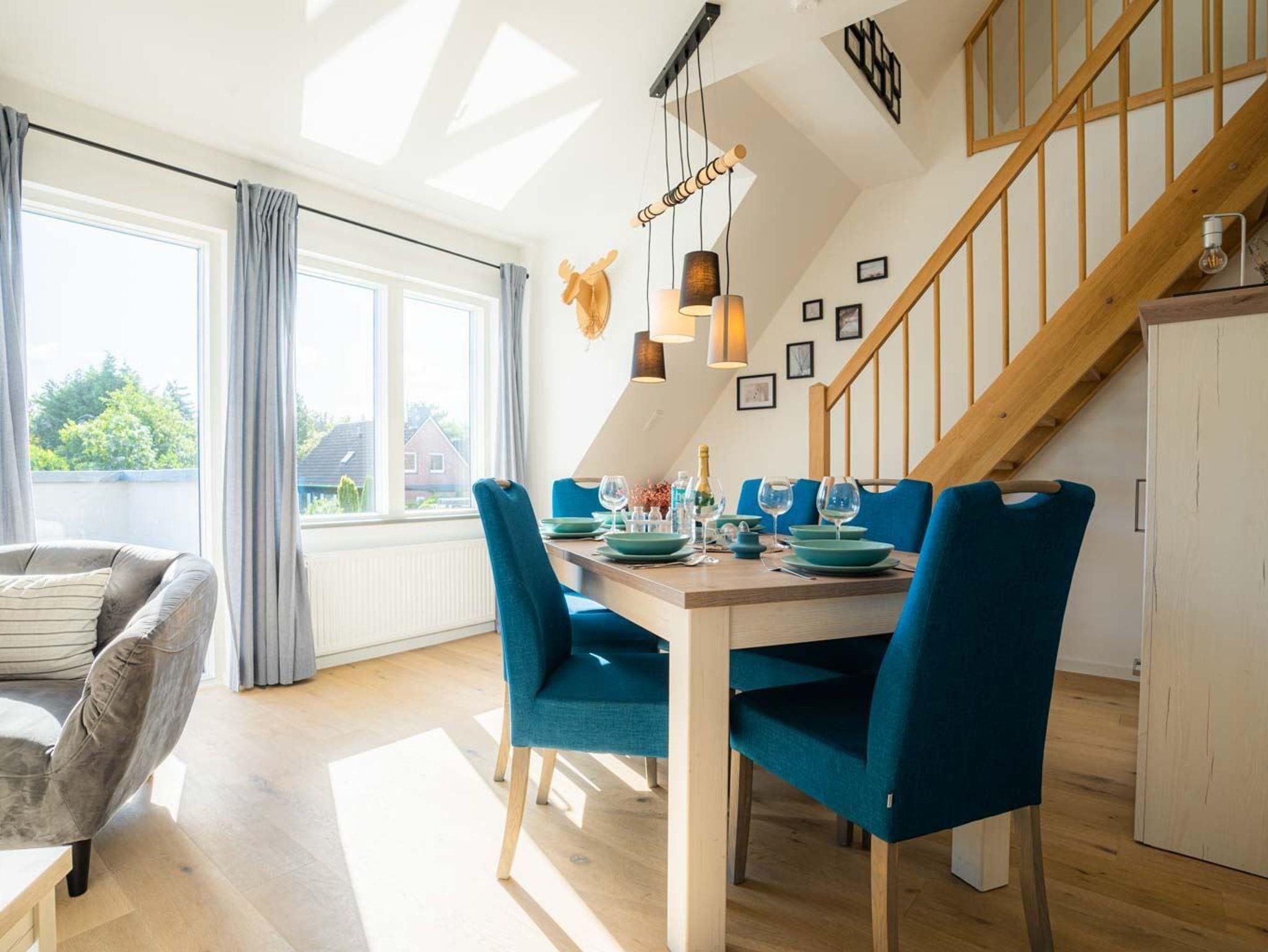 Wohnzimmer mit Sofa für 2 Personen, 2 Sesseln, SMART-TV (waipu), Bluetooth-Soundanlage und Esstisch mit 6 Stühlen. Direkter Zugang zum möblierten Balkon nach Südwesten mit schönem Blick in grüne Gärten. Vom Wohnzimmer führt eine Treppe zum 3. Schlafzimmer.