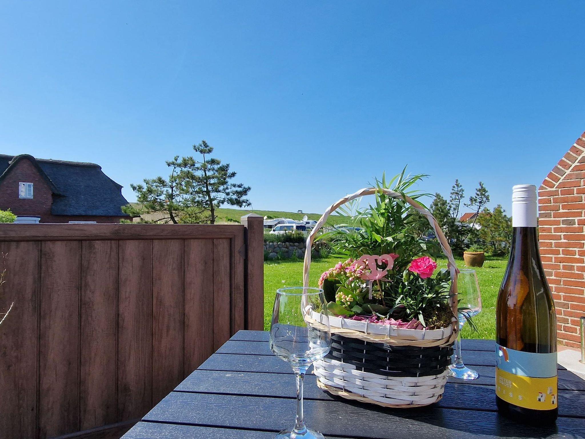 Traumhafte Terrasse: Verbringen Sie unvergessliche Stunden auf der teilweise überdachten Terrasse in Süd-Westlage. Lehnen Sie sich im Strandkorb zurück und genießen Sie die Farben des Sonnenuntergangs.