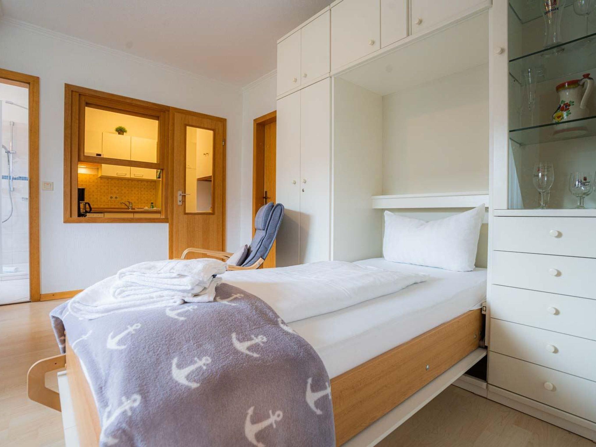 Gemütliche, einfache 2-Zimmer-Ferienwohnung Steuermannskajüte im Haus Seewolf mit ca. 41 m² auf 1 Ebene (OG) für bis zu 3 Personen. In ruhiger Lage nahe der Einkaufsstraße im Ortsteil Dorf in St. Peter-Ording. Alle Geschäfte, Restaurants und Bäckereien sind fußläufig bequem erreichbar. Zwei Hunde sind nach Anmeldung herzlich willkommen.