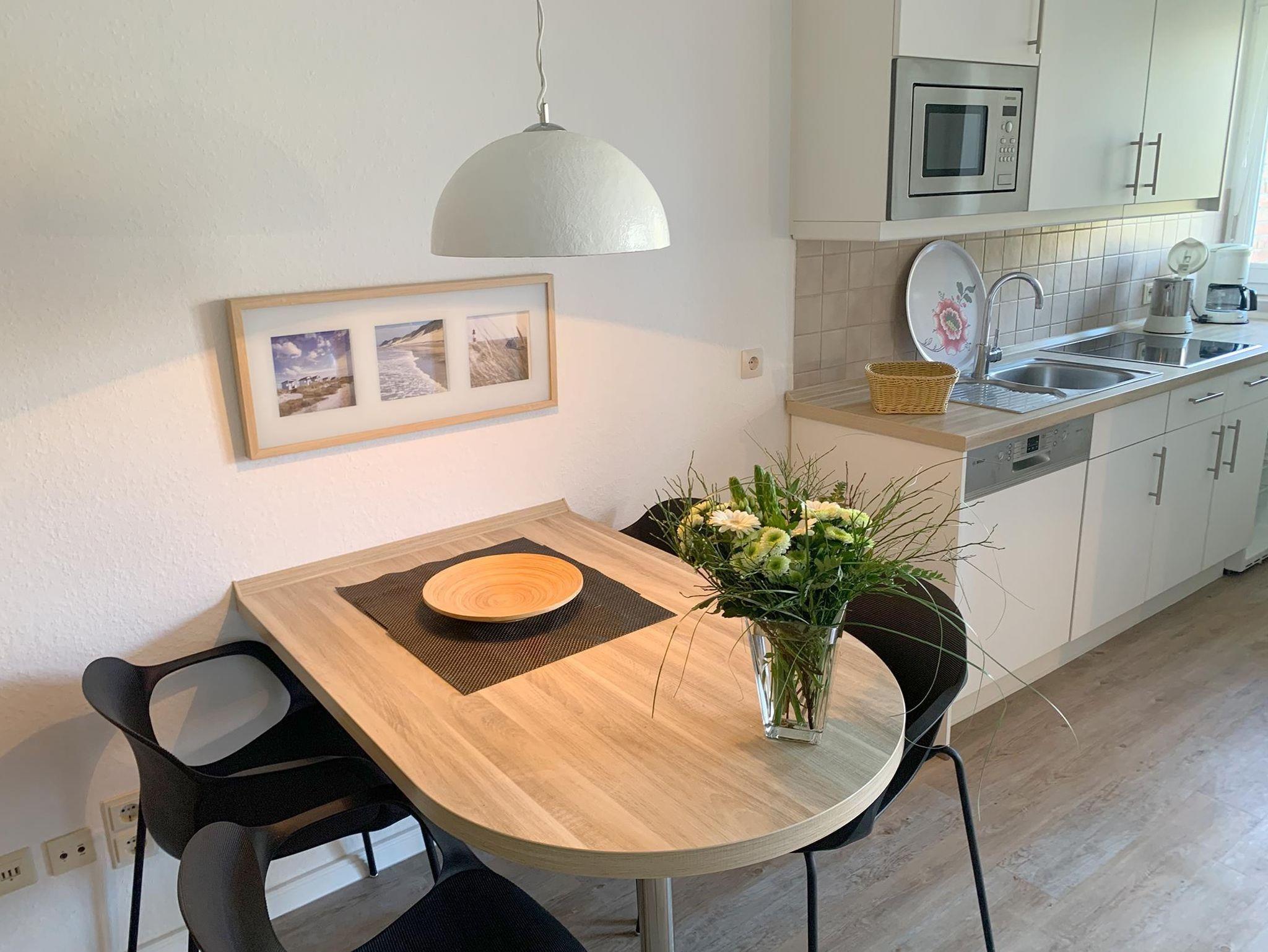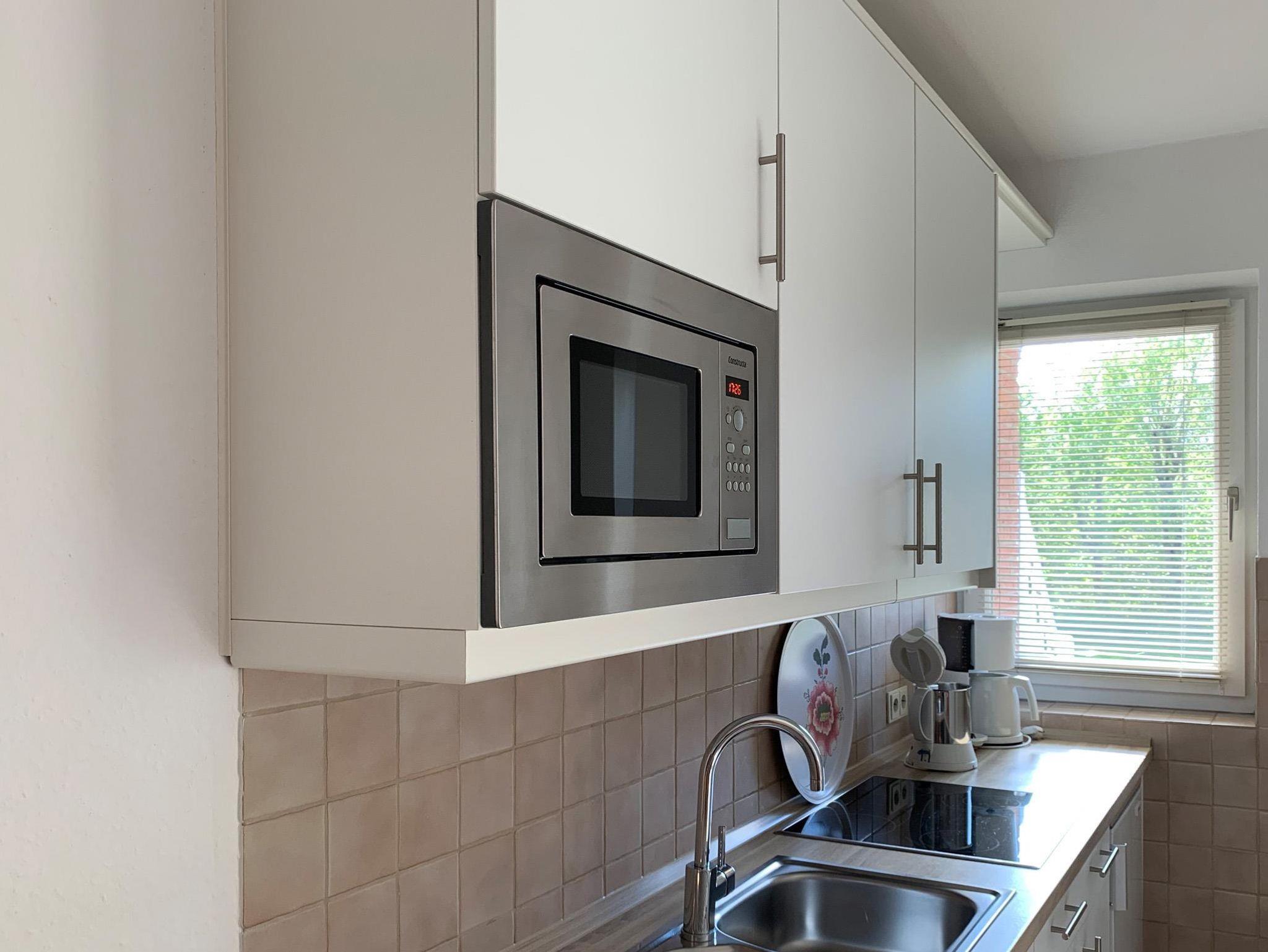 • komplett eingerichtete Küche mit Ceranfeld, Mikrowelle, Geschirrspüler, Kühlschrank mit Gefrierfach, Wasserkocher, Kaffeemaschine (Filter), Toaster.