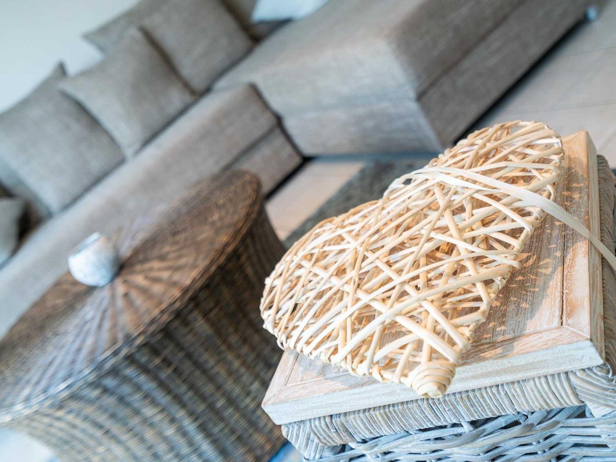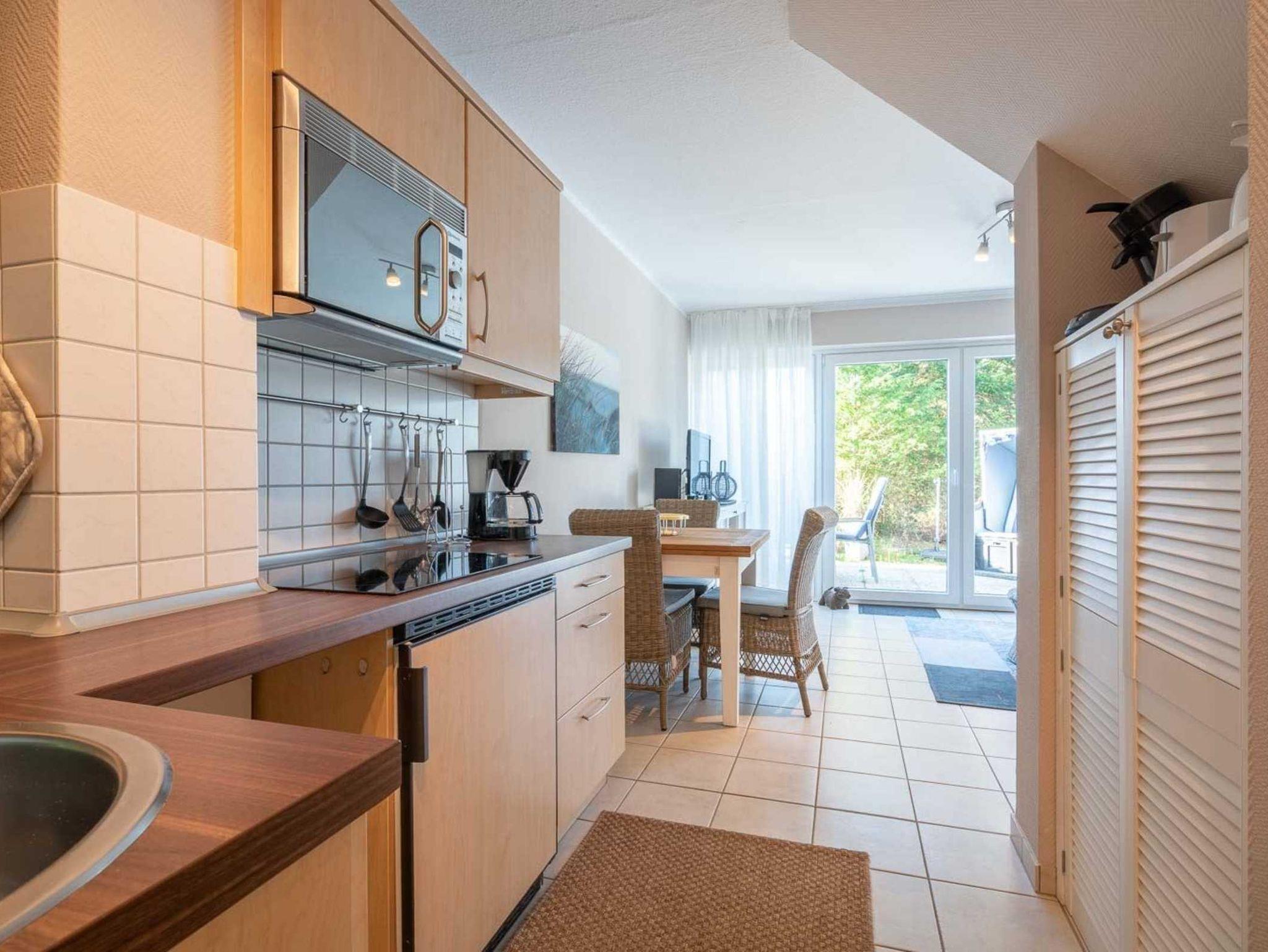 Wohnzimmer mit großem (Schlaf-) Ecksofa (120x220cm), TV (Kabel), Stereoanlage und Esstisch mit 3 Stühlen. Direkter Zugang zur möblierten, windgeschützten Terrasse nach Südwesten mit Strandkorb. Offene Küche mit Kühlschrank mit Gefrierfach und Mikrowelle mit Grillfunktion.