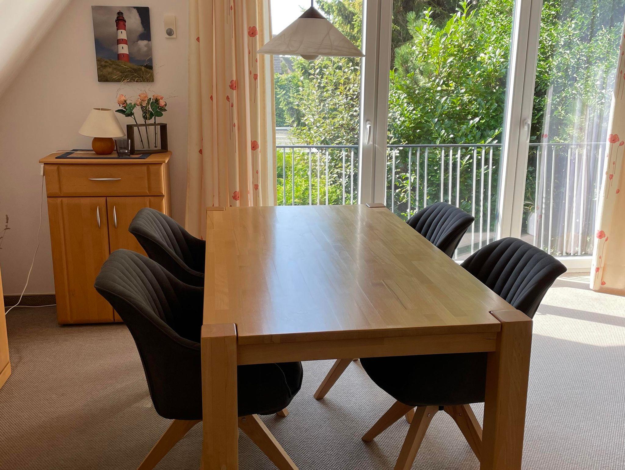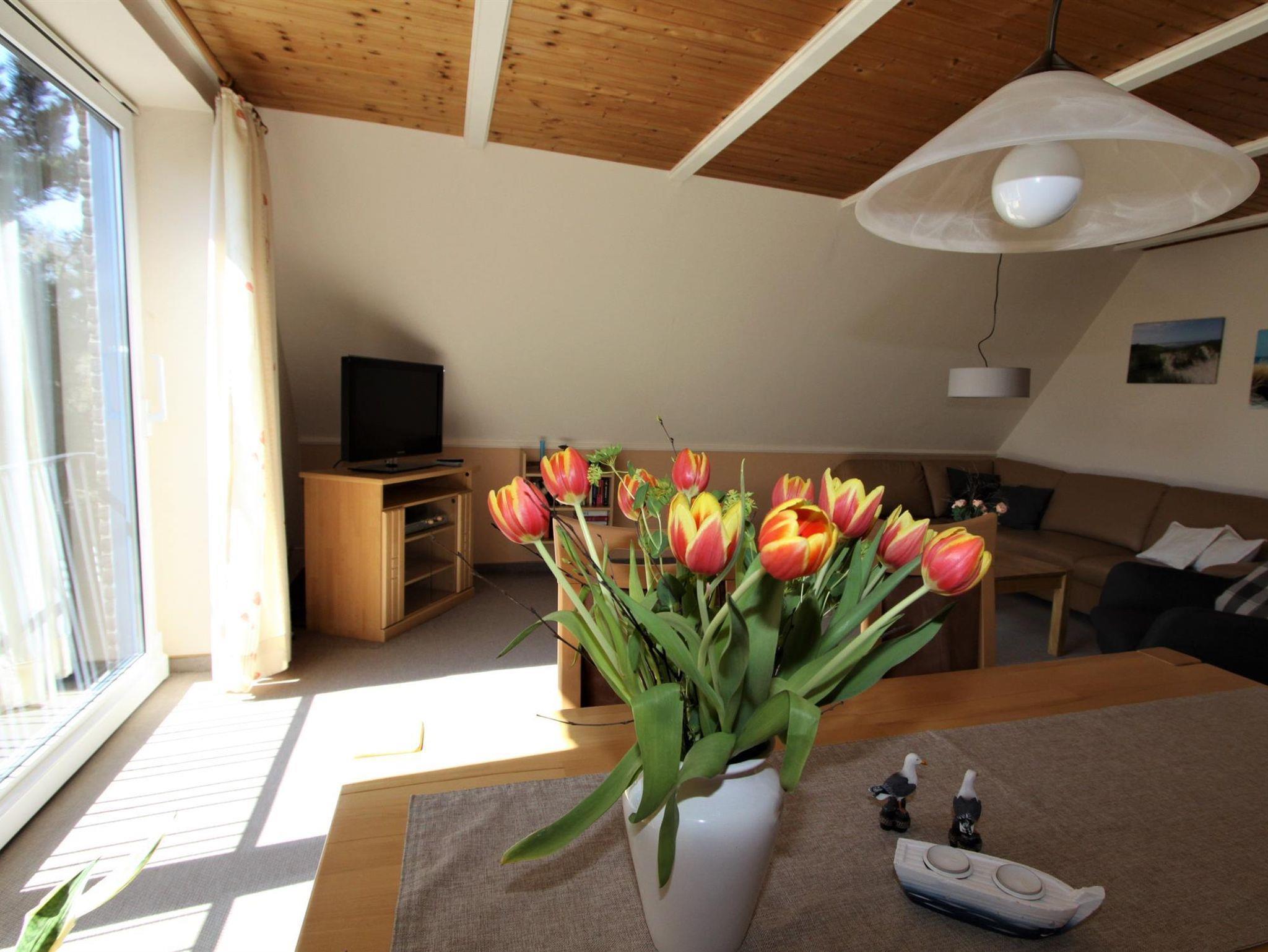 Rustikal, aber gemütlich erwartet Sie im Obergeschoß des Hauses Ebbe das Wohnzimmer mit Essplatz, Garnitur, Liegesessel, SAT Flachbildschirm, DVD-Player und Hifi Anlage. Ein französischer Balkon mit großer Schiebetür lässt die frische Nordseebrise hereinwehen.
