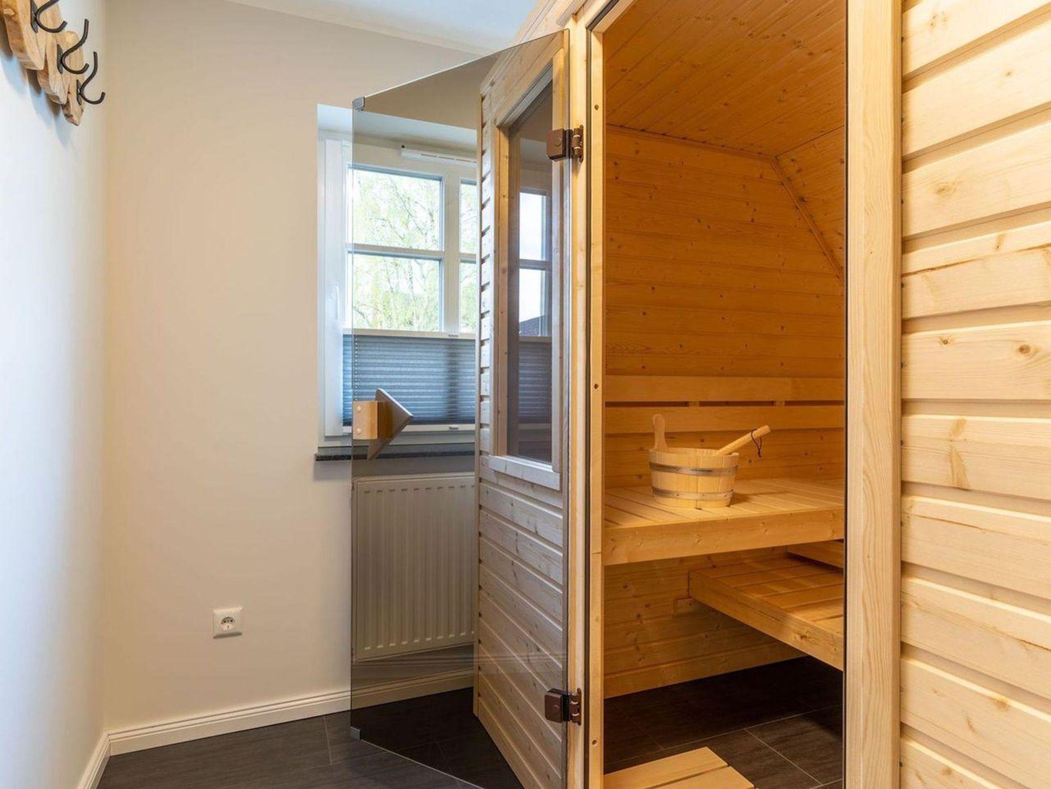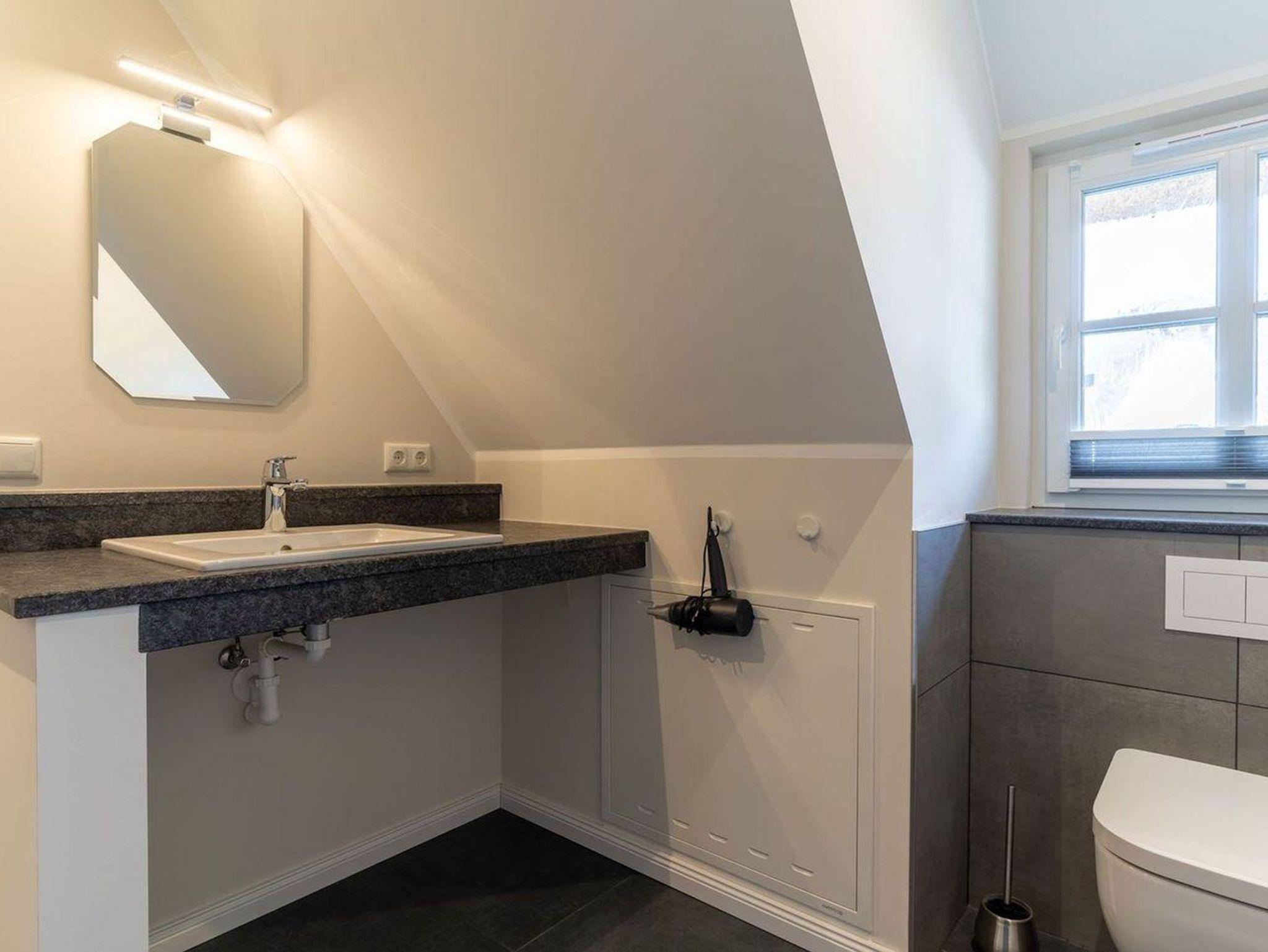 Das luxuriöse Reetdachhaus-Hälfte ist ca. 140 m² groß und bietet Platz für 6 Personen.Im Erdgeschoss befindet sich der lichtdurchflutete Wohnraum mit TV, Kamin, einer offenen Küche sowie einem stilvollen Essbereich.Die Küche ist ausgestattet mit Backofen und Geschirrspüler, sowie einem Esperto-Caffè-Automat, Toaster, Wasserkocher und den üblichen Küchenutensilien.An den Wohnbereich schließen sich ein Flur, ein Duschbad und ein Doppelschlafzimmer an.Das Erdgeschoss ist rollstuhlfreundlich.Über eine Holztreppe gelangt man in das Obergeschoss. Die beiden Schlafzimmer - jeweils mit einem Doppelbett - sorgen für ruhevolle Erholung.Im ersten Stock befindet sich ausserdem ein weiteres Duschbad sowie eine Sauna.