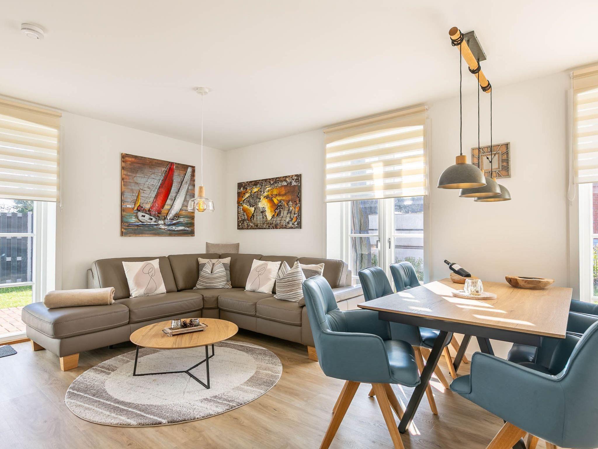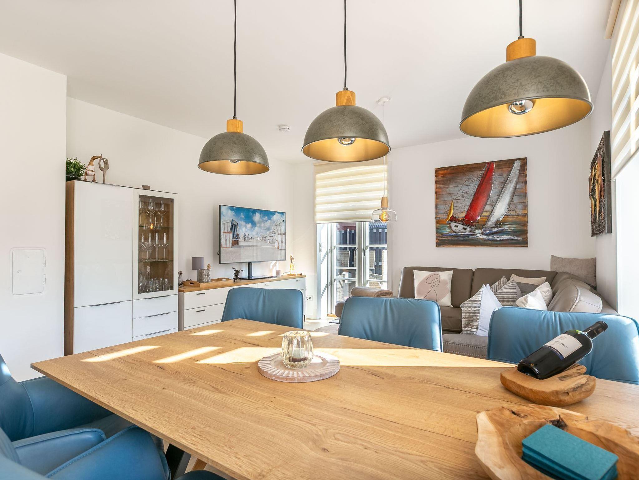 Wohnzimmer mit Lederecksofa, großem SMART-TV (Waipu), Esstisch mit 6 Stühlen und Austritten zu den Ost- und Süd-Terrassen und zum Garten.