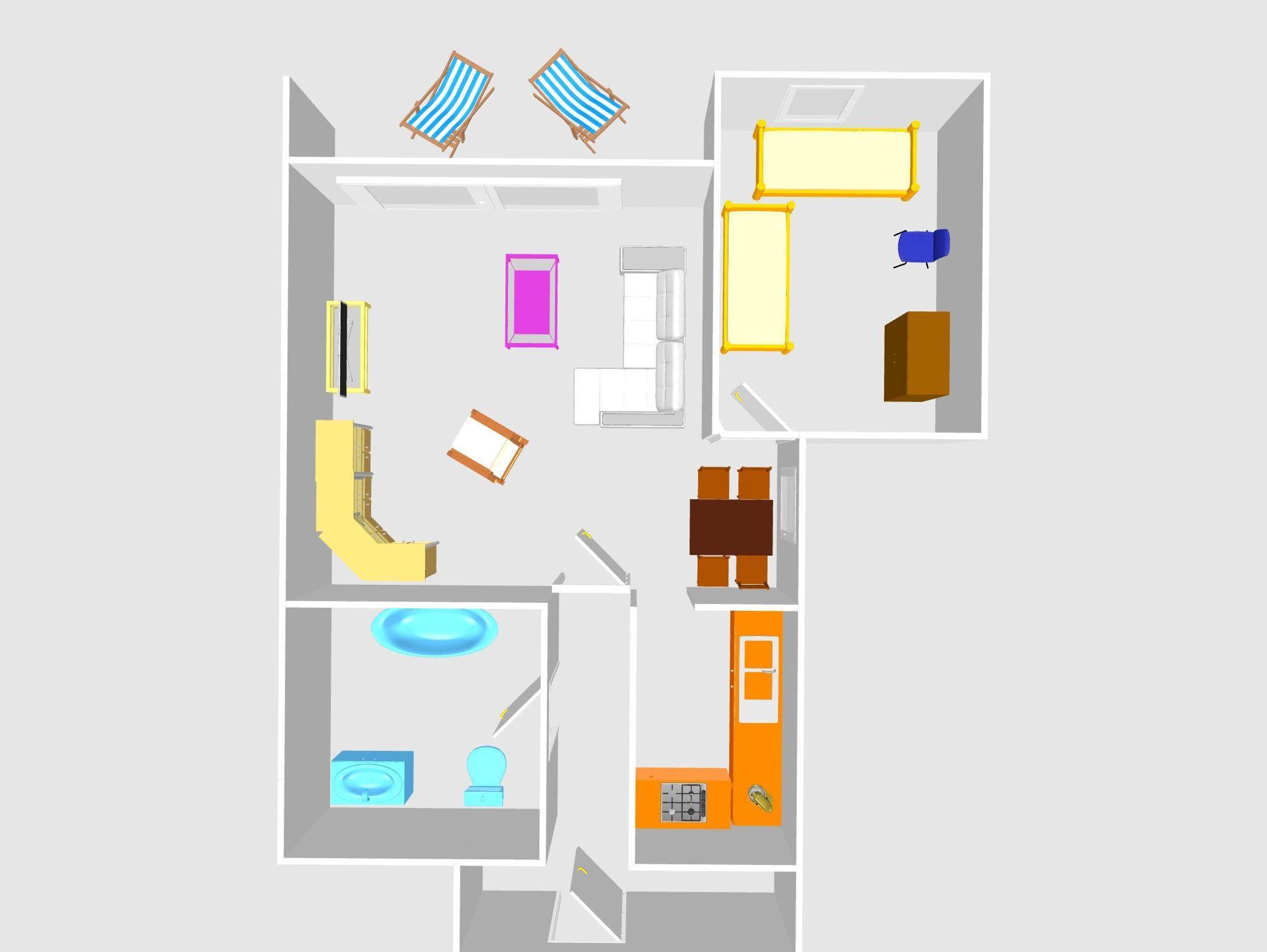 Wohn-Schlafraum mit 2 Wandklappbetten. TV. Schlafraum mit 2 Einzelbetten. Laminatfußböden. Kochnische mit 4-Platten-Herd. Wannenbad/WC. Diese Wohnung befindet sich im Erdgeschoß mit möblierter Terrasse. Internetanschluss.